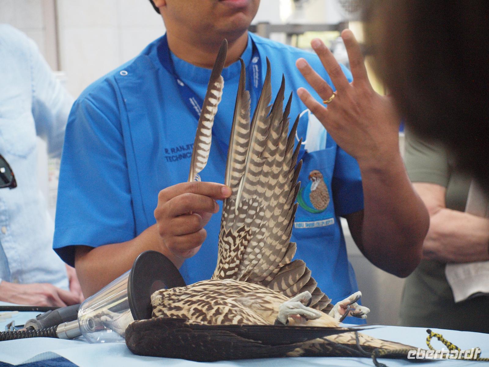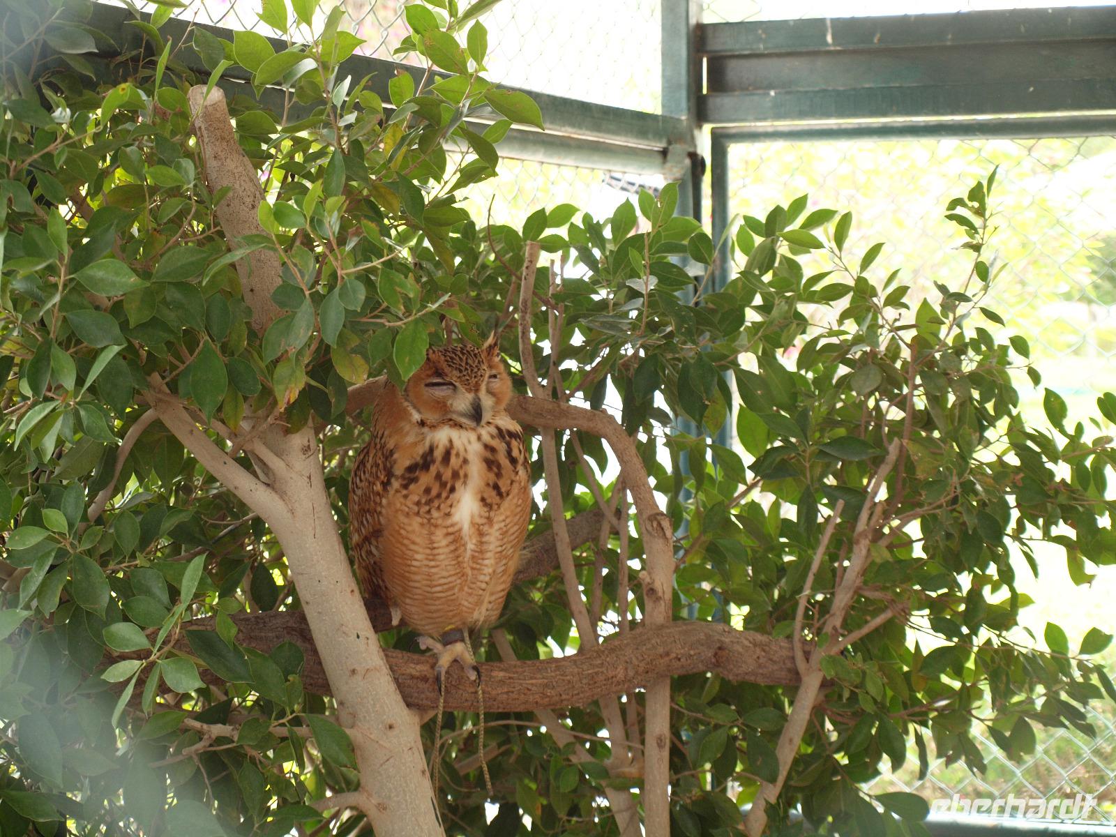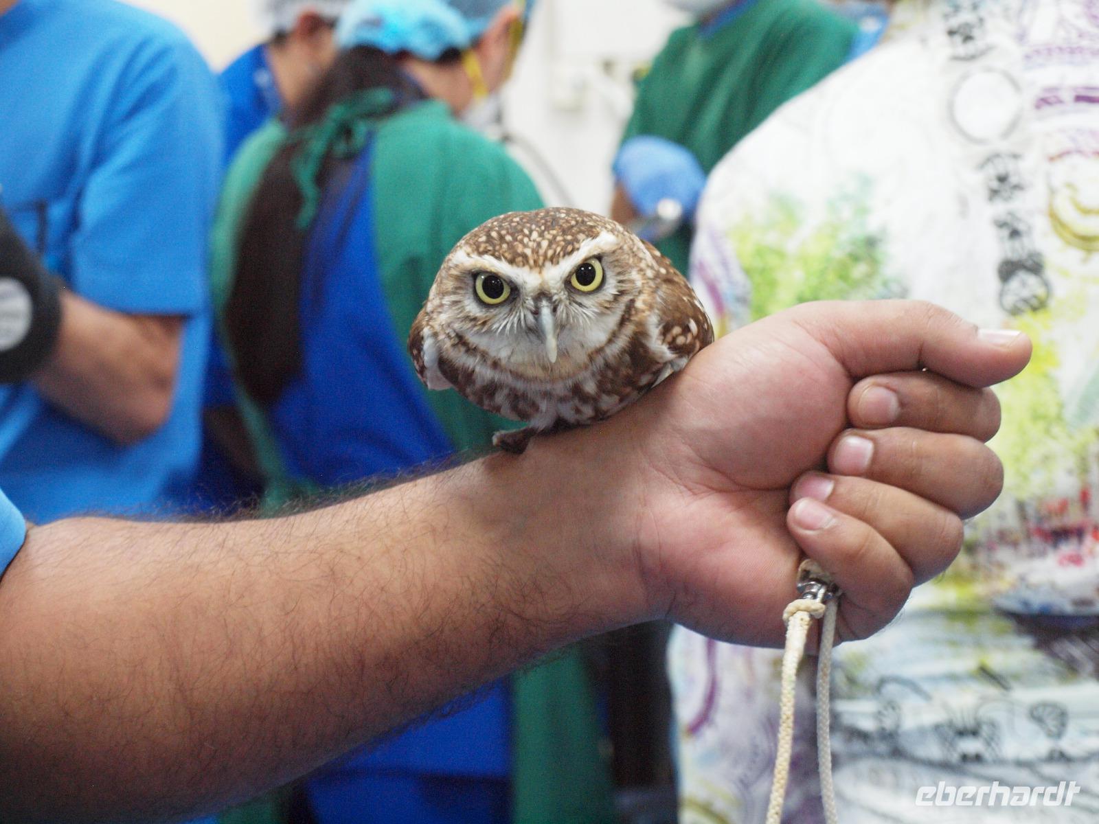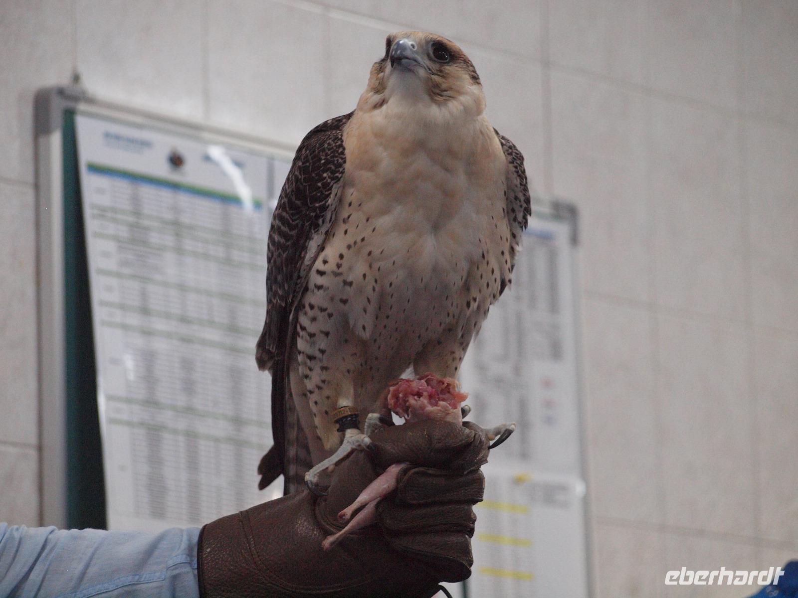 Seit 1999 werden in der Falkenklinik Falken die sich bei der Jagd oder beim notwendigen täglichen Training verletzt haben behandelt und gesund gepflegt. Ungewöhnlich für ein Tierkrankenhaus: Die Klinik ist äußerst luxuriös, die Käfige groß und alle Gebäude sind mit edlen Hölzern verkleidet. Wir erkennen sofort, welchen Status die Tiere in dem Wüstenstaat inne haben. Wir werden zu erst in eine Art Ausstellungsraum gebeten. Hier werden die Grundfakten über die Falken erklärt, wie viele Arten es gibt, welche Phasen sie durchleben und wie man Sie am Ende für die Hilfe zum Überleben nutzen konnte. Die Führung geht weiter in den Behandlungsraum, hier fallen uns zu erst die Falken auf, die brav und ruhig im sogenannten "Wartezimmer" sitzen und auf ihre Behandlung warten. Die Tiere die wir hier sehen sind Tagespatienten und werden am Ende des Tages von ihren Besitzern wieder abgeholt. Zur Demonstration wird ein Falke für uns in Narkose gelegt und man erklärt uns wie den Tieren geholfen werden kann, wenn sie zum Beispiel eine gebrochene Feder haben. Zum Schluss der Behandlung, wenn der Falke wieder bei Bewusstsein ist, dürfen wir ihn sogar abwechselnd halten, faszinierend diese edlen Tiere. Nach einer Weile ist es etwas unruhig im Behandlungszimmer... schnell wissen wir auch warum. Die Direktorin selbst, Frau Dr. Müller, ist mit einigen Gästen ebenfalls unterwegs und unternimmt eine kleine Führung durch ihr Krankenhaus. Unsere Tour geht nach der Raubtierfütterung auch weiter und wir sehen noch einen Operationsraum von außen und den Raum in dem all die Auszeichnungen ausgestellt sind, die das Krankenhaus im Laufe der Jahre erhalten hat. Das Krankenhaus selbst dient aber auch als Tierheim. So gibt es hier zum Beispiel ein paar Eulen, die sich in der Natur verletzt haben und nie überleben würden in freier Wildbahn. Also bleiben sie wohlbehütet in der Klinik. Zum Ende der Führung werden wir noch in ein Haus gebracht in dem die Falken fliegen und und sich in Ruhe mausern können. Außerdem gibt es noch einen weiteren Ausstellungsraum zu sehen. Hier sind die Beutetiere und die Geschichte der Freundschaft zwischen Mensch und Falke nocheinmal zu sehen, in diesem Fall vor allem die Freundschaft zwischen dem Scheich und seinem Falken.