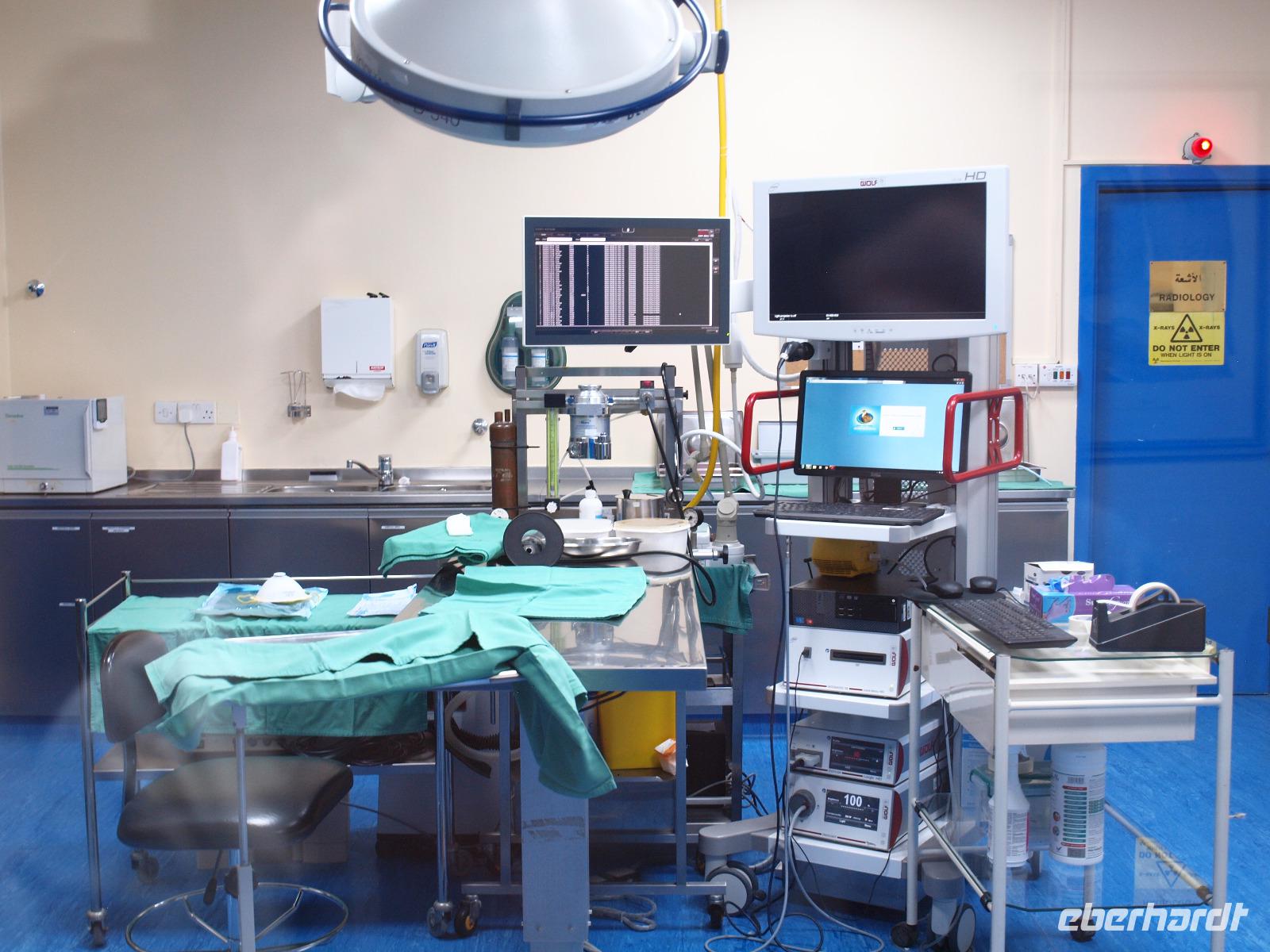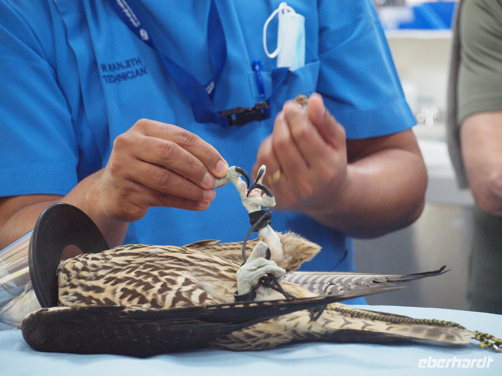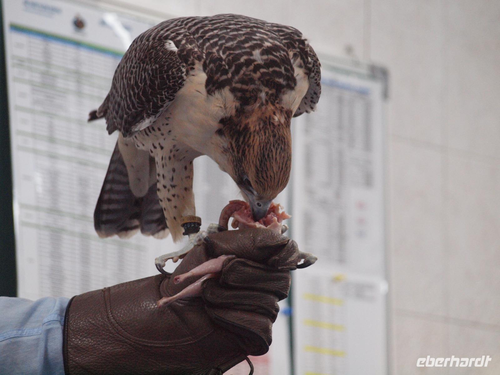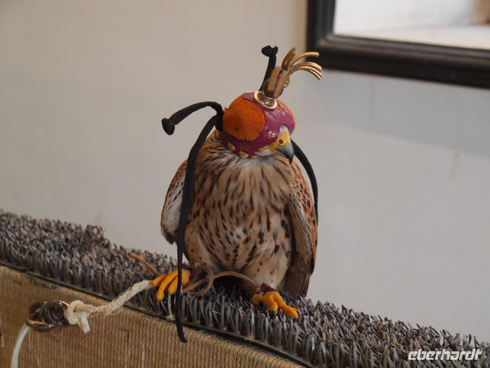 Seit 1999 werden in der Falkenklinik Falken die sich bei der Jagd oder beim notwendigen täglichen Training verletzt haben behandelt und gesund gepflegt. Ungewöhnlich für ein Tierkrankenhaus: Die Klinik ist äußerst luxuriös, die Käfige groß und alle Gebäude sind mit edlen Hölzern verkleidet. Wir erkennen sofort, welchen Status die Tiere in dem Wüstenstaat inne haben. Wir werden zu erst in eine Art Ausstellungsraum gebeten. Hier werden die Grundfakten über die Falken erklärt, wie viele Arten es gibt, welche Phasen sie durchleben und wie man Sie am Ende für die Hilfe zum Überleben nutzen konnte. Die Führung geht weiter in den Behandlungsraum, hier fallen uns zu erst die Falken auf, die brav und ruhig im sogenannten "Wartezimmer" sitzen und auf ihre Behandlung warten. Die Tiere die wir hier sehen sind Tagespatienten und werden am Ende des Tages von ihren Besitzern wieder abgeholt. Zur Demonstration wird ein Falke für uns in Narkose gelegt und man erklärt uns wie den Tieren geholfen werden kann, wenn sie zum Beispiel eine gebrochene Feder haben. Zum Schluss der Behandlung, wenn der Falke wieder bei Bewusstsein ist, dürfen wir ihn sogar abwechselnd halten, faszinierend diese edlen Tiere. Nach einer Weile ist es etwas unruhig im Behandlungszimmer... schnell wissen wir auch warum. Die Direktorin selbst, Frau Dr. Müller, ist mit einigen Gästen ebenfalls unterwegs und unternimmt eine kleine Führung durch ihr Krankenhaus. Unsere Tour geht nach der Raubtierfütterung auch weiter und wir sehen noch einen Operationsraum von außen und den Raum in dem all die Auszeichnungen ausgestellt sind, die das Krankenhaus im Laufe der Jahre erhalten hat. Das Krankenhaus selbst dient aber auch als Tierheim. So gibt es hier zum Beispiel ein paar Eulen, die sich in der Natur verletzt haben und nie überleben würden in freier Wildbahn. Also bleiben sie wohlbehütet in der Klinik. Zum Ende der Führung werden wir noch in ein Haus gebracht in dem die Falken fliegen und und sich in Ruhe mausern können. Außerdem gibt es noch einen weiteren Ausstellungsraum zu sehen. Hier sind die Beutetiere und die Geschichte der Freundschaft zwischen Mensch und Falke nocheinmal zu sehen, in diesem Fall vor allem die Freundschaft zwischen dem Scheich und seinem Falken.