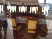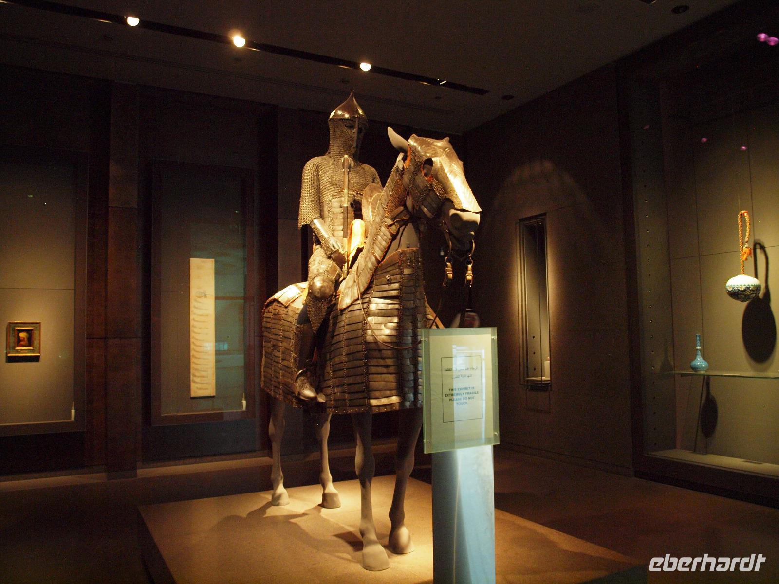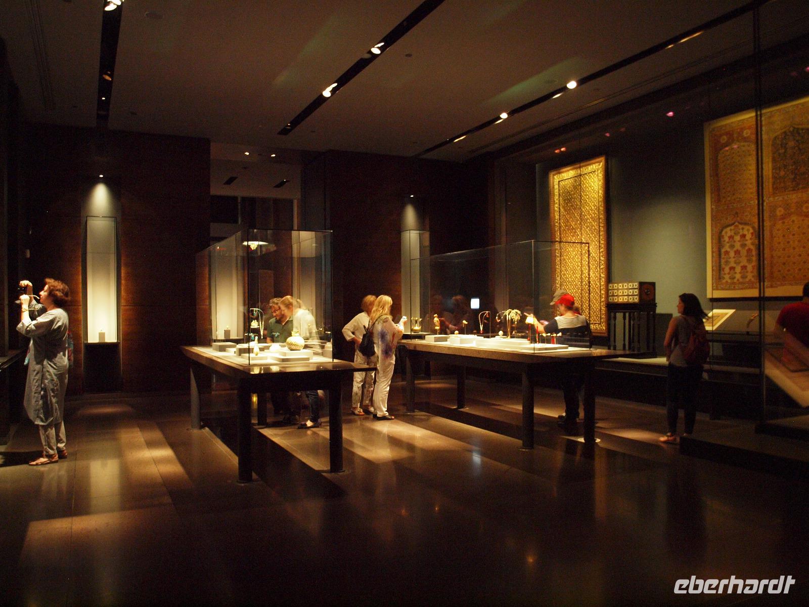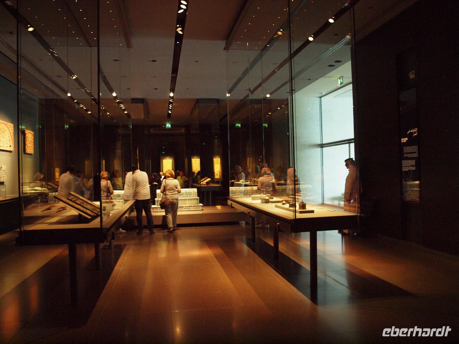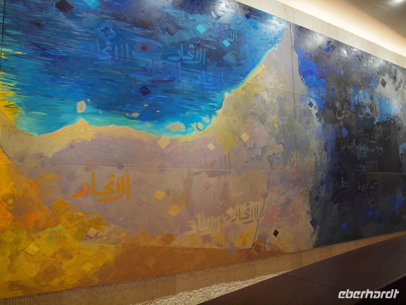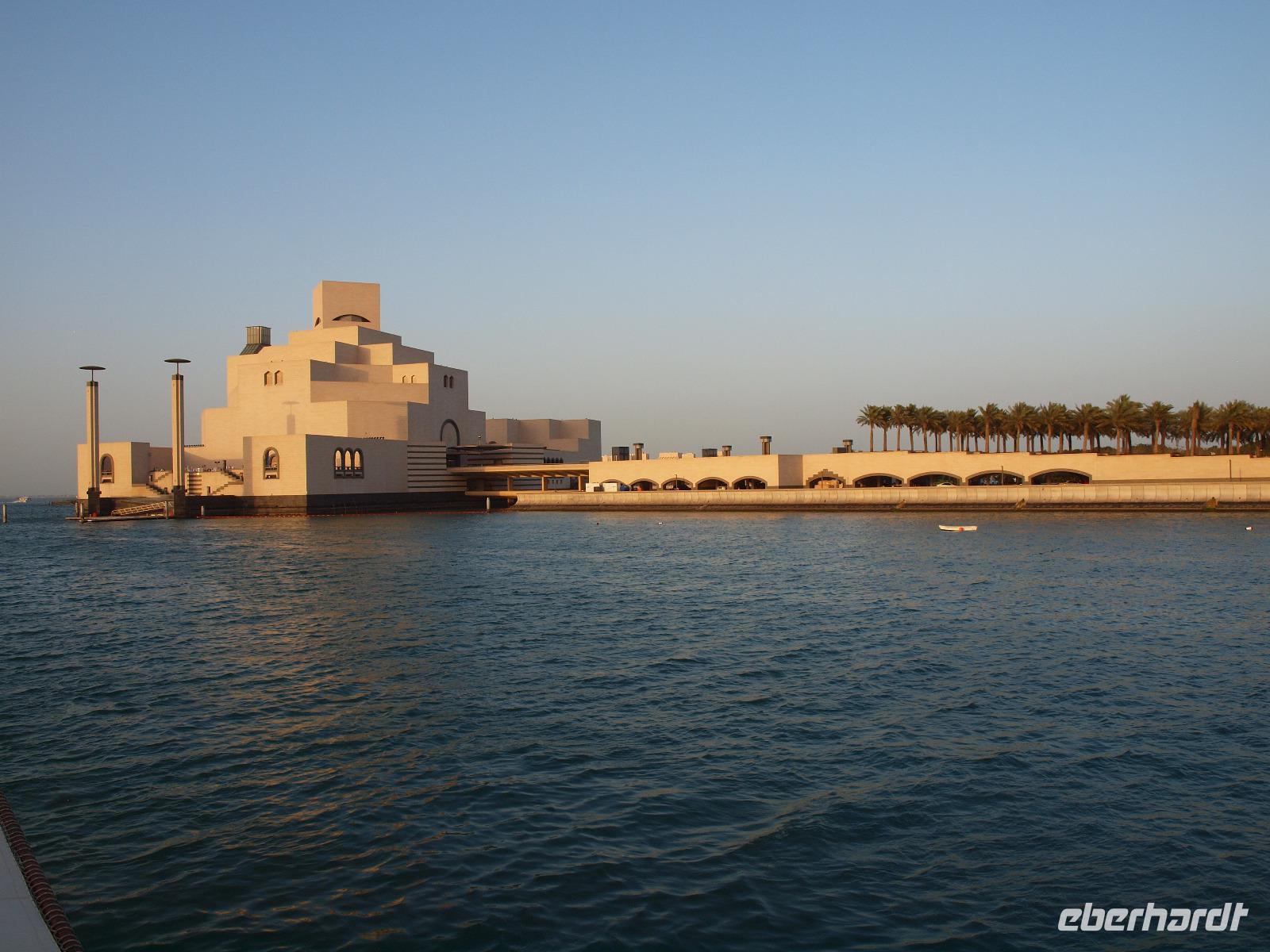 Wieder draußen, können wir nun auch tatsächlich auf die Aussichtsplattform des Torch Tower Hotels fahren. Von hier oben hat man den besten Blick auf das neue Stadion und die umliegende Umgebung. Es wird nun Zeit zurück nach Doha zu fahren, ein letzter Stopp, bevor wir zum Flughafen müssen, ist das Museum für Islamische Kunst. Ayman begleitet uns natürlich und führt uns durch die einzelnen Ausstellungsräume und erklärt uns immer, was in welchem Raum zu sehen ist. Von hier haben wir auch noch einmal einen tollen Blick auf die Skyline von Doha und können uns so nun auf den kommenden Flug einstellen. Wir fliegen von Doha nach Abu Dhabi etwa eine Stunde. In Abu Dhabi angekommen, werden wir von unserem Chauffeur in Empfang genommen und er bringt uns zum Hotel. Nach dem Check-In treffen wir uns dann wenig später im Hotelrestaurant zum gemeinsamen Abendessen und lassen den Abend gemütlich ausklingen.