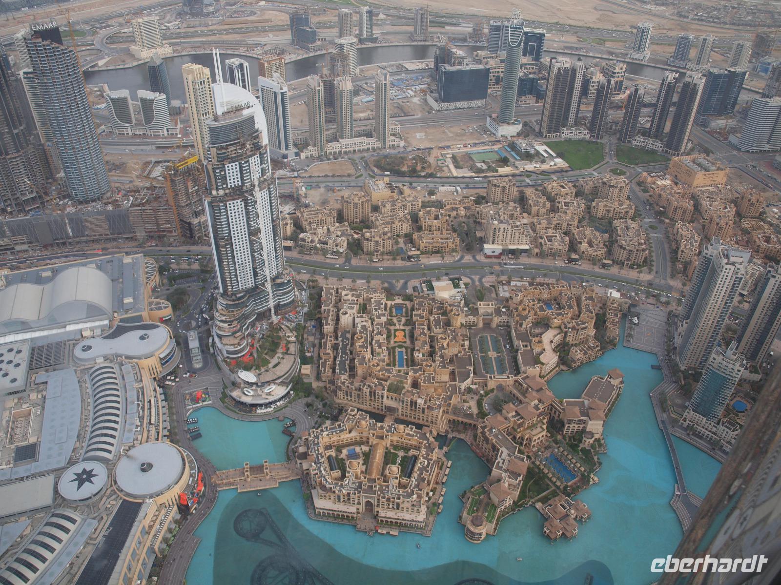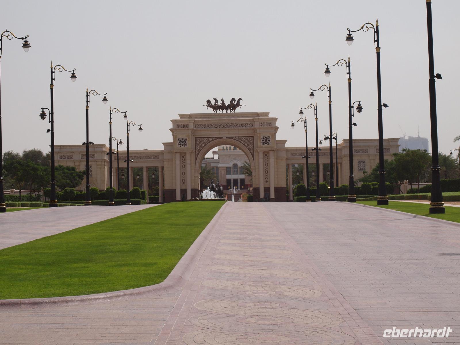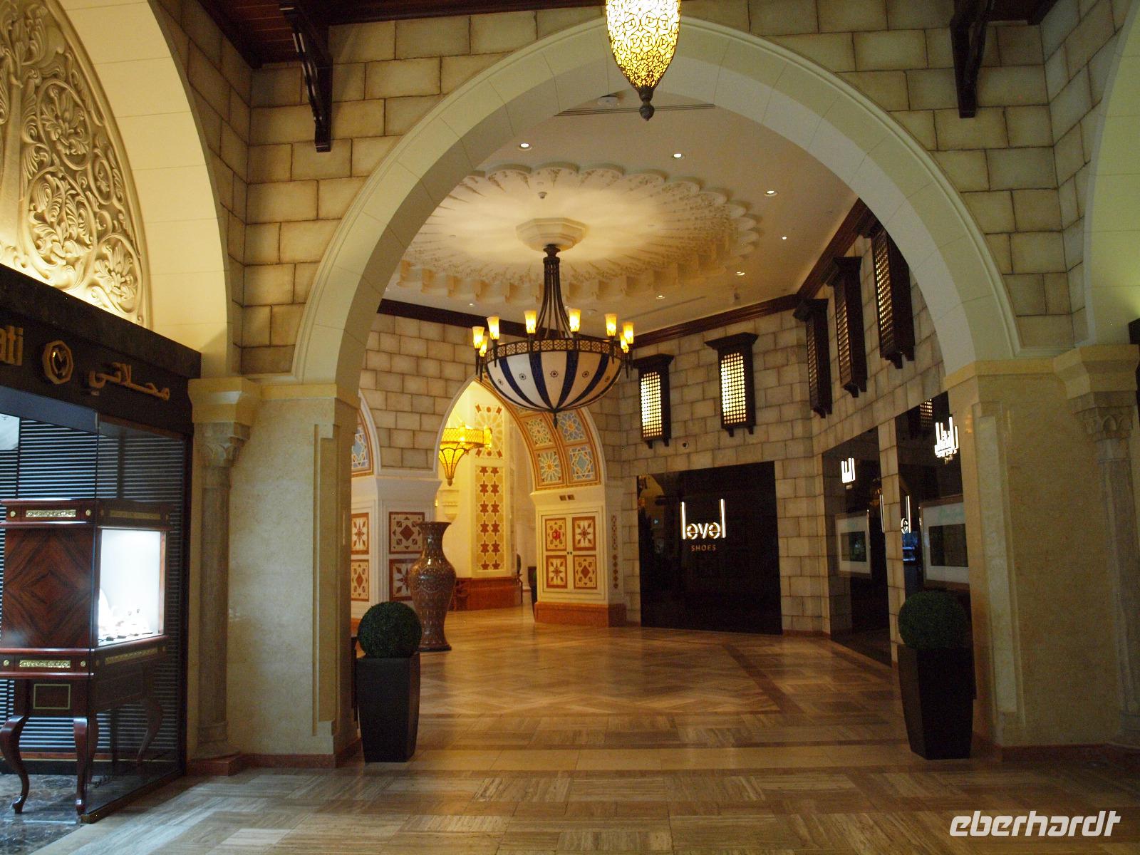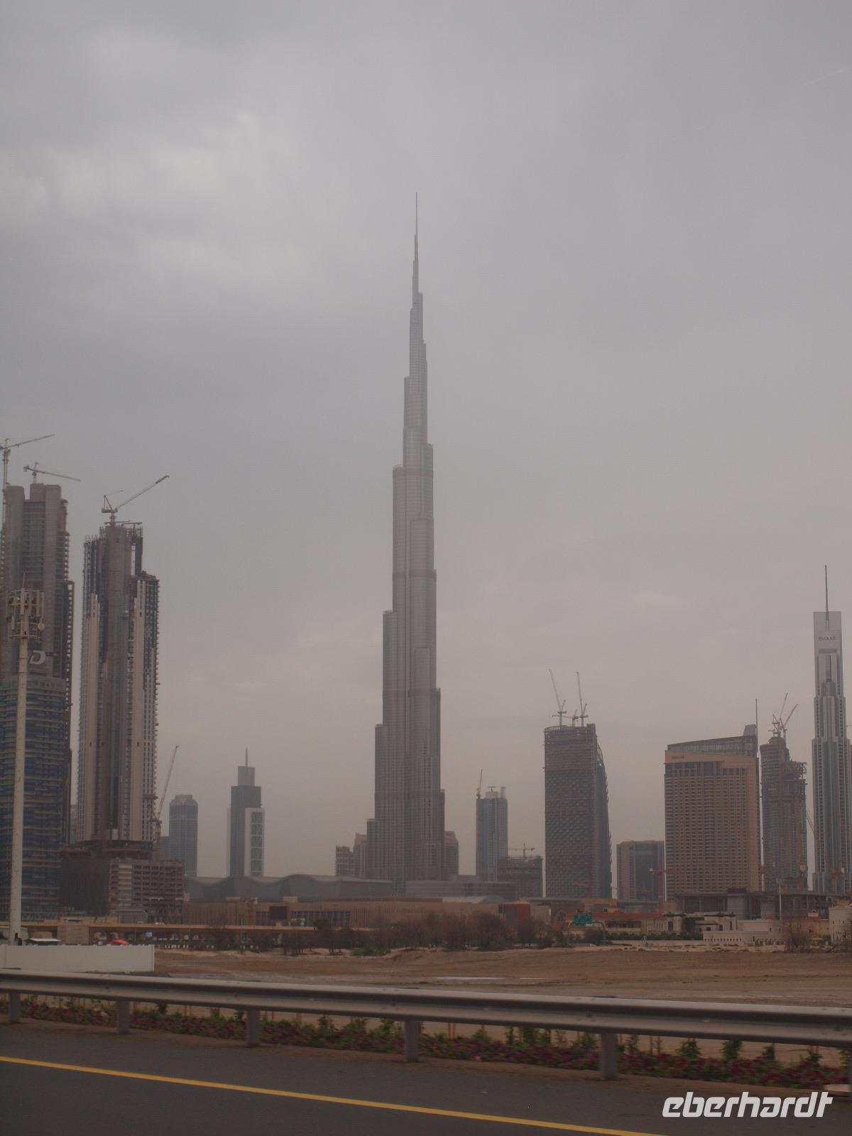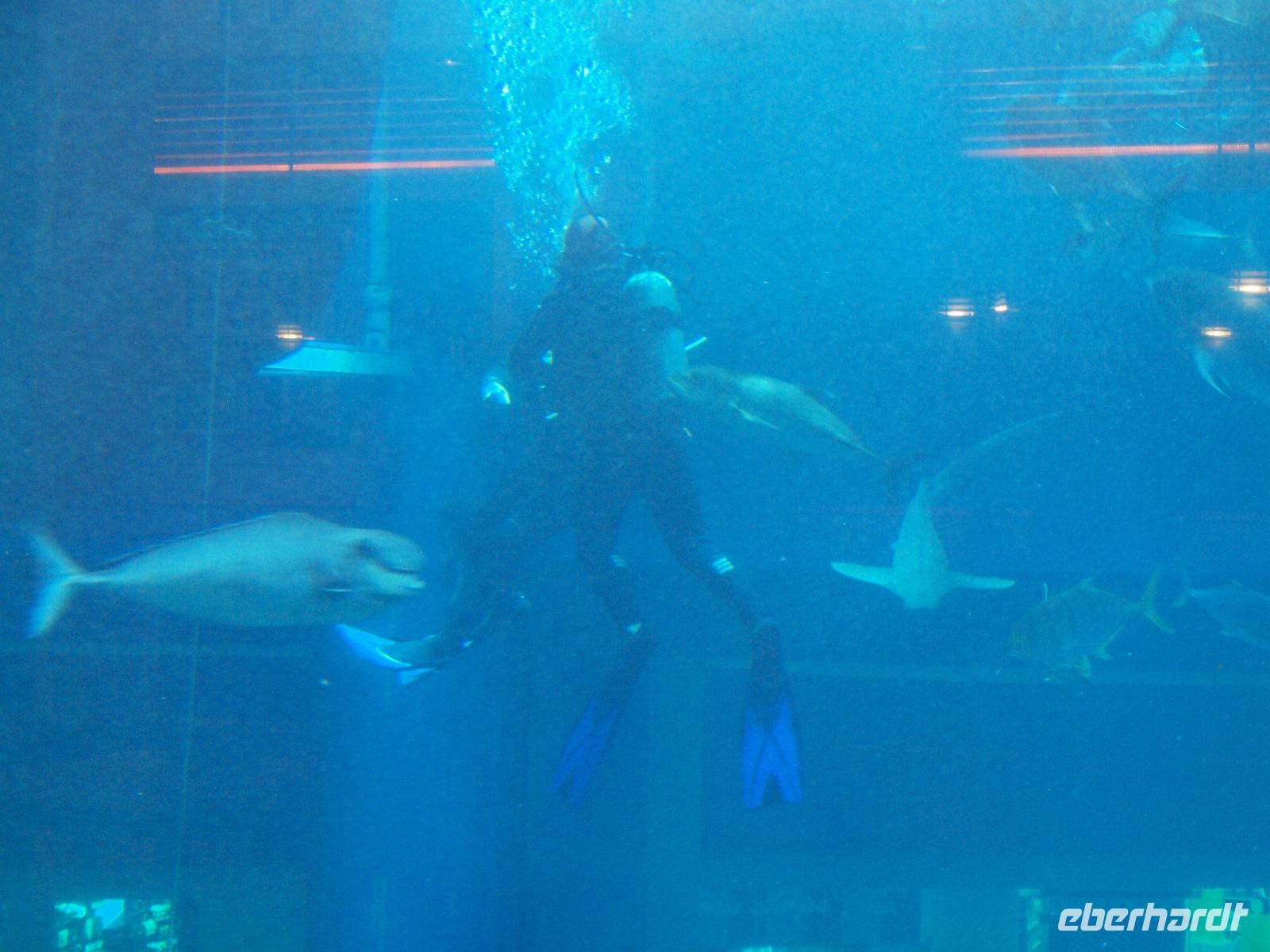 Heute stehen viele Dinge auf unserer Tagesliste. Wir beginnen den sonnigen(!) Tag in der Dubai Marina und schlendern etwas entlang des künstlich angelegten Hafenbeckens. Von hier aus bringt uns Hassan auf die Palme ;-) "The Palm", so heißt die künstlich aufgeschüttete Inselwelt und sieht, aus der Luft betrachtet, wirklich wie eine Palme aus. Unser Ziel ist die Palmenkrone, hier steht das 5*-Hotel "Atlantis" und ist von vielen Attraktionen, wie ein eigenes Aqarium und ein Wassererlebnispark, umgeben. Nach einem Bummel durch die öffentlichen Bereiche fahren wir mit der Monorail, einem vollautomatischen Zug, wieder zurück zum Palmenstamm und begeben uns zu unserem nächsten Ziel. Die Mall of the Emirates ist ein Kaufhaus, was man so schnell nicht wieder vergisst. Hauptattraktion ist hier die Ski-Anlage, auf einer schneebedeckten Fläche von gut 22.000 m² gibt es fünf Abfahrten, die sich in Schwierigkeitsgrad, Höhe und Steilheit unterscheiden. Ein Vierer-Sessel-Lift, ein Schlepplift und ein Personenförderband wurde für die Beförderung der Besucher installiert. Für Kinder und Eltern ist der so genannte Snow Park vorgesehen, hier findet man Schlitten- und Bob-Bahnen. Es ist der größte Indoor-Snowpark der Welt. Auf dem Weg zur nächsten Mall, der Dubai Mall, statten wir dem Scheich einen Besuch ab, zumindest bis fast vor die Haustür schaffen wir es und der ein oder andere Pfau freut sich darüber ein willkommenes Fotomotiv zu sein. Etwas später dann in der Dubai Mall schauen wir erst am Innen-Aquarium vorbei. Sogar der ein oder andere Taucher ist im großen Becken zu erkennen. Obwohl so viele Menschen in dieser Mall sind, strahlt sie eine gewissen Ruhe aus. Anja führt uns in die verschiednen "Viertel" der Mall, es gibt hier wohl über 120 Gastronomiebetriebe, den größten Gold-Souk der Welt mit 220 Geschäften, eine Kunsteisbahn, einen musikgesteuerten Springbrunnen, eine 24 Meter hohe Wasserkaskade, einen Saal für Modenschauen, ein Multiplex-Kino mit 22 Sälen, ein Präsentationszentrum für Computerspiele, sowie über ein betreutes Kinder-Abenteuerland... Wir sehen natürlich nicht alles, aber immerhin einen Großteil der WOW-verdächtigen Einrichtungen. Wir gehen kurz aus der Mall hinaus um einen groben Überblick zu bekommen wo wir uns eigentlich befinden. Kaum an der frischen Luft, sehen wir ihn, wie er sich vor uns aufbaut, der Burj Khalifa, der aktuell höchste Turm der Welt. Es ist nun Zeit für ein paar individuelle Erkundungen. Zurück am Treffpunkt gehen wir gemeinsam zum Eingang des Turms und fahren hoch, auf 452 Meter, 124. Stockwerk, auf die Aussichtsplattform, dieses Stockwerk bietet einen 360°-Panoramablick rund um Dubai. Bei guter Sicht hätte man vielleicht sogar die Dubai Marina sehen können. Wieder zurück auf dem Erdboden ist es fast schon 18:00 Uhr. Genau richtig also um das erste Wasserspiel mitzuerleben. Von der Terrasse von unserem Restaurant aus haben wir den perfekten Platz und können die Wasserspiele richtig genießen. Je später der Abend, desto dunkler wird es ja und umso schöner sind sie anzusehen. Alles um uns herum funkelt! Nach dem Essen gehen wir noch eine kleine Runde um den kleinen angelegten See der Springbrunnen und fahren schließlich zurück ins Hotel.