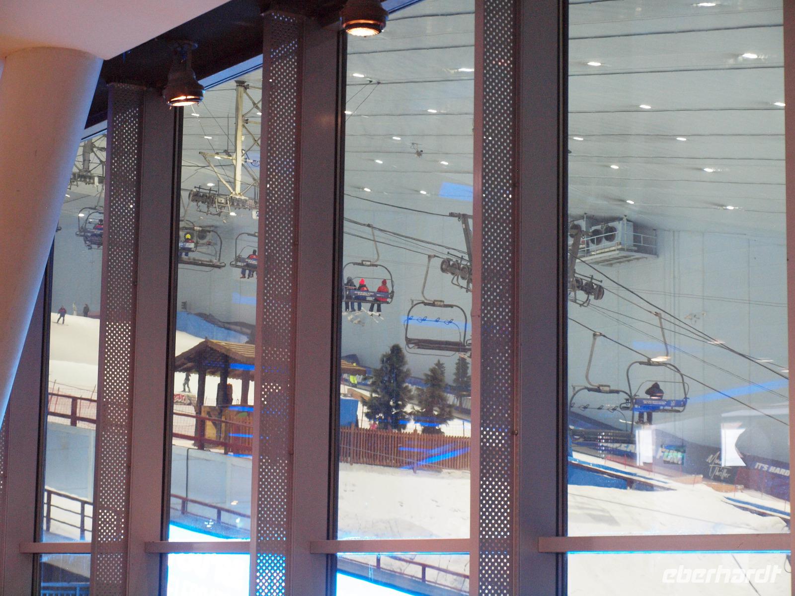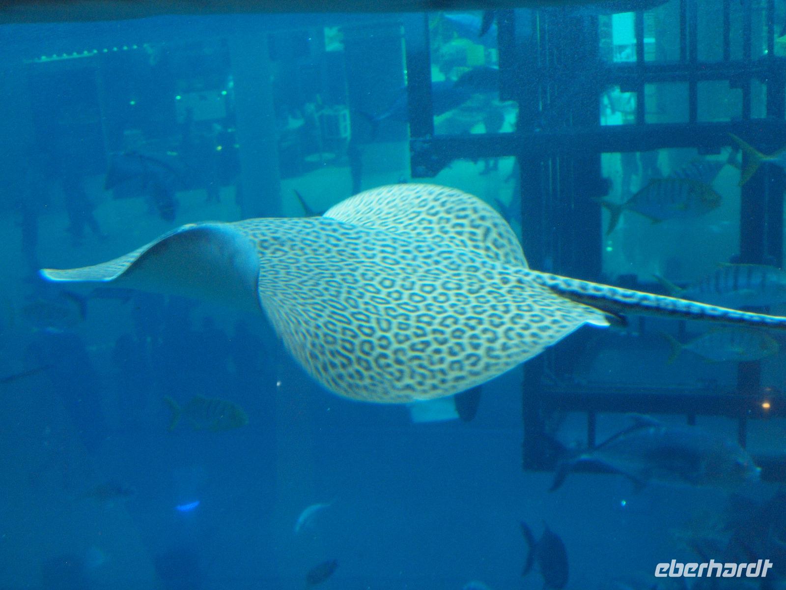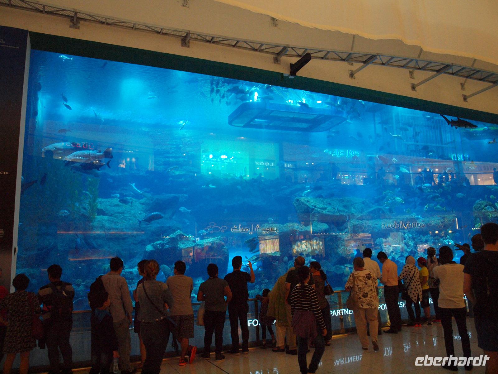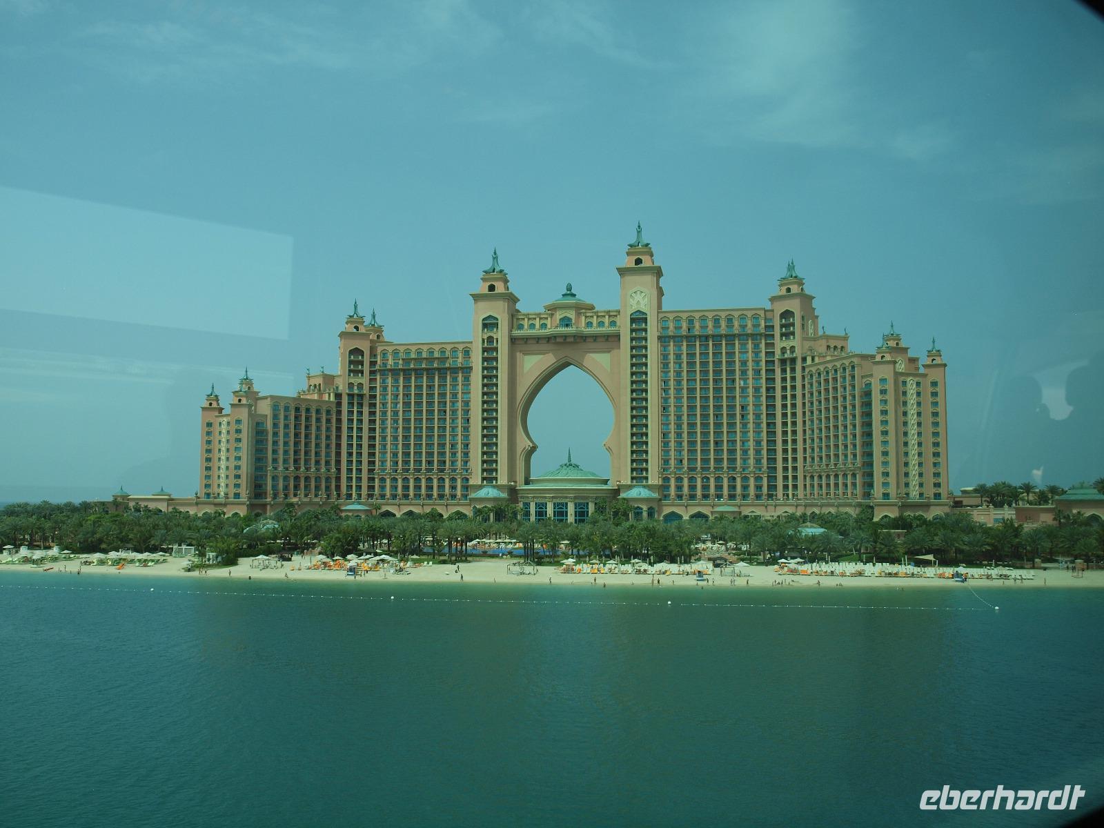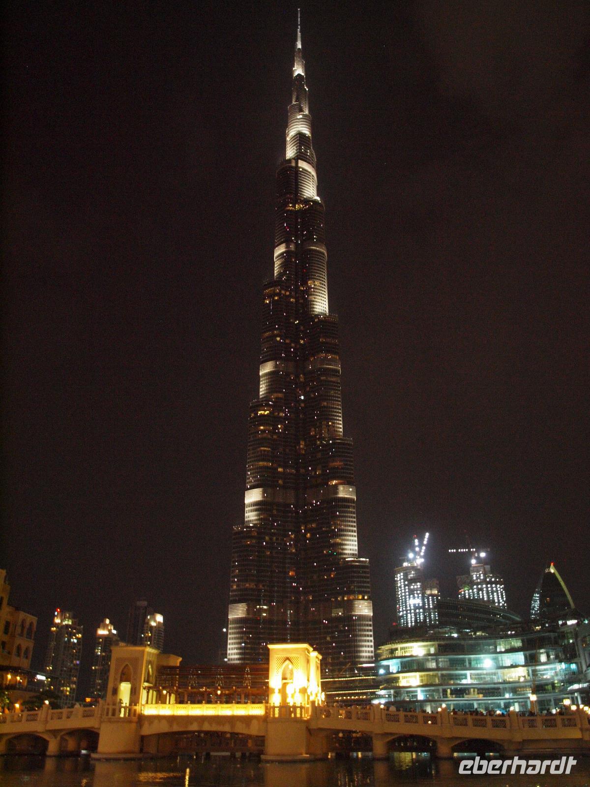 Heute stehen viele Dinge auf unserer Tagesliste. Wir beginnen den sonnigen(!) Tag in der Dubai Marina und schlendern etwas entlang des künstlich angelegten Hafenbeckens. Von hier aus bringt uns Hassan auf die Palme ;-) "The Palm", so heißt die künstlich aufgeschüttete Inselwelt und sieht, aus der Luft betrachtet, wirklich wie eine Palme aus. Unser Ziel ist die Palmenkrone, hier steht das 5*-Hotel "Atlantis" und ist von vielen Attraktionen, wie ein eigenes Aqarium und ein Wassererlebnispark, umgeben. Nach einem Bummel durch die öffentlichen Bereiche fahren wir mit der Monorail, einem vollautomatischen Zug, wieder zurück zum Palmenstamm und begeben uns zu unserem nächsten Ziel. Die Mall of the Emirates ist ein Kaufhaus, was man so schnell nicht wieder vergisst. Hauptattraktion ist hier die Ski-Anlage, auf einer schneebedeckten Fläche von gut 22.000 m² gibt es fünf Abfahrten, die sich in Schwierigkeitsgrad, Höhe und Steilheit unterscheiden. Ein Vierer-Sessel-Lift, ein Schlepplift und ein Personenförderband wurde für die Beförderung der Besucher installiert. Für Kinder und Eltern ist der so genannte Snow Park vorgesehen, hier findet man Schlitten- und Bob-Bahnen. Es ist der größte Indoor-Snowpark der Welt. Auf dem Weg zur nächsten Mall, der Dubai Mall, statten wir dem Scheich einen Besuch ab, zumindest bis fast vor die Haustür schaffen wir es und der ein oder andere Pfau freut sich darüber ein willkommenes Fotomotiv zu sein. Etwas später dann in der Dubai Mall schauen wir erst am Innen-Aquarium vorbei. Sogar der ein oder andere Taucher ist im großen Becken zu erkennen. Obwohl so viele Menschen in dieser Mall sind, strahlt sie eine gewissen Ruhe aus. Anja führt uns in die verschiednen "Viertel" der Mall, es gibt hier wohl über 120 Gastronomiebetriebe, den größten Gold-Souk der Welt mit 220 Geschäften, eine Kunsteisbahn, einen musikgesteuerten Springbrunnen, eine 24 Meter hohe Wasserkaskade, einen Saal für Modenschauen, ein Multiplex-Kino mit 22 Sälen, ein Präsentationszentrum für Computerspiele, sowie über ein betreutes Kinder-Abenteuerland... Wir sehen natürlich nicht alles, aber immerhin einen Großteil der WOW-verdächtigen Einrichtungen. Wir gehen kurz aus der Mall hinaus um einen groben Überblick zu bekommen wo wir uns eigentlich befinden. Kaum an der frischen Luft, sehen wir ihn, wie er sich vor uns aufbaut, der Burj Khalifa, der aktuell höchste Turm der Welt. Es ist nun Zeit für ein paar individuelle Erkundungen. Zurück am Treffpunkt gehen wir gemeinsam zum Eingang des Turms und fahren hoch, auf 452 Meter, 124. Stockwerk, auf die Aussichtsplattform, dieses Stockwerk bietet einen 360°-Panoramablick rund um Dubai. Bei guter Sicht hätte man vielleicht sogar die Dubai Marina sehen können. Wieder zurück auf dem Erdboden ist es fast schon 18:00 Uhr. Genau richtig also um das erste Wasserspiel mitzuerleben. Von der Terrasse von unserem Restaurant aus haben wir den perfekten Platz und können die Wasserspiele richtig genießen. Je später der Abend, desto dunkler wird es ja und umso schöner sind sie anzusehen. Alles um uns herum funkelt! Nach dem Essen gehen wir noch eine kleine Runde um den kleinen angelegten See der Springbrunnen und fahren schließlich zurück ins Hotel.