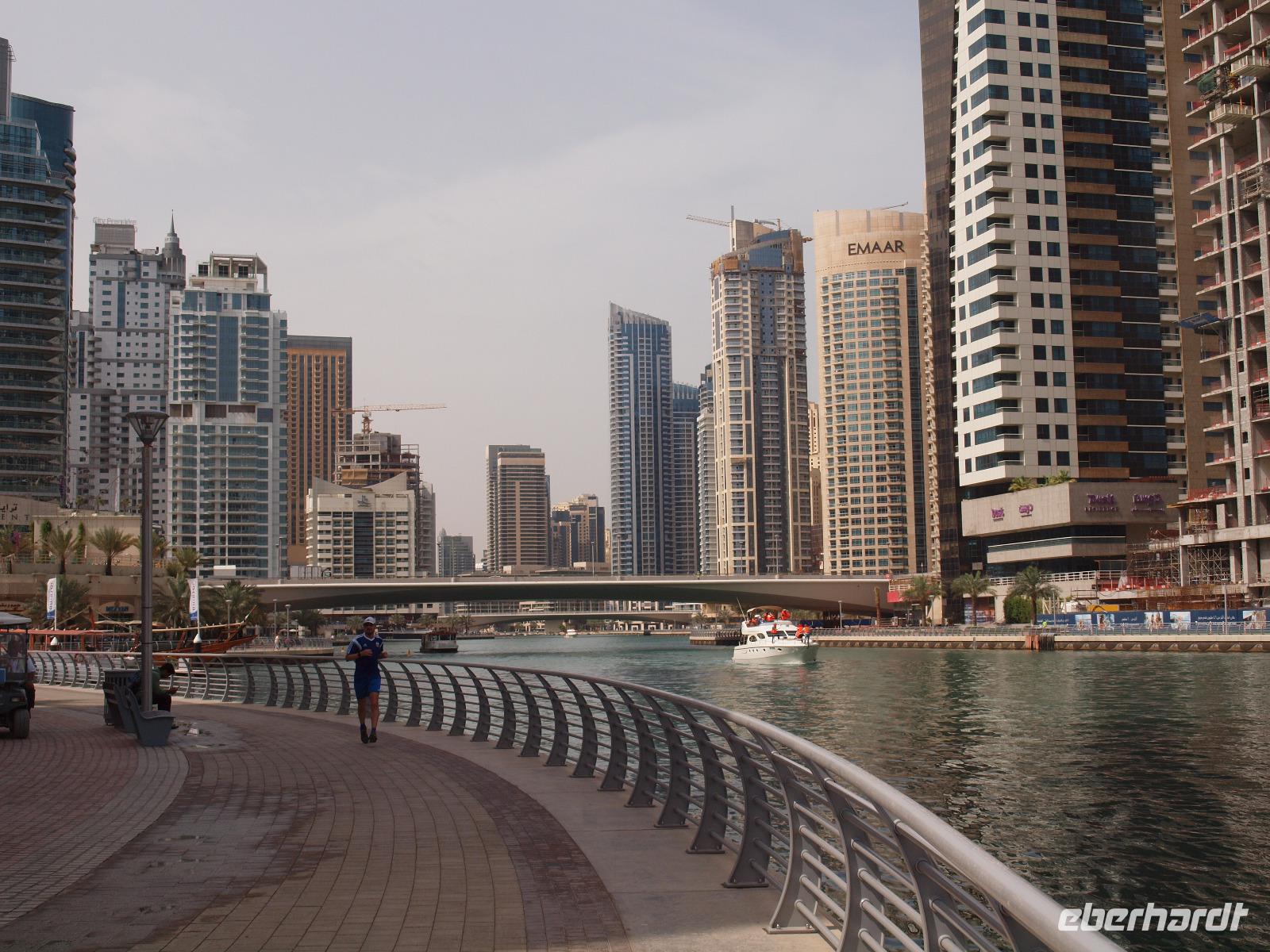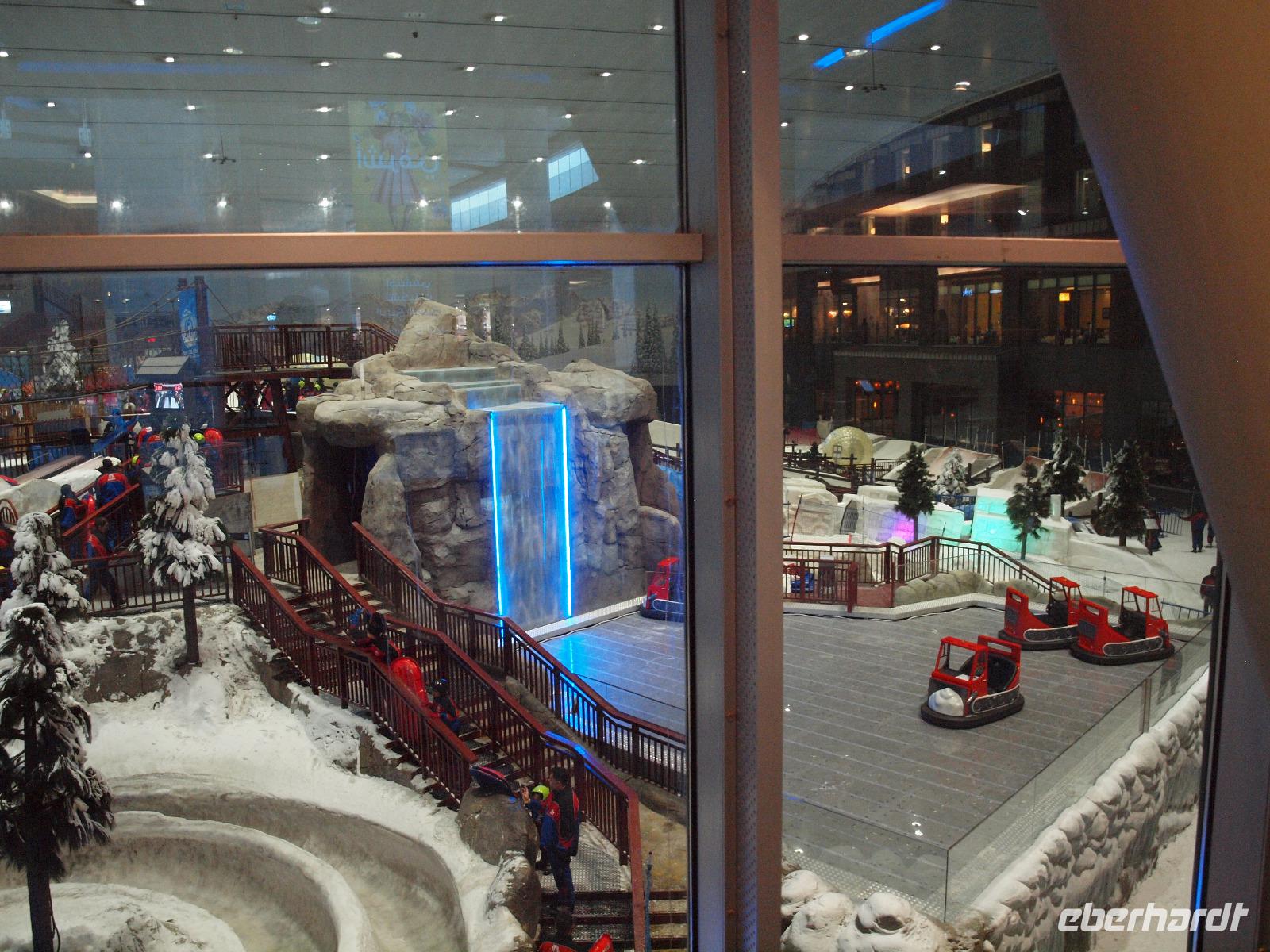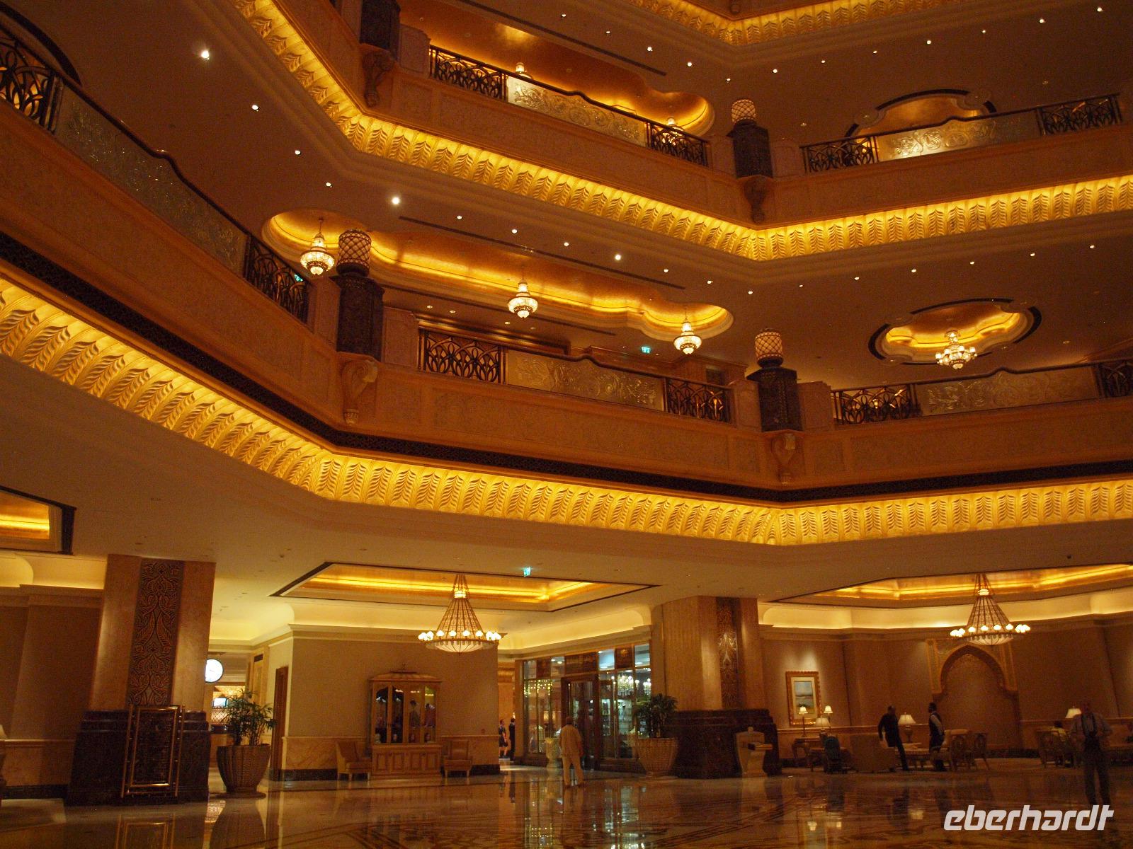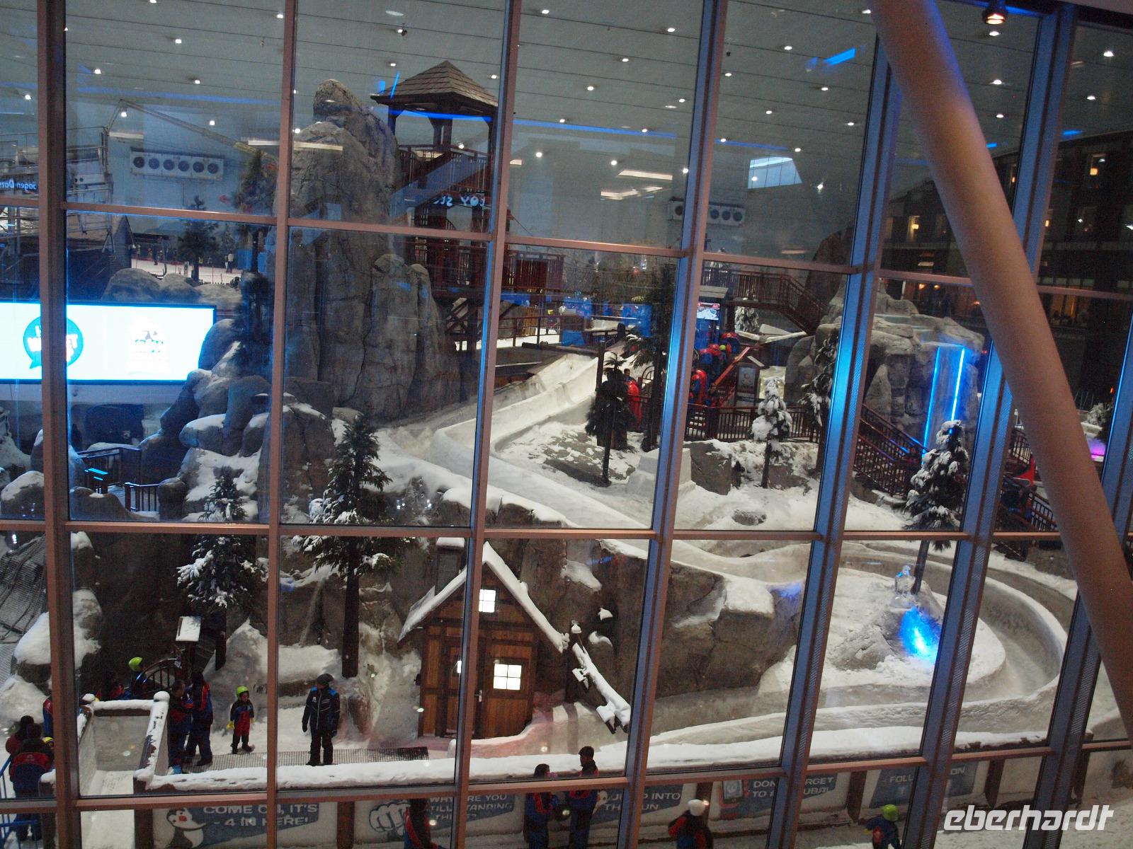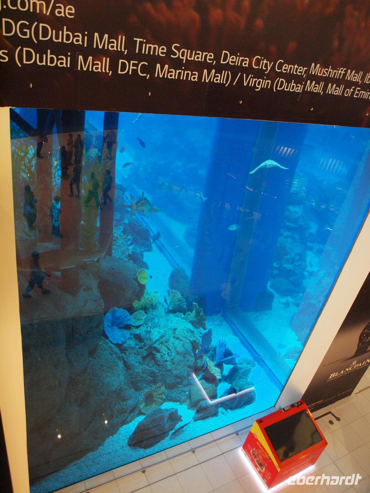Heute stehen viele Dinge auf unserer Tagesliste. Wir beginnen den sonnigen(!) Tag in der Dubai Marina und schlendern etwas entlang des künstlich angelegten Hafenbeckens. Von hier aus bringt uns Hassan auf die Palme ;-) "The Palm", so heißt die künstlich aufgeschüttete Inselwelt und sieht, aus der Luft betrachtet, wirklich wie eine Palme aus. Unser Ziel ist die Palmenkrone, hier steht das 5*-Hotel "Atlantis" und ist von vielen Attraktionen, wie ein eigenes Aqarium und ein Wassererlebnispark, umgeben. Nach einem Bummel durch die öffentlichen Bereiche fahren wir mit der Monorail, einem vollautomatischen Zug, wieder zurück zum Palmenstamm und begeben uns zu unserem nächsten Ziel. Die Mall of the Emirates ist ein Kaufhaus, was man so schnell nicht wieder vergisst. Hauptattraktion ist hier die Ski-Anlage, auf einer schneebedeckten Fläche von gut 22.000 m² gibt es fünf Abfahrten, die sich in Schwierigkeitsgrad, Höhe und Steilheit unterscheiden. Ein Vierer-Sessel-Lift, ein Schlepplift und ein Personenförderband wurde für die Beförderung der Besucher installiert. Für Kinder und Eltern ist der so genannte Snow Park vorgesehen, hier findet man Schlitten- und Bob-Bahnen. Es ist der größte Indoor-Snowpark der Welt. Auf dem Weg zur nächsten Mall, der Dubai Mall, statten wir dem Scheich einen Besuch ab, zumindest bis fast vor die Haustür schaffen wir es und der ein oder andere Pfau freut sich darüber ein willkommenes Fotomotiv zu sein. Etwas später dann in der Dubai Mall schauen wir erst am Innen-Aquarium vorbei. Sogar der ein oder andere Taucher ist im großen Becken zu erkennen. Obwohl so viele Menschen in dieser Mall sind, strahlt sie eine gewissen Ruhe aus. Anja führt uns in die verschiednen "Viertel" der Mall, es gibt hier wohl über 120 Gastronomiebetriebe, den größten Gold-Souk der Welt mit 220 Geschäften, eine Kunsteisbahn, einen musikgesteuerten Springbrunnen, eine 24 Meter hohe Wasserkaskade, einen Saal für Modenschauen, ein Multiplex-Kino mit 22 Sälen, ein Präsentationszentrum für Computerspiele, sowie über ein betreutes Kinder-Abenteuerland... Wir sehen natürlich nicht alles, aber immerhin einen Großteil der WOW-verdächtigen Einrichtungen. Wir gehen kurz aus der Mall hinaus um einen groben Überblick zu bekommen wo wir uns eigentlich befinden. Kaum an der frischen Luft, sehen wir ihn, wie er sich vor uns aufbaut, der Burj Khalifa, der aktuell höchste Turm der Welt. Es ist nun Zeit für ein paar individuelle Erkundungen. Zurück am Treffpunkt gehen wir gemeinsam zum Eingang des Turms und fahren hoch, auf 452 Meter, 124. Stockwerk, auf die Aussichtsplattform, dieses Stockwerk bietet einen 360°-Panoramablick rund um Dubai. Bei guter Sicht hätte man vielleicht sogar die Dubai Marina sehen können. Wieder zurück auf dem Erdboden ist es fast schon 18:00 Uhr. Genau richtig also um das erste Wasserspiel mitzuerleben. Von der Terrasse von unserem Restaurant aus haben wir den perfekten Platz und können die Wasserspiele richtig genießen. Je später der Abend, desto dunkler wird es ja und umso schöner sind sie anzusehen. Alles um uns herum funkelt! Nach dem Essen gehen wir noch eine kleine Runde um den kleinen angelegten See der Springbrunnen und fahren schließlich zurück ins Hotel.