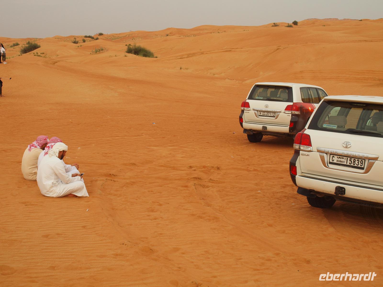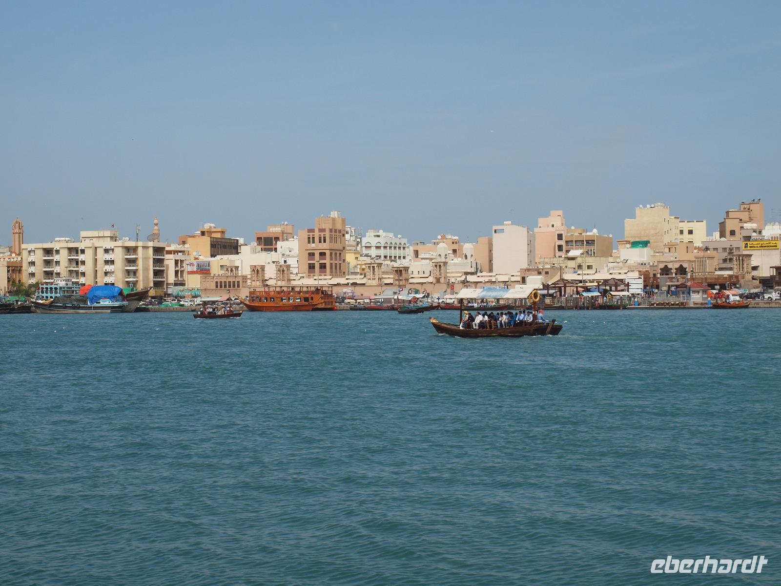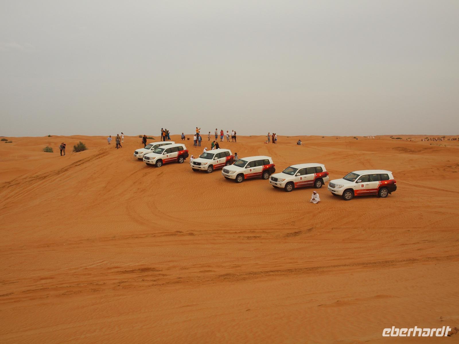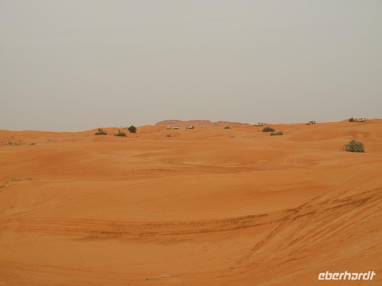 Als Kontrastprogramm zu gestern widmen wir uns heute noch einmal der Geschichte Dubais. Gemeinsam mit Anja spazieren wir durch unseren Stadtteil, vorbei an den alten Häusern, die liebevoll restauriert wurden und heute kleine Kunststudios und auch ein Kaffeemuseum beherbergen. Wir laufen weiter entlang des Dubai Creeks in Richtung Souk. Hier haben sich schon früher die Stoffhändler aus Indien nieder gelassen und so werden hier auch heute noch verschiedene Stoffe, Tücher, Schals und Kleidungsstücke angeboten. Am Wasser angekommen fahren wir dann mit der Abra hinüber auf die andere Seite des Dubai Creeks um dort den Gewürz- und Goldsouk zu besuchen. Um den Vormittag abzurunden fahren wir noch eine kleine Extrarunde auf dem Dubai Creek bevor wir wieder auf der Seite unseres Hotels ankommen. Nun haben wir noch etwas Freizeit bis zum Nachmittag bis uns die Jeeps für die Wüstensafari abholen. Auf die Minute stehen zwei Fahrer mit Ihren Jeeps vorm Hotel und bringen uns zum Treffpunkt am Anfang der Wüste. Es dauert ein wenig, bis alle ankommen, doch die Zeit können wir fürs Fotografieren nutzen. Und dann geht es endlich los. Die tollkühnen voran und immer schön hintereinander mit ausreichend Abstand fahren wir über die Sanddünen. Mal mehr, mal weniger Gas, eine Drehung rechts und wieder eine links. Es geht rauf und runter, zwischendurch kreuzen auch mal Kamelherden unseren Weg. Nach einer Weile versammelt sich die Karawane wieder und wir legen eine kleine Pause ein um den Druck der Reifen wieder zu erhöhen, denn wir sind schon bald da. Nach ein paar weiteren Kilometern erreichen wir schließlich das Wüstencamp. In der Mitte befindet sich Bühne, hier werden im Laufe des Abends ein Tänzer und eine Bauchtänzerin zu sehen sein. Außerdem können sich die Frauen unter uns mit Henna verschönern lassen oder aber man probiert sich an der Wasserpfeife. Ein wirklich schöner und abwechslungsreicher Abend in der Wüste neigt sich nach und nach dem Ende und schon bald werden wir wieder zurück ins Hotel gebracht.