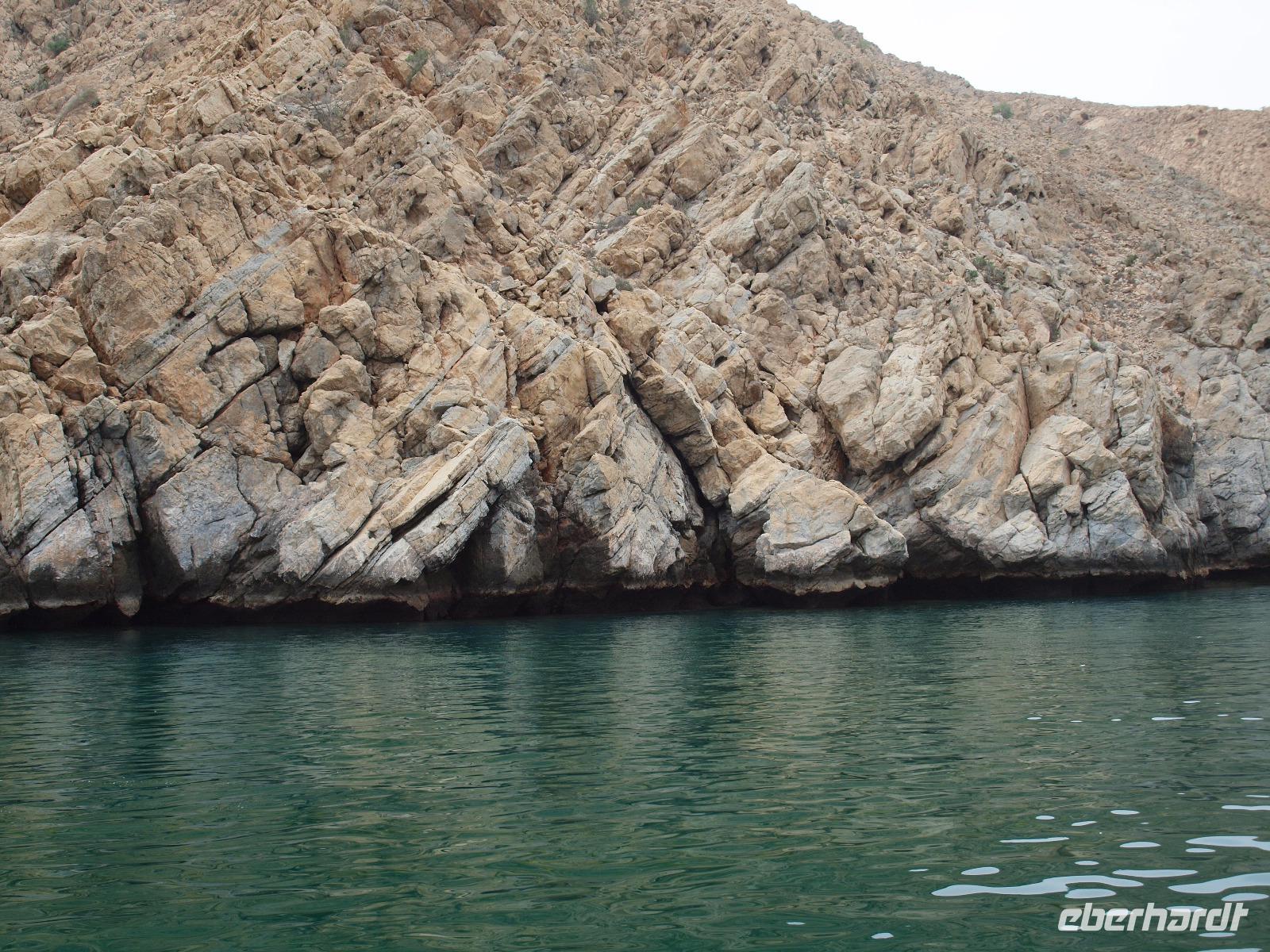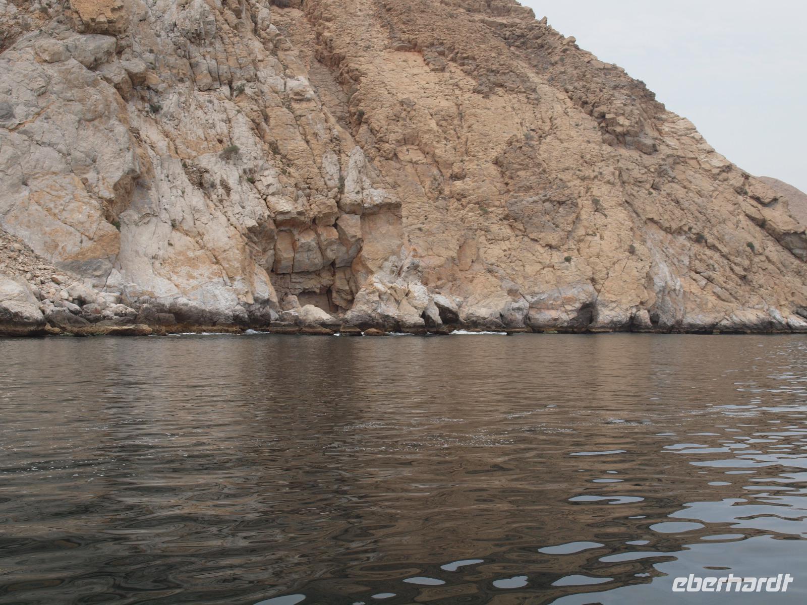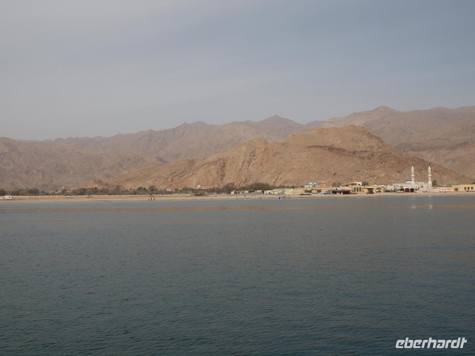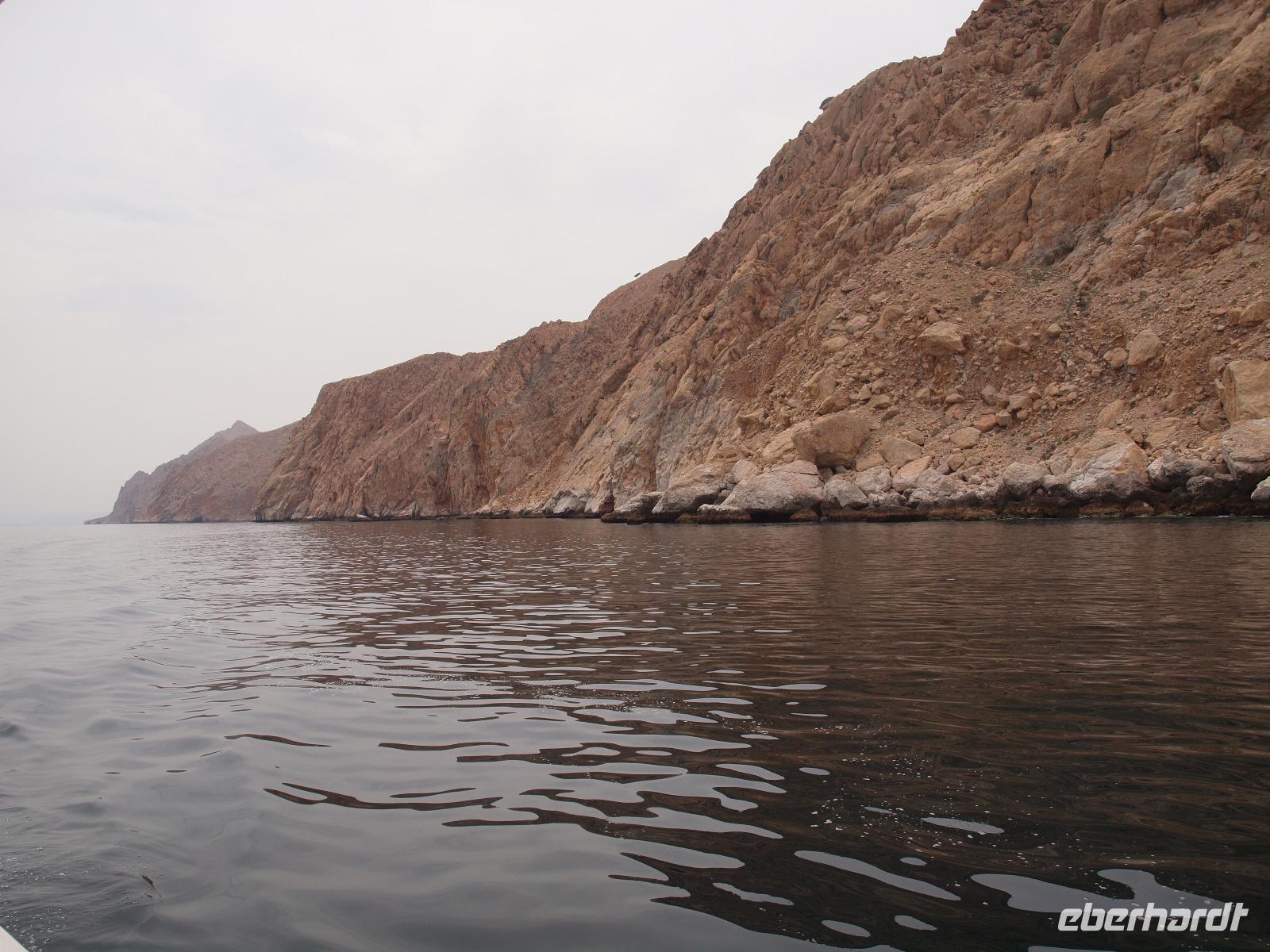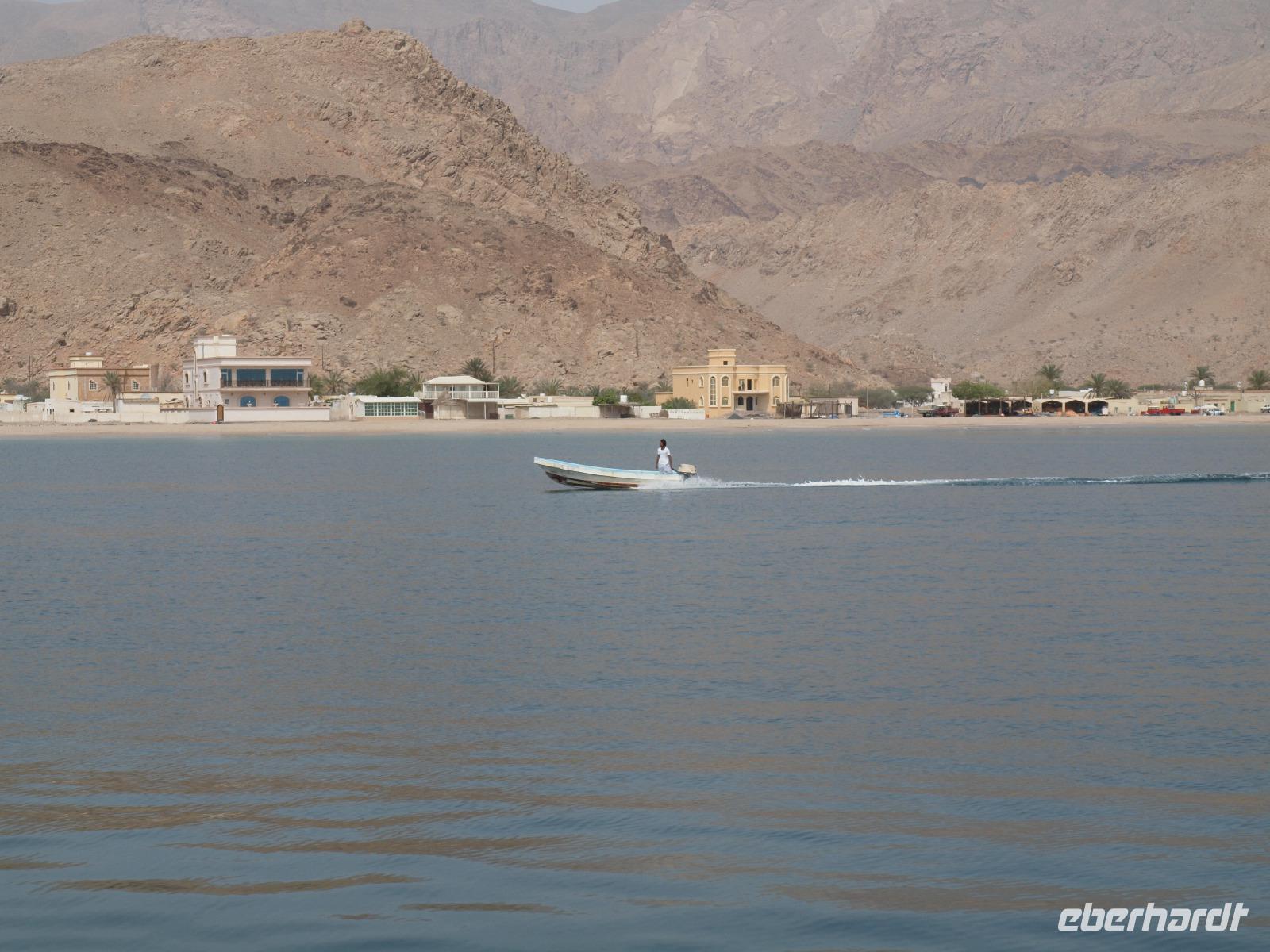 Unser heutiger Tag beginnt schon sehr früh. Wir werden von einem Kleinbus im Hotel abgeholt. Mohammed, unser Fahrer bringt uns über die Grenzen fünf weiterer Emirate, Schardscha, Adschman, Umm Al Qaywayn, Ras Al Chaima und Fujairah. Bereits im letzteren Emirat verändert sich die Landschaft immer mehr von Wüste zu Bergland. Die roten Sanddünen weichen den kargen Bergen des Omangebirges welches sich insgesamt 100km durch die Emirate zieht. An der Grenze zum Oman werden wir dann noch kurz kontrolliert, das ganze dauert gerade mal einen Wimpernschlag. Wir fahren zum Hafen von Dibba. Hier treffen mehrere Busse zusammen und gemeinsam mit einer bunt gemischten Gruppe gehen wir an Bord unserer Dhau. Wir werden freundlich in Empfang genommen von unserem Reiseleiter und der Crew des Schiffes. Wir suchen uns den für uns besten Platz auf dem Schiff und schon kann die Reise beginnen. Entlang der zerklüfteten Küsten von Musandam fahren wir in den Norden. Diese Landschaft hier, das ganze Omangebirge also auch, ist durch Plattenverschiebung entstanden. Aufgrund der zusammentreffenden Platten gibt es in diesem Gebiet immer mal wieder Erdbeben. Die Dhau bringt uns in den ersten Fjord, hier haben wir Zeit um zu schwimmen, zu schnorcheln und an einen nahegelegenen Strand mit dem Beiboot zu fahren. Hier bietet sich ein kleiner Spaziergang an, man kann schöne Muscheln sammeln, manchmal werden diese jedoch auch lebendig ;-) Wir haben hier etwa eine Stunde Zeit bevor es dann zurück an Bord geht und das Mittagessen auf uns wartet. Wir werden heute arabisch Essen, laut Reiseleiter hat traditionell eine Einheimische für uns gekocht. Es gibt verschiedenes zur Auswahl, ob Hühnchen, Lamm oder Rind. Besonders sollte ich hierbei aber den Reis erwähnen... Es geht uns eigentlich richtig gut auf diesem Schiff. Das Wetter spielt mit, wir sind nur wenige Passagiere und die Landschaft ist, obwohl recht karg, eine echte Abwechslung für unsere Augen.