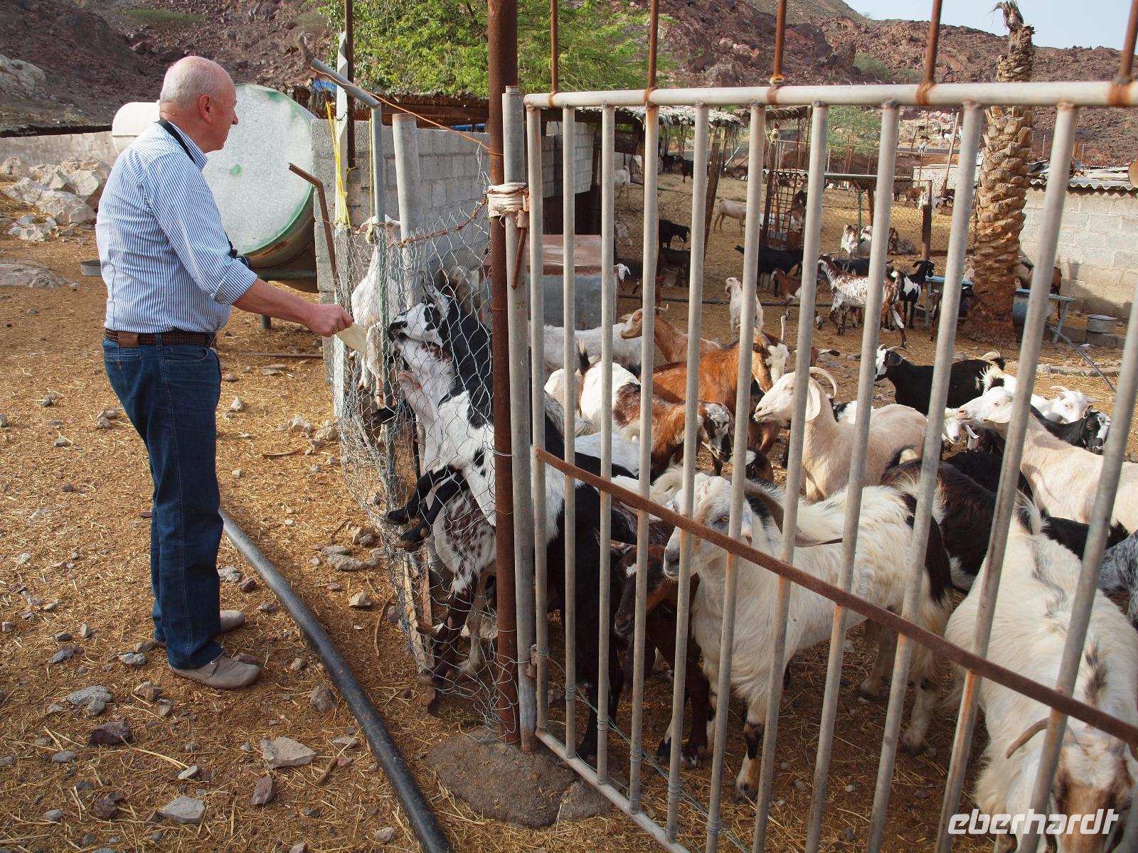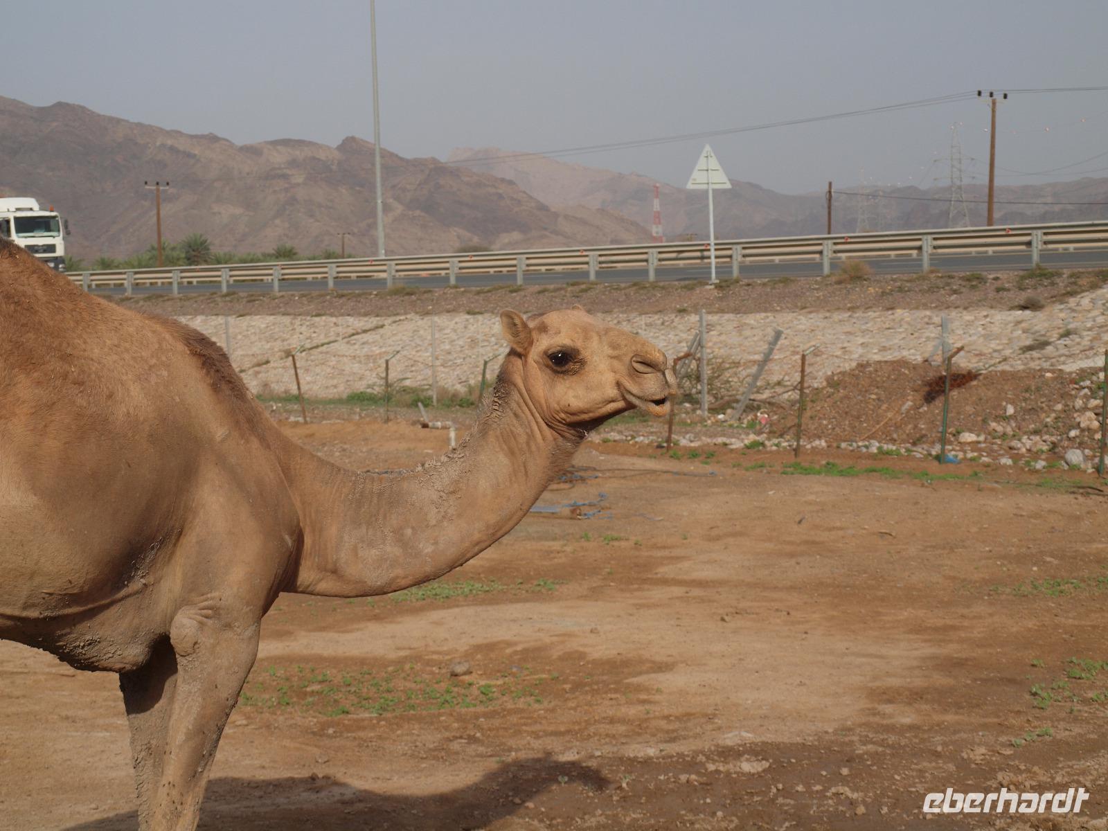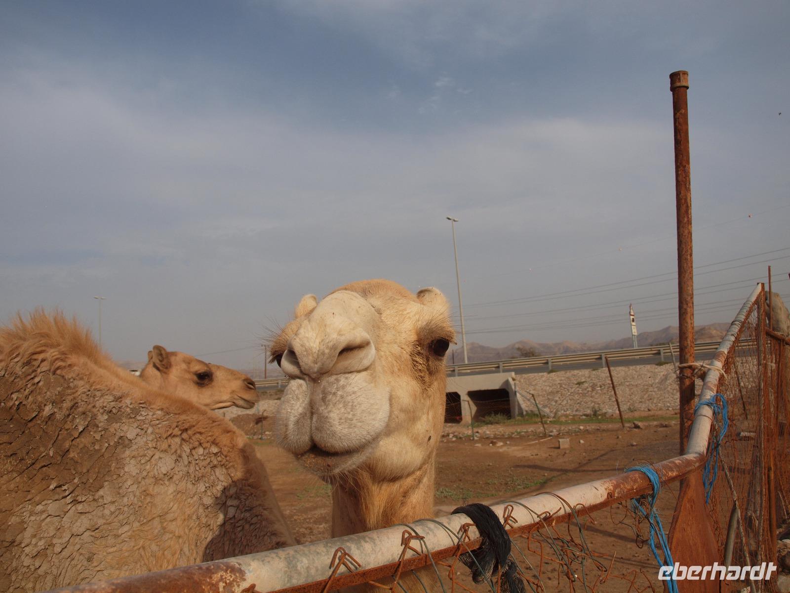 Es ist dann aber auch schon Zeit wieder zurück zum Hafen von Musandam zu fahren. Auf dem Rückweg vergeht die Zeit wie im Fluge und schon sitzen wir eigentlich schon wieder im Auto und fahren zurück nach Dubai. Doch für einen kleinen Zwischenstopp sorgt Mohammed noch. Wir halten mit ein paar Leckereien in der Tasche an einer kleinen Farm am Straßenrand und besuchen zwei Dromedare und deren zahlreichen Freunde, Ziegen. Diese freuen sich natürlich sehr über unseren Besuch. Nach gut zwei Stunden Fahrt erreichen wir dann Dubai und unser Hotel. Heute Abend gehen wir noch einmal hier im Hotelrestaurant essen. Danach gehen die meisten von uns Kofferpacken, die anderen lassen sich auf einen Abschlussdrink in einer Skybar ein und lassen den Abend mit Blick auf die leuchtenden Höchhäuser ausklingen.