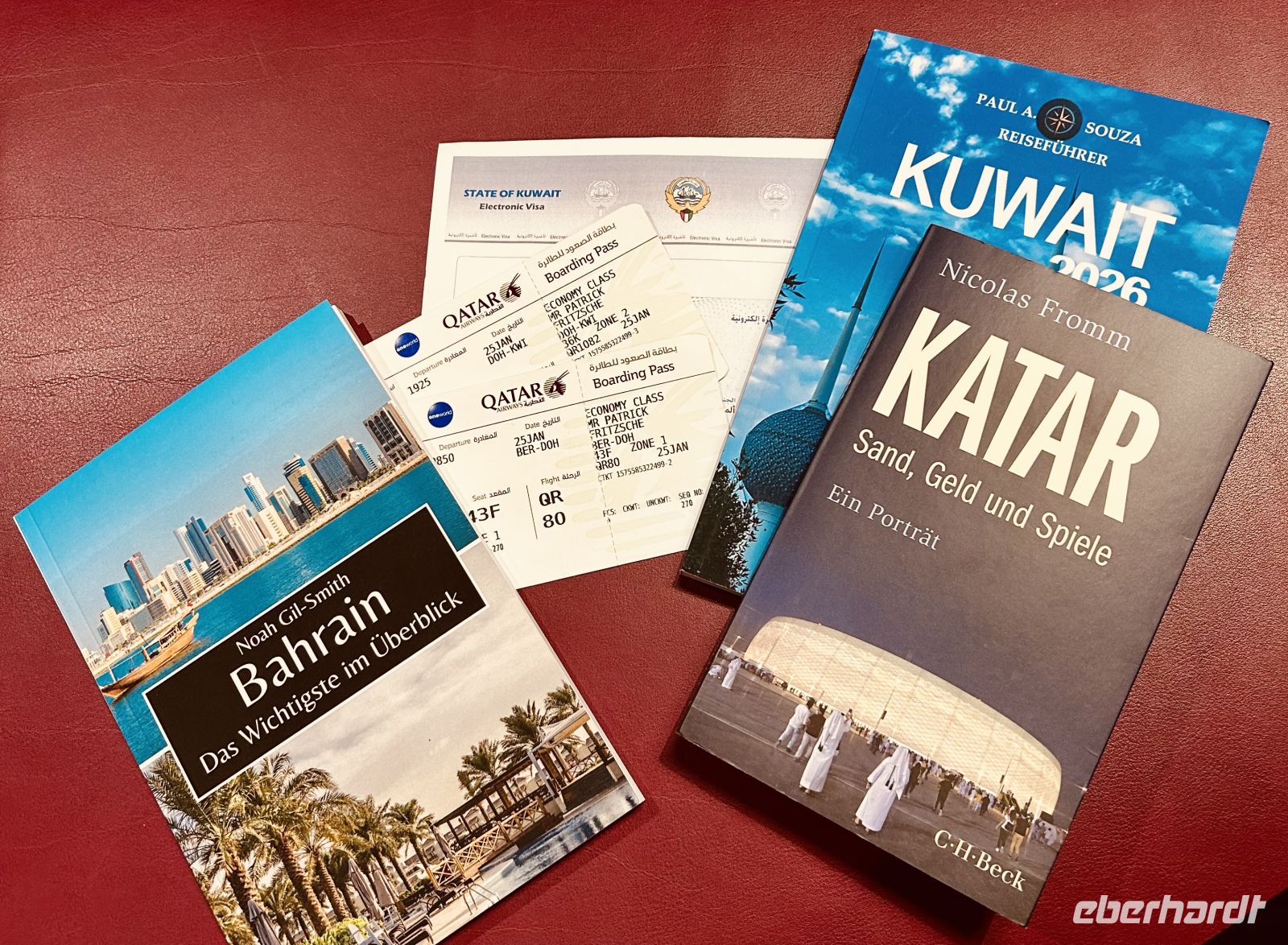 Nur eine Stunde dauert der Flug nach Kuwait, doch die Fahrt über das Rollfeld nach der Landung fühlt sich fast genauso lang an. Als wollte uns das Land noch ein wenig auf die Folter spannen. Dann wird es spannend: Einreise. Wir sind gut vorbereitet, fast alle mit eVisa. Eigentlich denken wir, das Thema sei erledigt. Eigentlich.