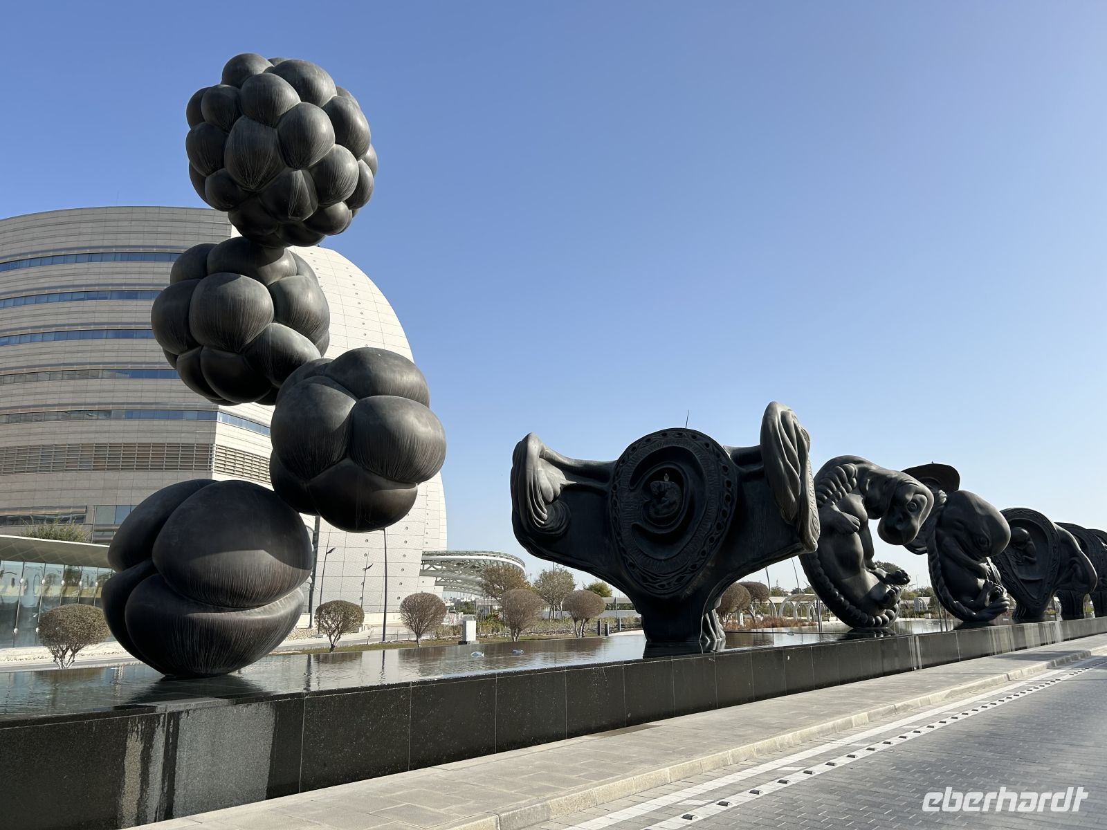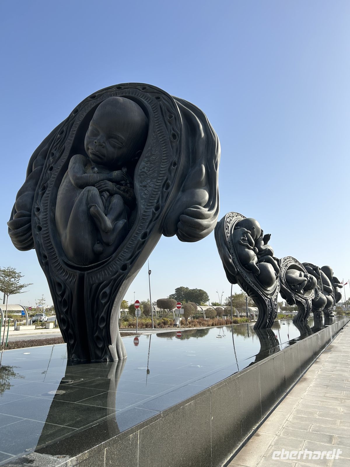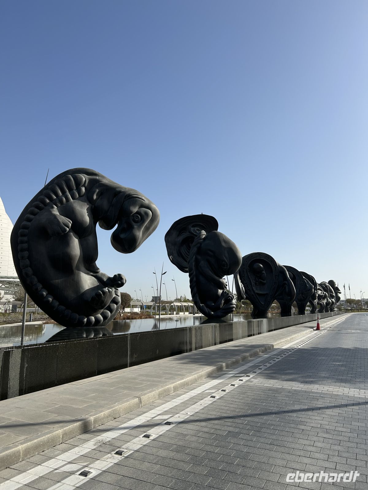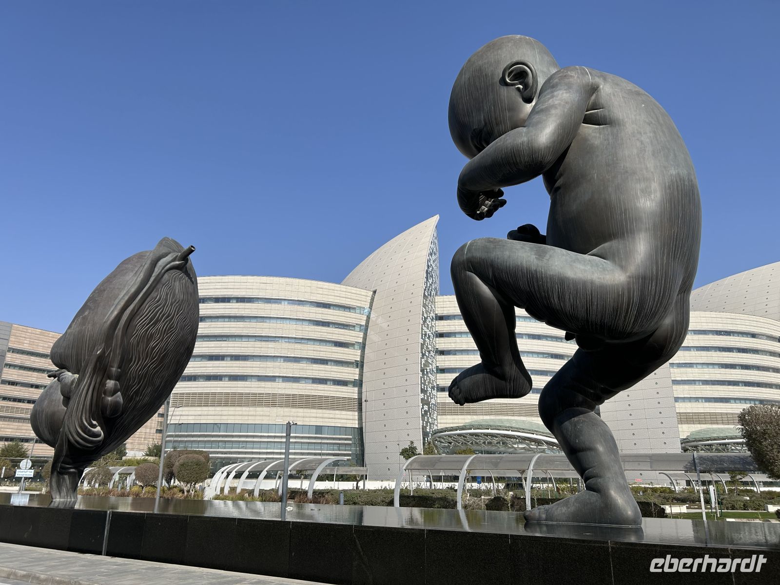 Unser erster Stopp führt uns zum Sidra Krankenhaus. Schon hier wartet eine Überraschung: das monumentale Kunstwerk „The Miraculous Journey“ von Damien Hirst. Die gewaltigen Skulpturen zeigen die Entwicklung eines ungeborenen Kindes – offen, direkt, schonungslos. Ein außergewöhnliches Projekt, das man so in Katar nicht unbedingt erwarten würde. Umso erstaunlicher und beeindruckender ist es, dieses Werk hier zu sehen – ein starkes Zeichen für Offenheit in einem sonst eher konservativen Land.