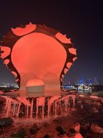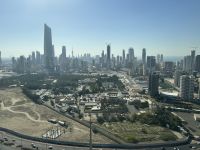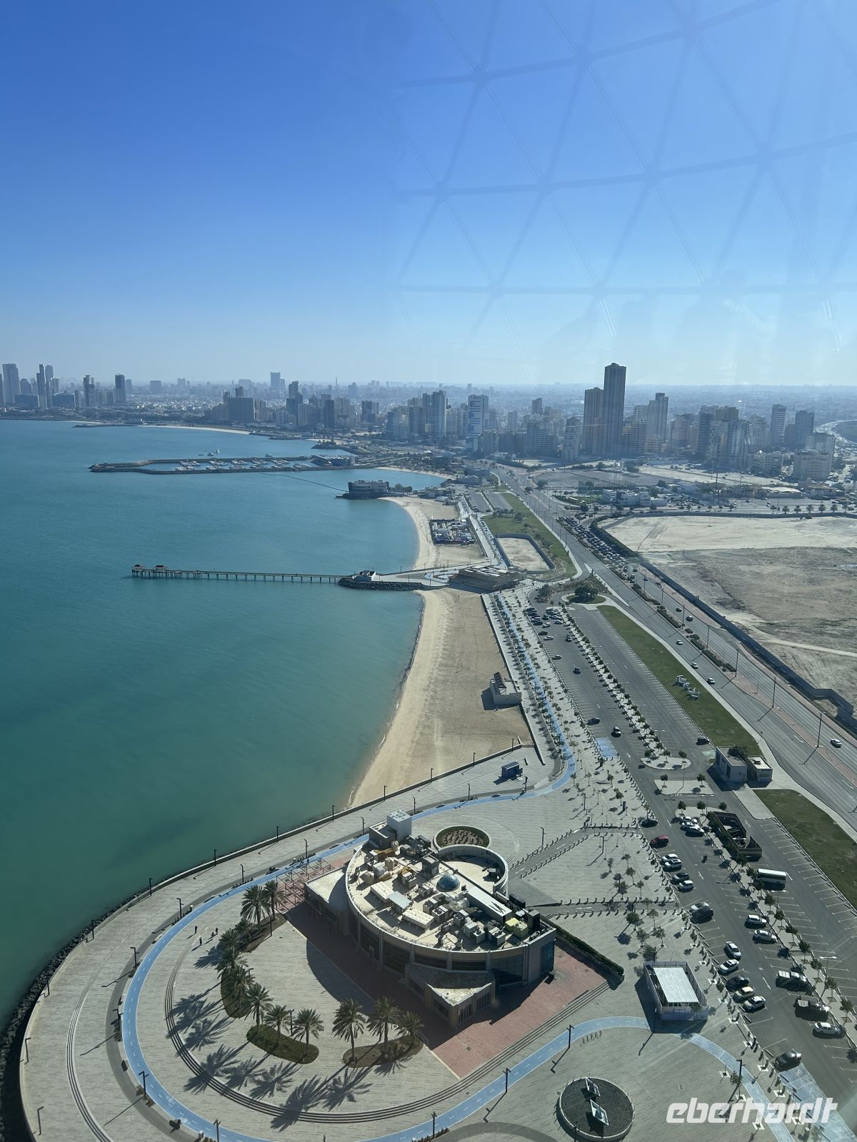 Von oben genießen wir einen großartigen Blick über Stadt und Meer – und auf die neue, beeindruckende Brücke, die sich kilometerlang über die gesamte Bucht von Kuwait spannt. Bei einem kleinen Snack lassen wir diesen Moment wirken.