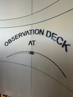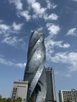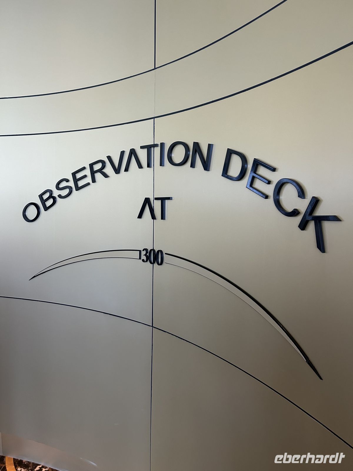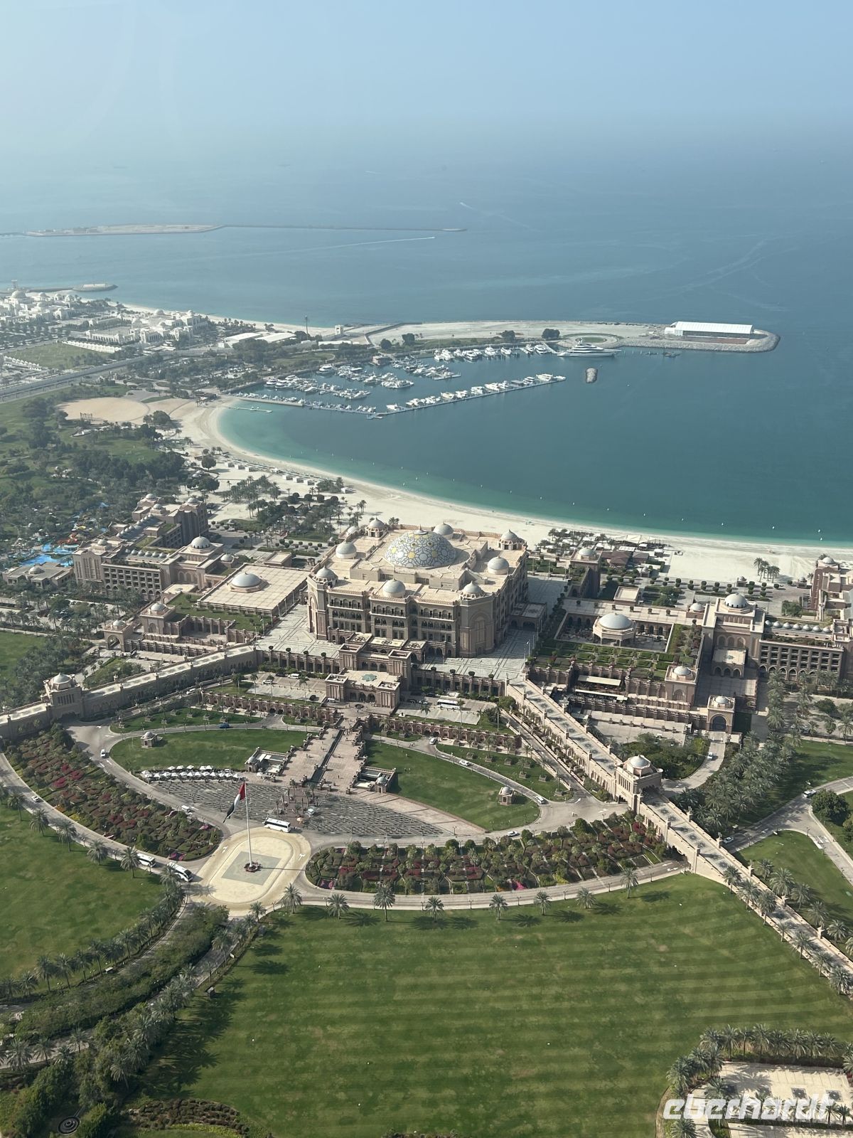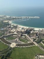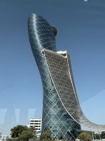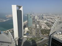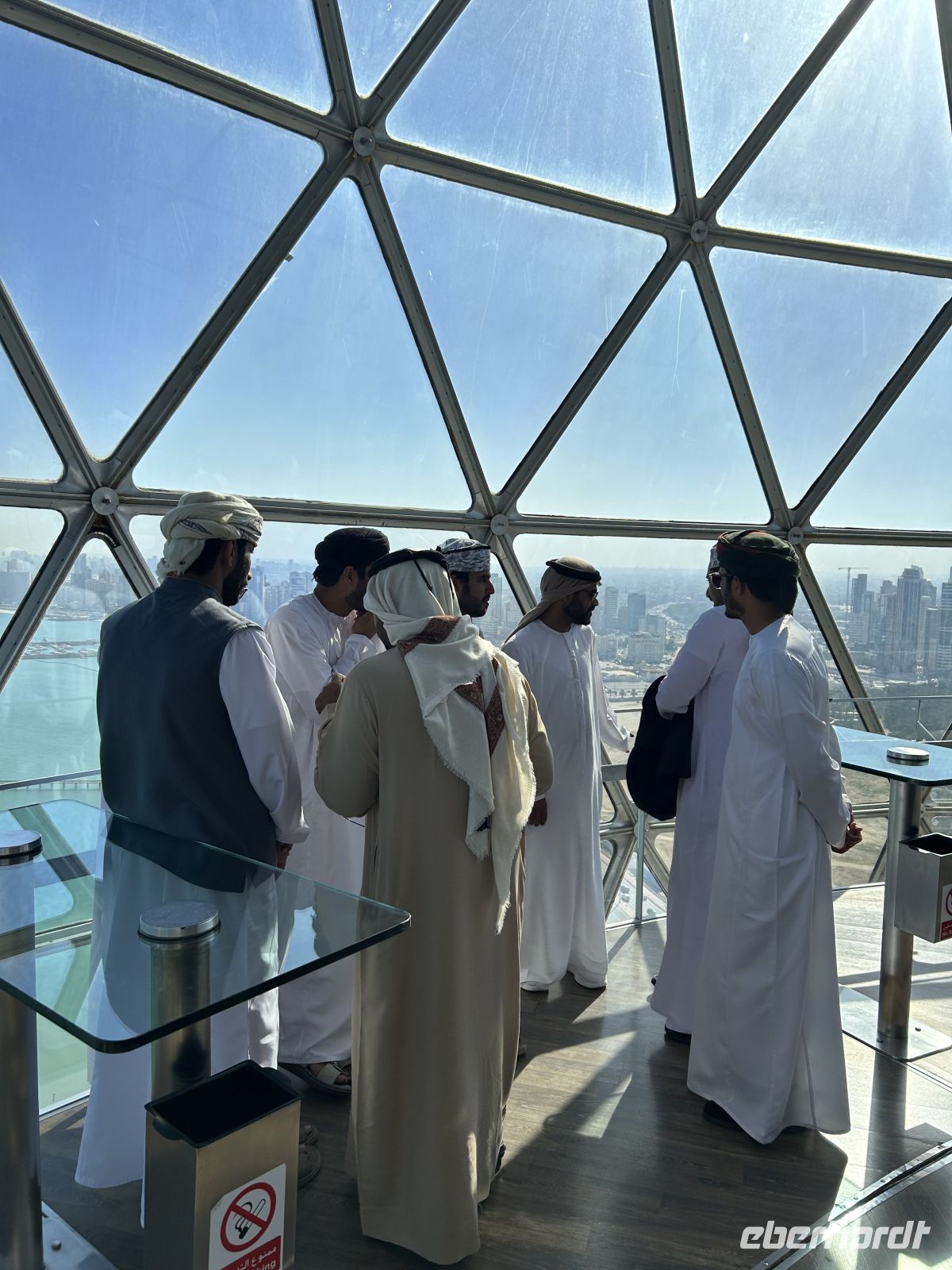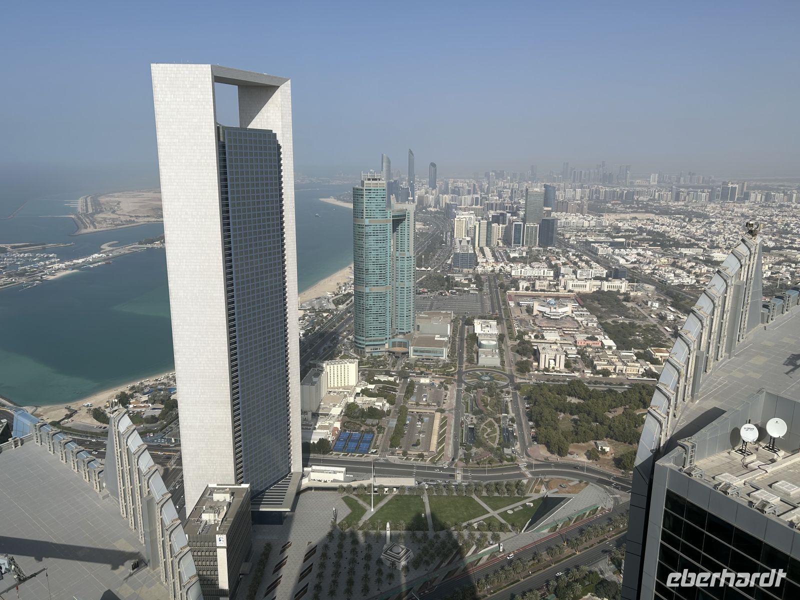 Mit dem Aufzug geht es hinauf in die 74. Etage. Auf ca. 300 Metern angekommen genießen wir bei einem kleinen Mittagssnack eine traumhafte Aussicht über Stadt, Meer und Inseln. Abu Dhabi zeigt sich großzügig, modern und erstaunlich grün.