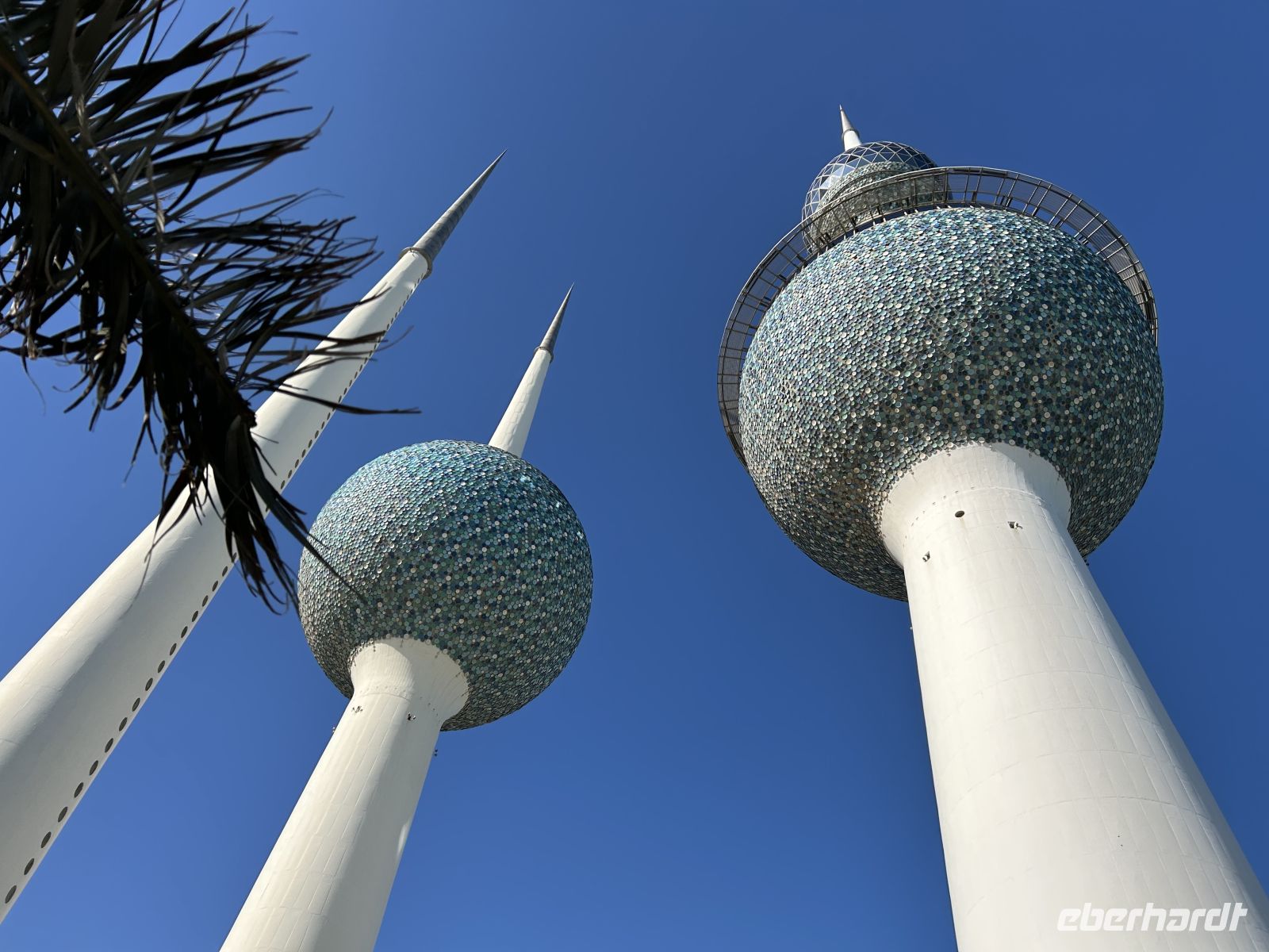 Anschließend fahren wir entlang der Gulf Road zu den berühmten Kuwait Towers. Die drei Türme aus den 1970er-Jahren sind nicht nur Wahrzeichen, sondern auch technische Meisterwerke: Die größten Kugeln dienen als Wassertanks, die kleinere als Aussichtspunkt und Restaurant. Ihre blau-grünen Mosaike glitzern in der Sonne, fast wie Fischschuppen.