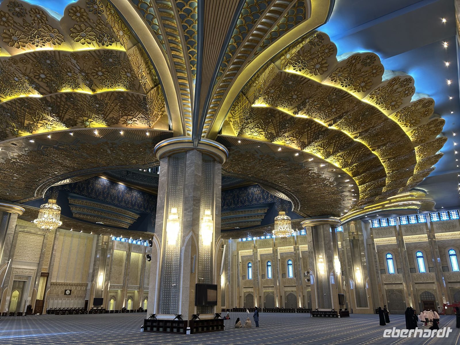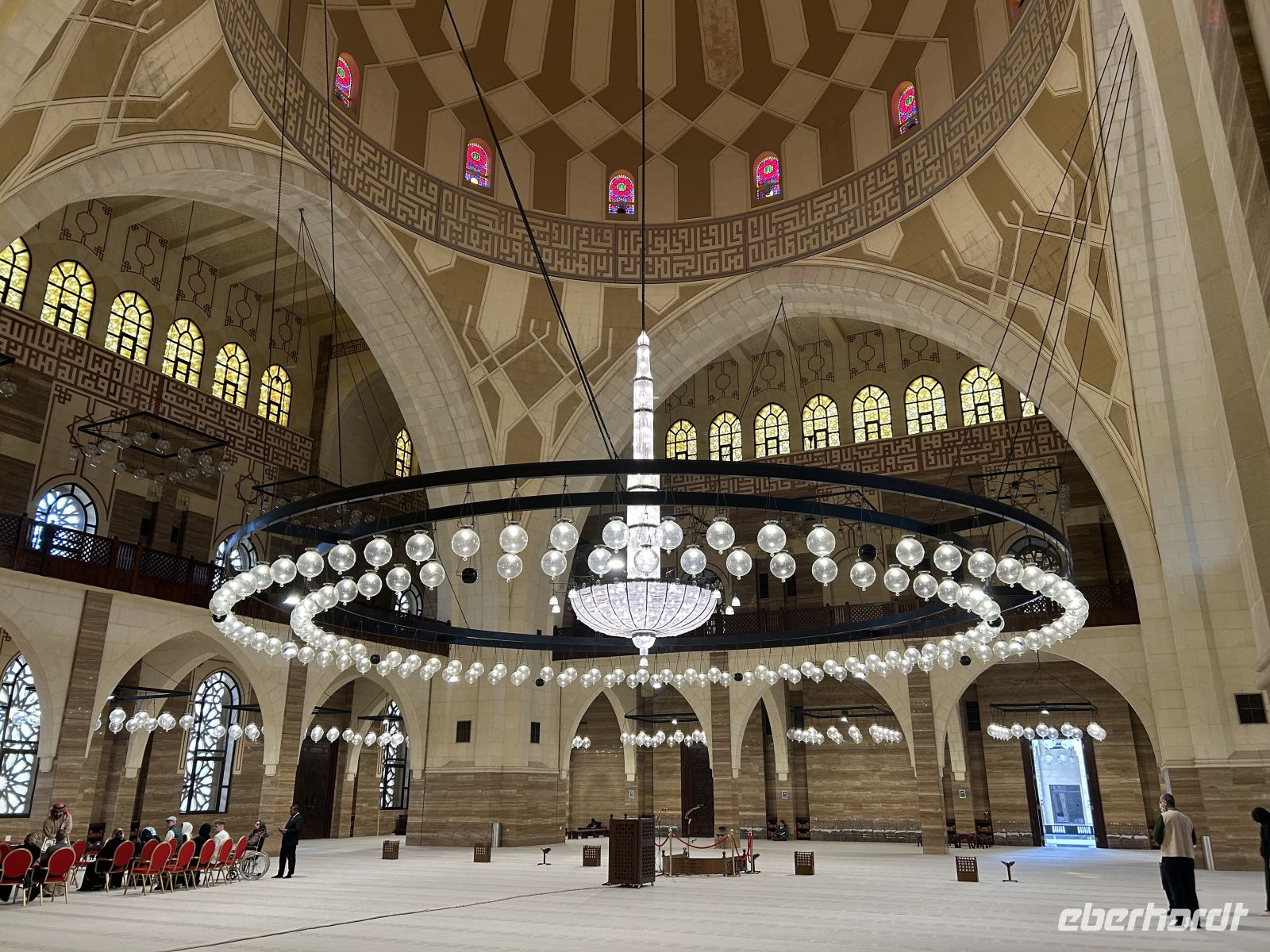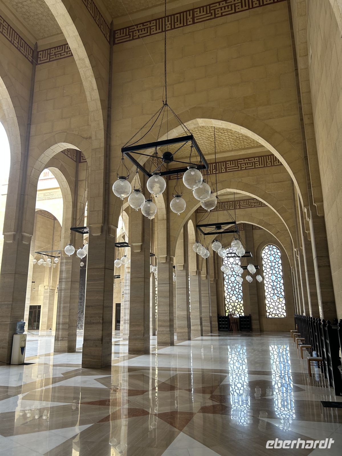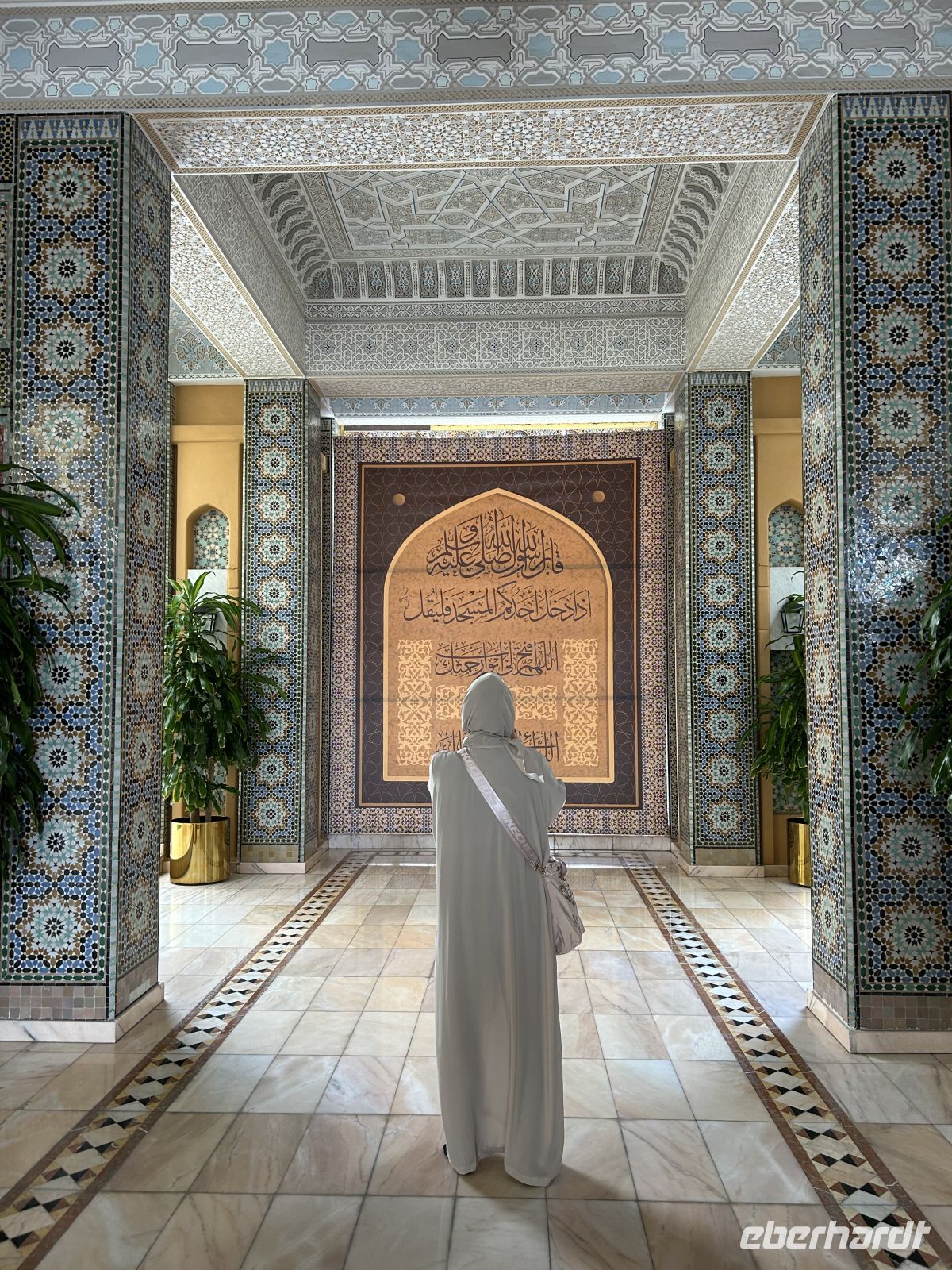 Eine junge Kuwaiti führt uns durch die Moschee, zeigt uns die gewaltige Hauptgebetshalle, den Empfangsbereich und den Versammlungsraum des Emirs, Sheikh Meshal Al-Ahmad Al-Jaber Al-Sabah, der sein Amt erst im Dezember 2023 übernommen hat. Ein spannender Einblick in Religion, Architektur und Politik zugleich.
