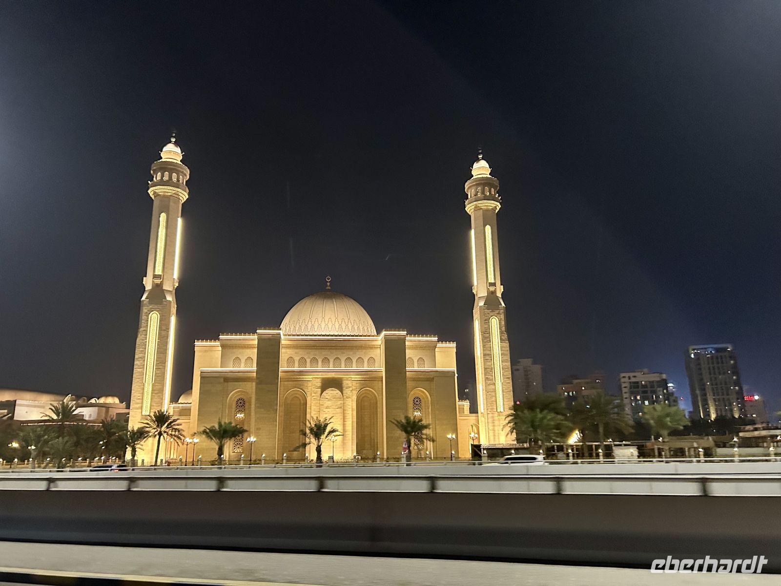 Auch bei der Ausreise nehmen es die Behörden sehr genau: Sicherheitskontrolle, Passkontrolle, nochmal Sicherheitskontrolle. Danach sitzen wir endlich im Flieger von Gulf Air nach Bahrain. Nach knapp einer Stunde landen wir im kleinen Königreich. Dank eVisa geht die Einreise schnell und unkompliziert. Schon kurz darauf fahren wir zu unserem Hotel, direkt neben der großen Moschee von Manama.