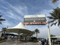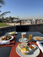 Ein riesiger, moderner Flughafen empfängt uns. Die Einreise verläuft zügig, und schon wartet unser Guide Ibrahim auf uns. Gemeinsam fahren wir zum Traders Hotel. Die Hoffnung, bereits kurz vor halb eins alle Zimmer beziehen zu können, erfüllt sich zwar nicht – aber auch dafür findet sich eine gute Lösung: ein Getränk auf der Terrasse mit Blick auf Strand und Meer. Besser kann man Wartezeit kaum verbringen.