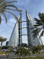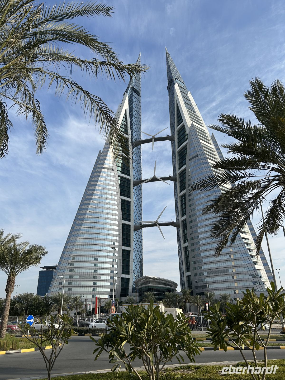 Auf dem Weg zum Souq legen wir noch einen Fotostopp am Bahrain World Trade Center ein – die markanten Zwillingstürme mit integrierten Windturbinen, ein Symbol für das moderne Bahrain.