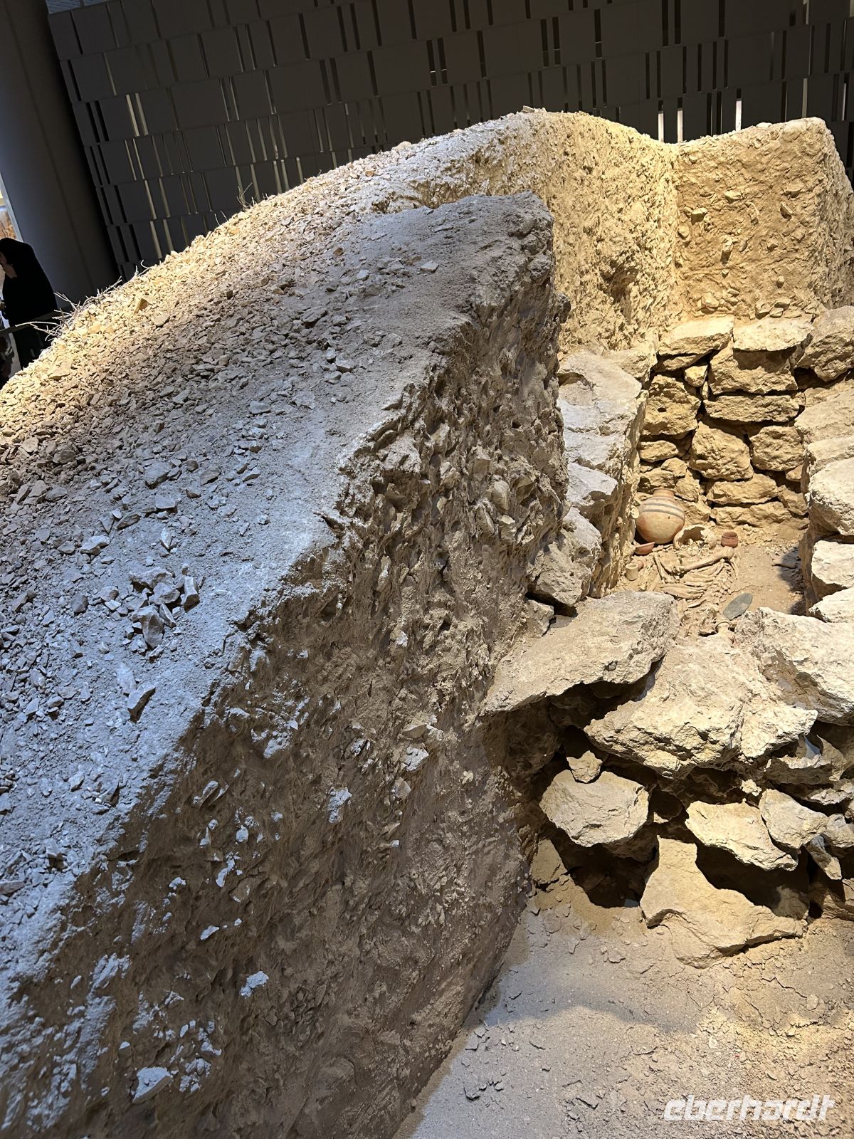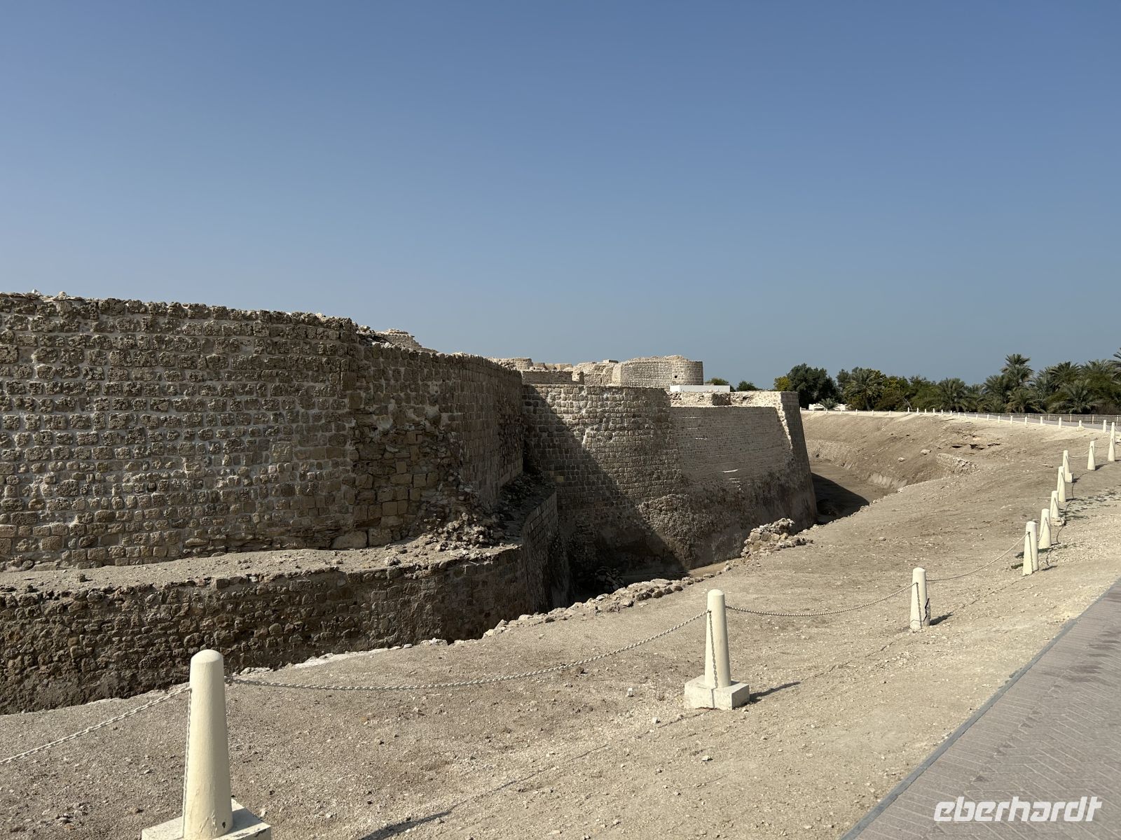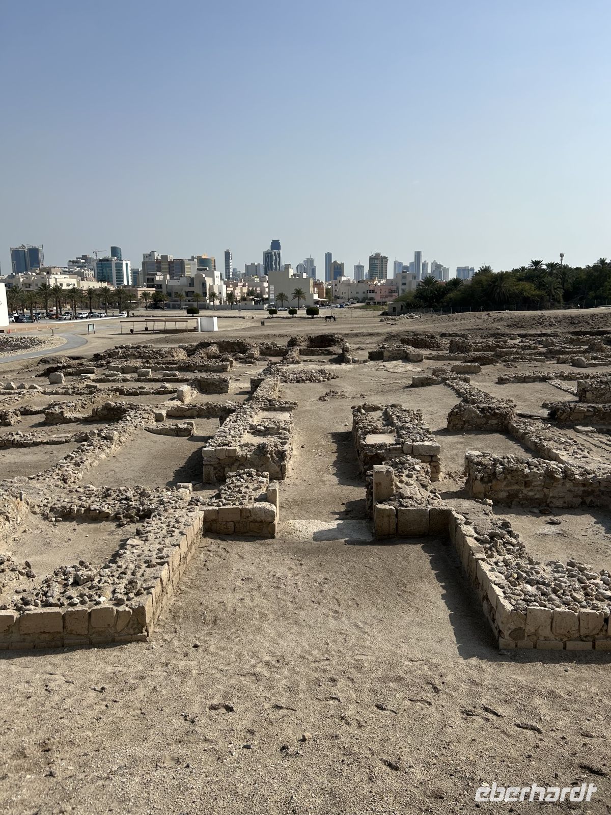 Dann erreichen wir das Bahrain Fort (Qal’at al-Bahrain) an der Nordküste. Hier tauchen wir ein in die Geschichte der Dilmun-Kultur, einer der ältesten Hochkulturen der Welt. Bereits vor über 4.000 Jahren war Bahrain ein bedeutendes Handelszentrum zwischen Mesopotamien und dem Industal. Das Fort selbst liegt auf einem archäologischen Hügel, unter dem sich Schicht um Schicht womöglich noch vergangene Siedlungen verbirgen. Beim Rundgang wird spürbar, wie eng hier Vergangenheit und Gegenwart miteinander verbunden sind: jahrtausendealte Mauern – und im Hintergrund die moderne Skyline. Ein beeindruckender Kontrast.