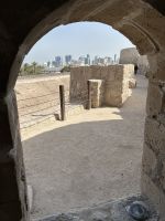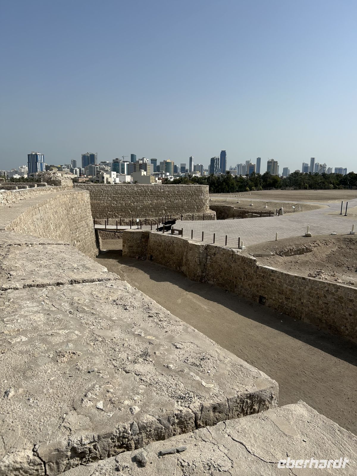 Heute steht bereits unsere letzte Tour in Bahrain an – gemeinsam mit unserer „lieben Moni aus Berlin“, die uns in den vergangenen Tagen mit so viel Herz, Wissen und guter Laune begleitet hat. Das Gepäck reist heute mit: Wir beladen den Trolley direkt am Bus und sausen damit quer durch die Stadt. Auf dem Weg zum Bahrain Fort legen wir noch ein paar Fotostopps ein. Die Skyline von Manama zeigt sich noch einmal von ihrer besten Seite – modern, elegant, fast ein wenig gelassen.