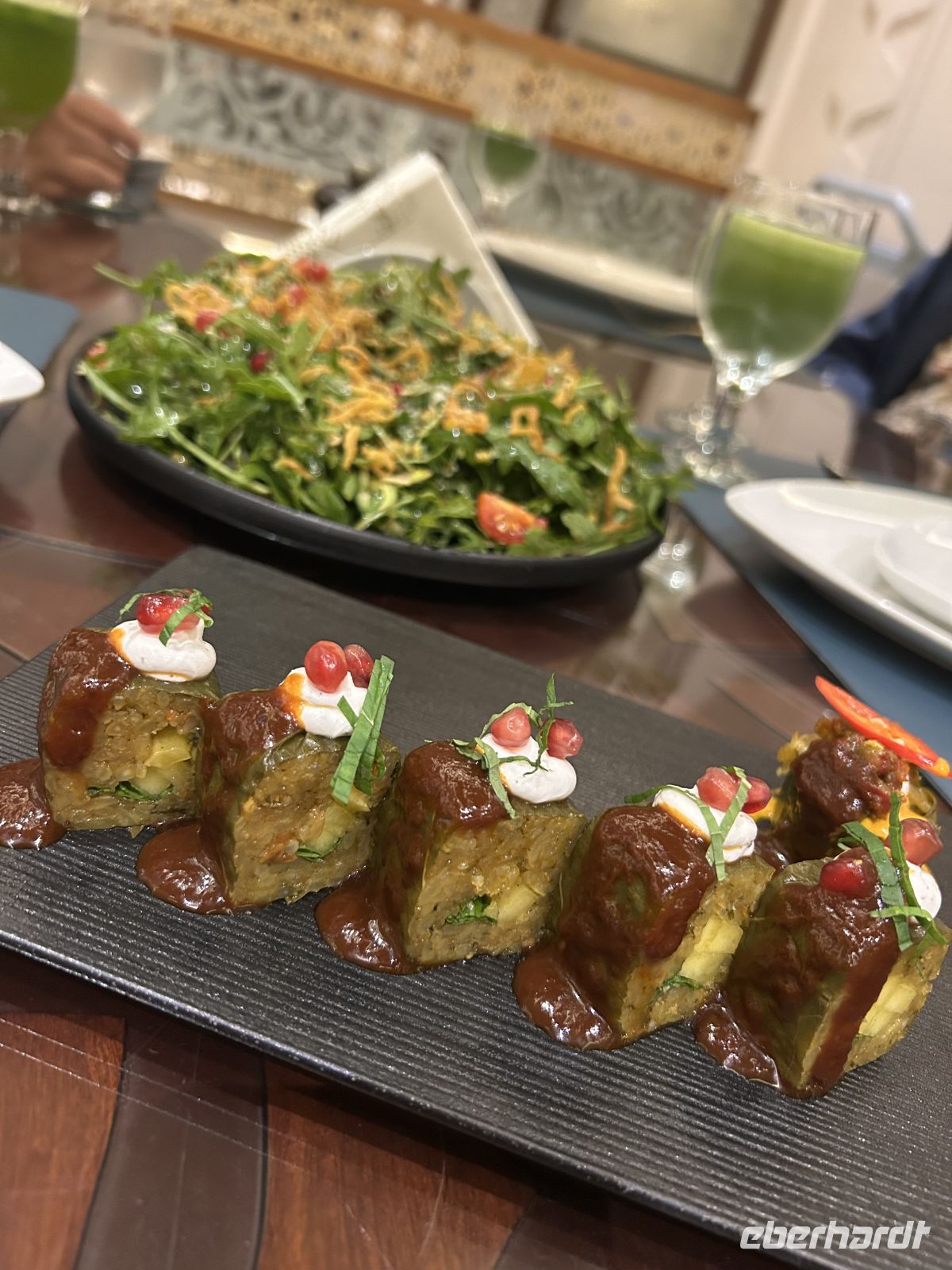 Doch Doha weiß zu entschädigen: Am Abend genießen wir ein ausgezeichnetes Dinner in einem katarischen Restaurant mit Michelin-Stern. Fein, kreativ, voller Aromen – ein kulinarisches Erlebnis, das die Anreise vergessen lässt. Ein gelungenes Welcome in Katar. Doha kann kommen.