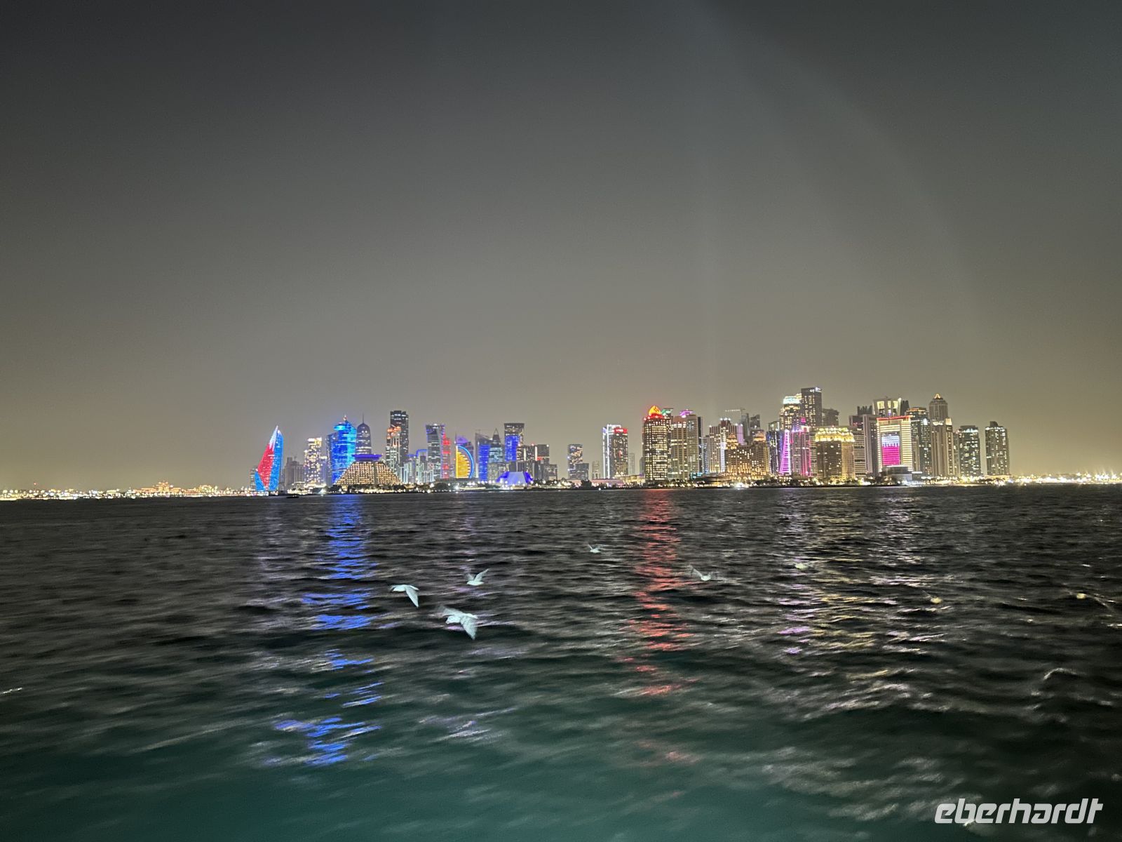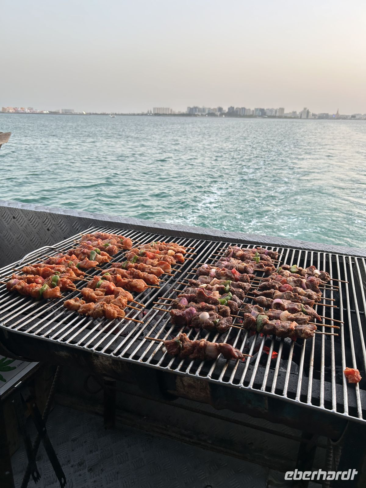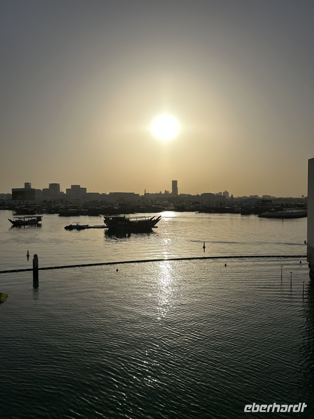 Am Abend wartet dann noch ein ganz besonderer Ausklang: eine Dhau-Fahrt zum Sonnenuntergang. Langsam gleiten wir entlang der Westbay bis zur Pearl. Während die Sonne untergeht und die Skyline zu leuchten beginnt, ist das BBQ an Bord bereit. Essen, Gespräche, Lichter, Wasser – und schließlich die Rückfahrt entlang der blinkenden Silhouette Dohas. Ein perfekter Abschluss unseres Aufenthalts in Katar.