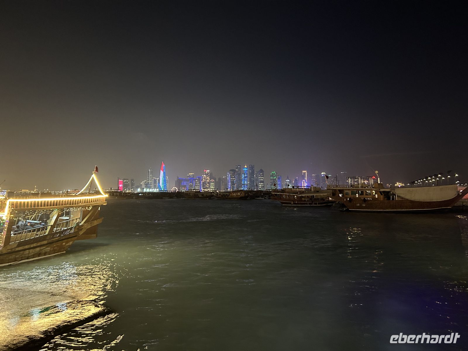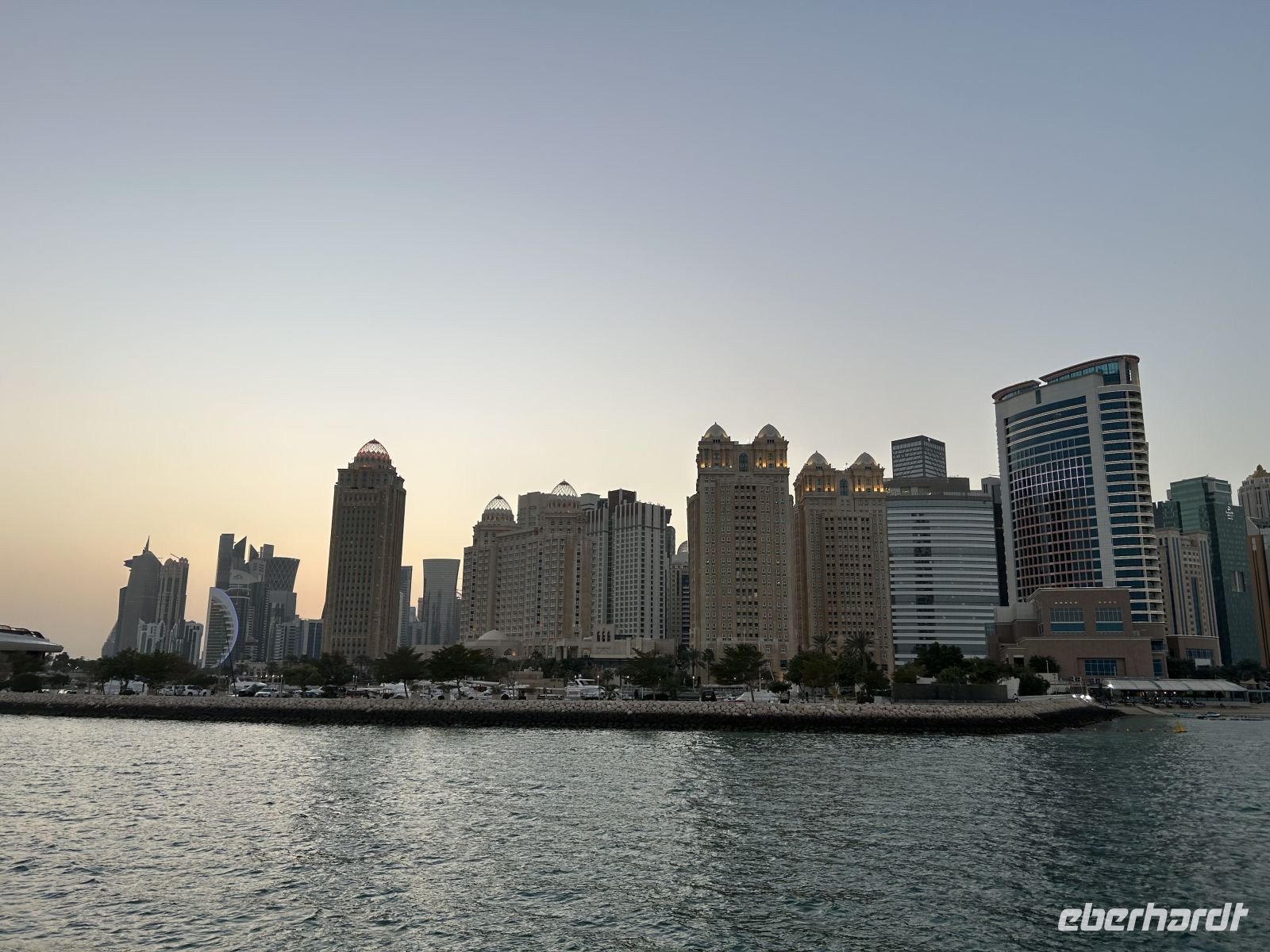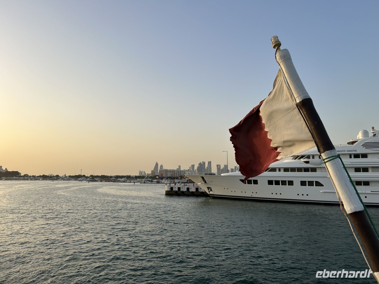 Am Abend wartet dann noch ein ganz besonderer Ausklang: eine Dhau-Fahrt zum Sonnenuntergang. Langsam gleiten wir entlang der Westbay bis zur Pearl. Während die Sonne untergeht und die Skyline zu leuchten beginnt, ist das BBQ an Bord bereit. Essen, Gespräche, Lichter, Wasser – und schließlich die Rückfahrt entlang der blinkenden Silhouette Dohas. Ein perfekter Abschluss unseres Aufenthalts in Katar.