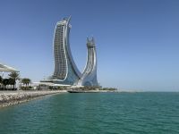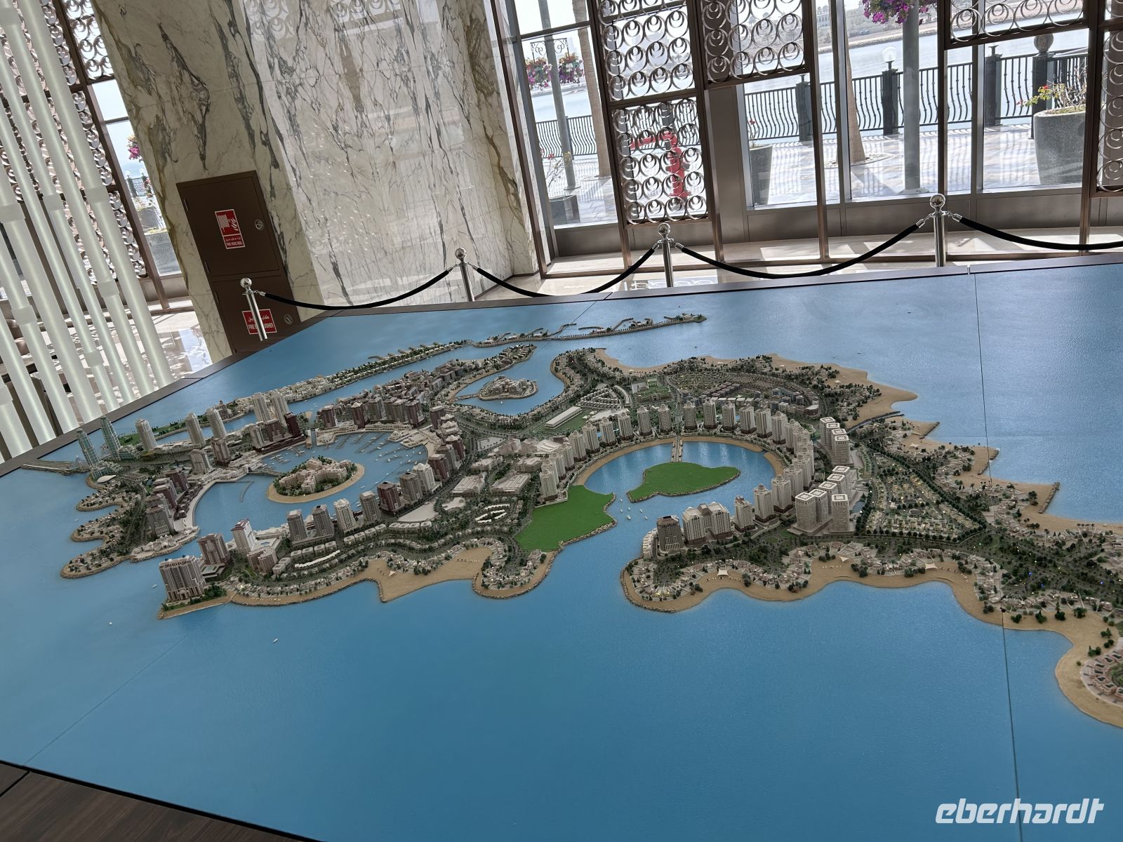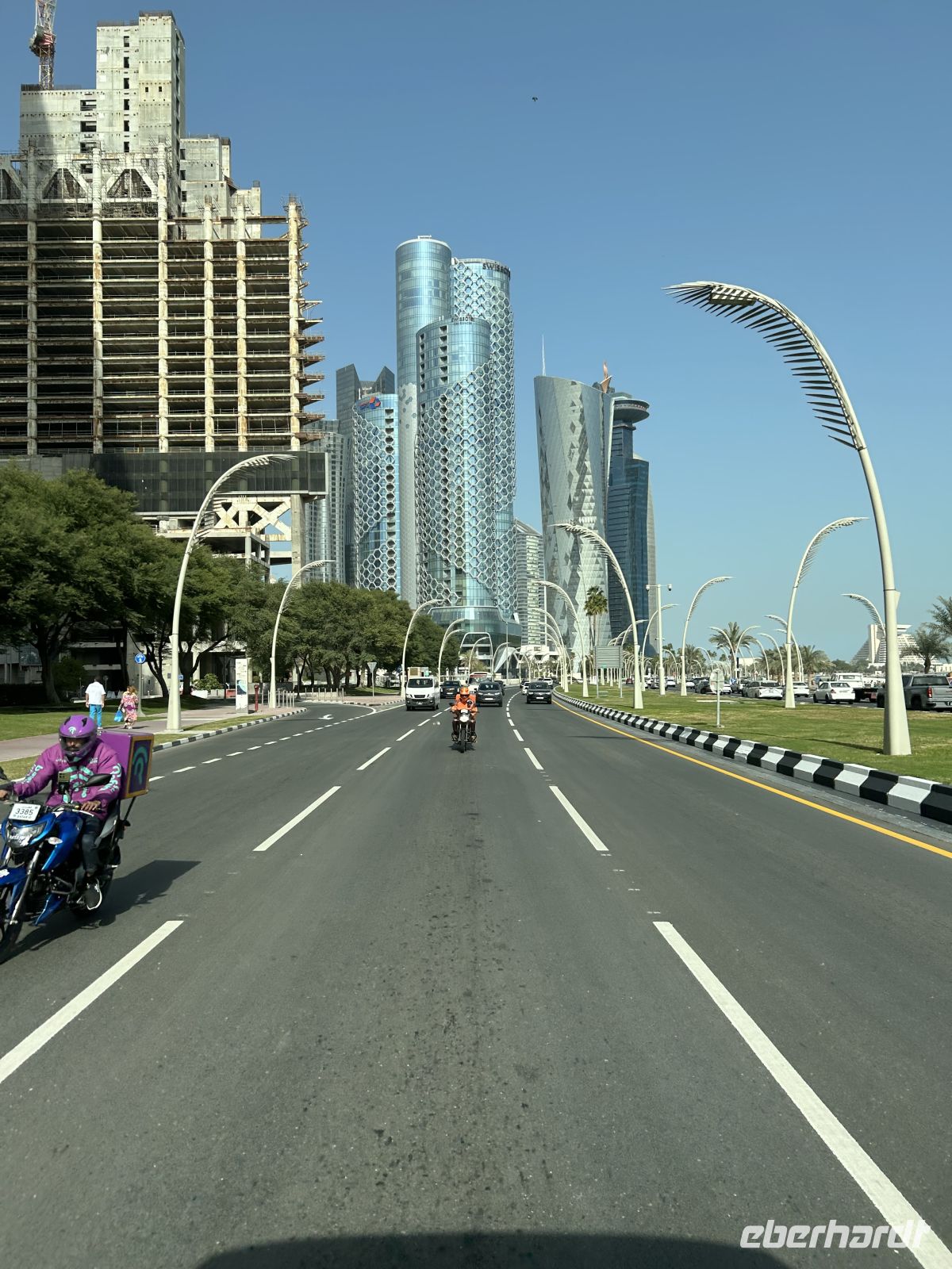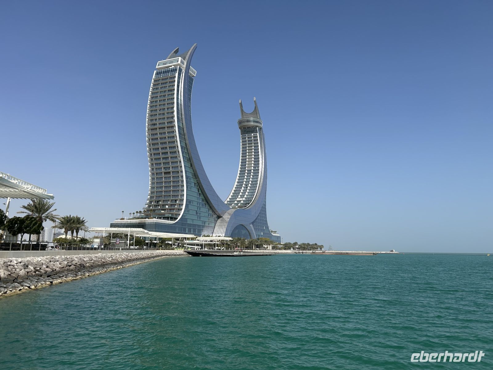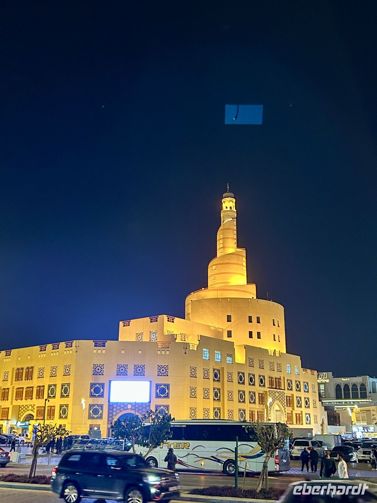 Mit unserem kleinen Coaster geht es über die mehrspurige Stadtautobahn Richtung Norden. Schon die Fahrt ist beeindruckend: breite Straßen, moderne Architektur, viel Raum. Unser erster Halt ist Lusail City. Von hier aus haben wir einen großartigen Blick auf die markanten Katara Towers – zwei geschwungene Hochhäuser in Form gekreuzter Säbel, inspiriert vom Staatswappen Katars. Sie stehen sinnbildlich für das neue, selbstbewusste Katar: modern, symbolträchtig, ambitioniert.