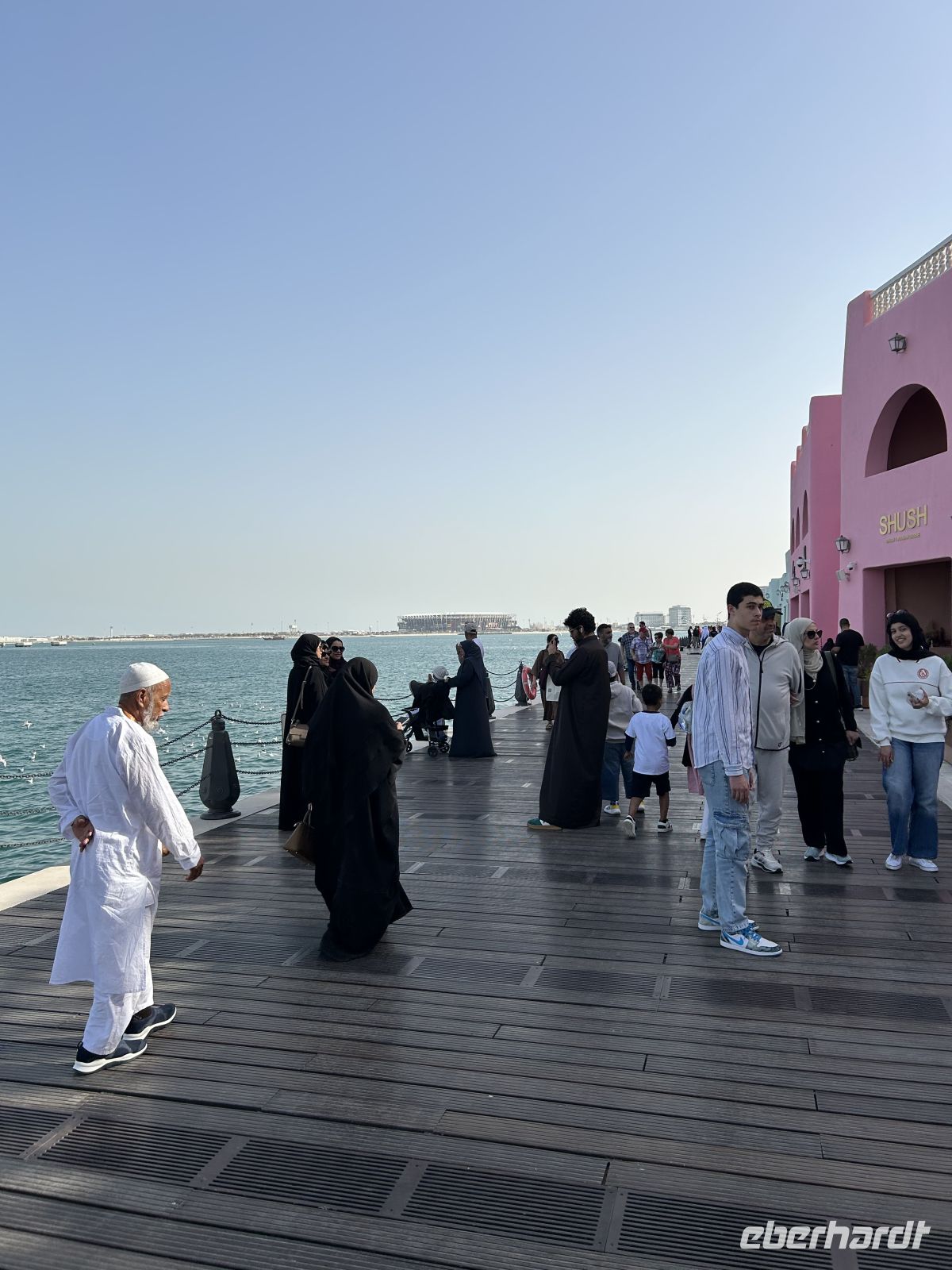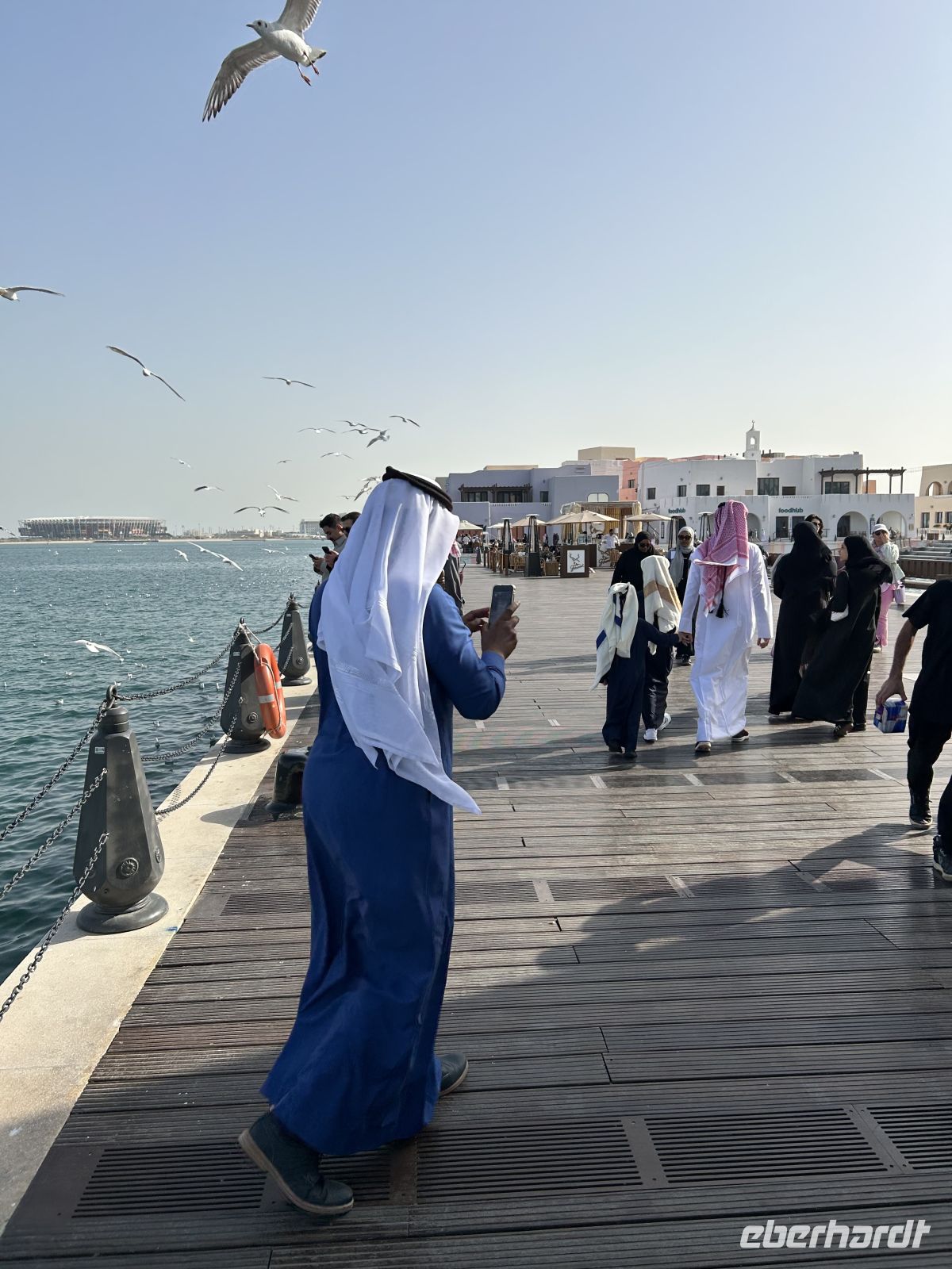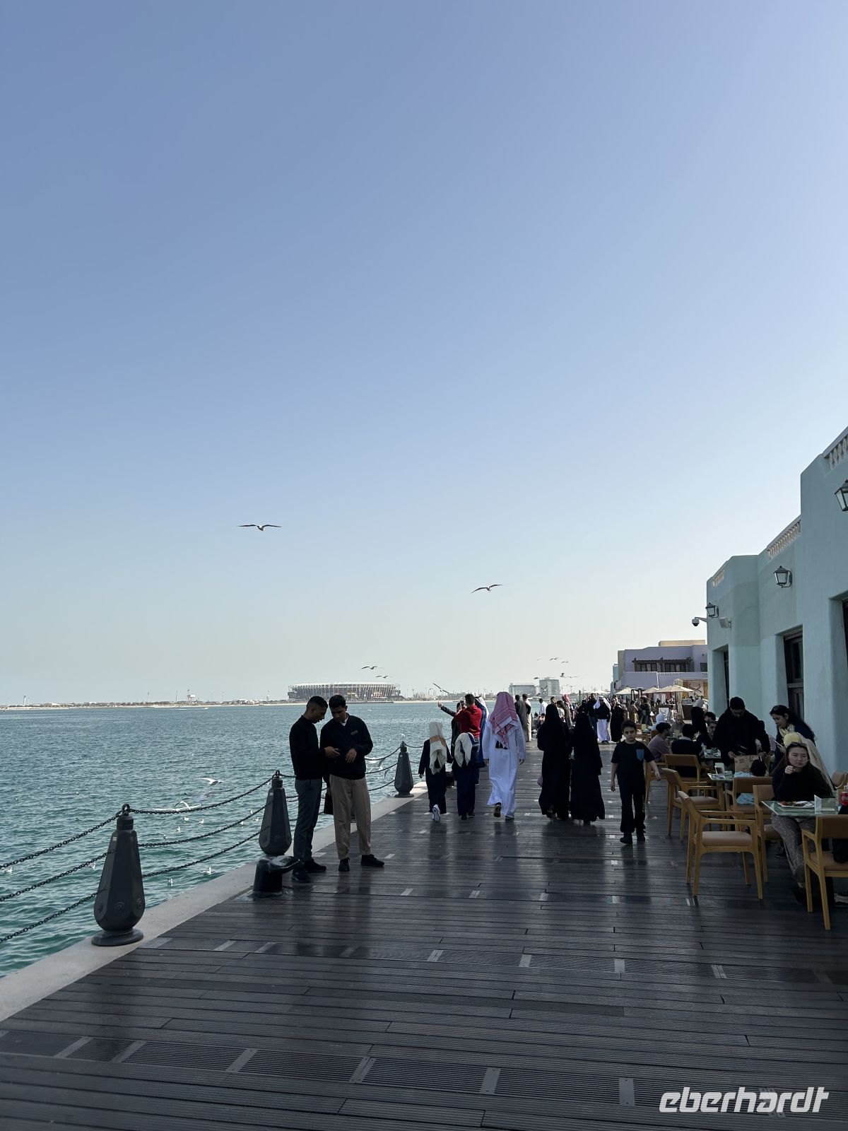 Ein Kontrastprogramm folgt mit einem entspannten Bummel an der Marina von The Pearl – mediterranes Flair, Yachten, Cafés, Promenade. Fast vergisst man, dass man sich mitten im Nahen Osten befindet. Dann reisen wir plötzlich nach Venedig – zumindest gefühlt. Ein Stopp im Qanat Quartier mit seinen bunten Fassaden, Brücken und Kanälen sorgt für viele Fotos und Staunen. Doha kann offensichtlich auch verspielt.
