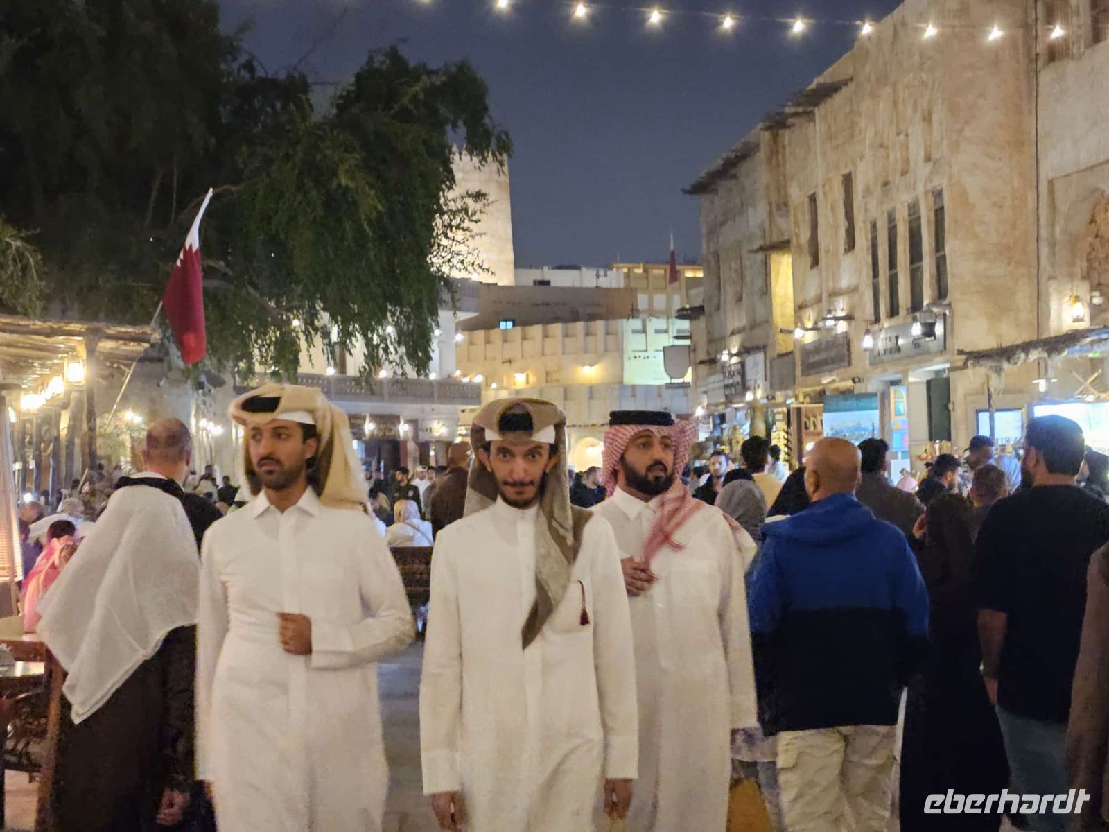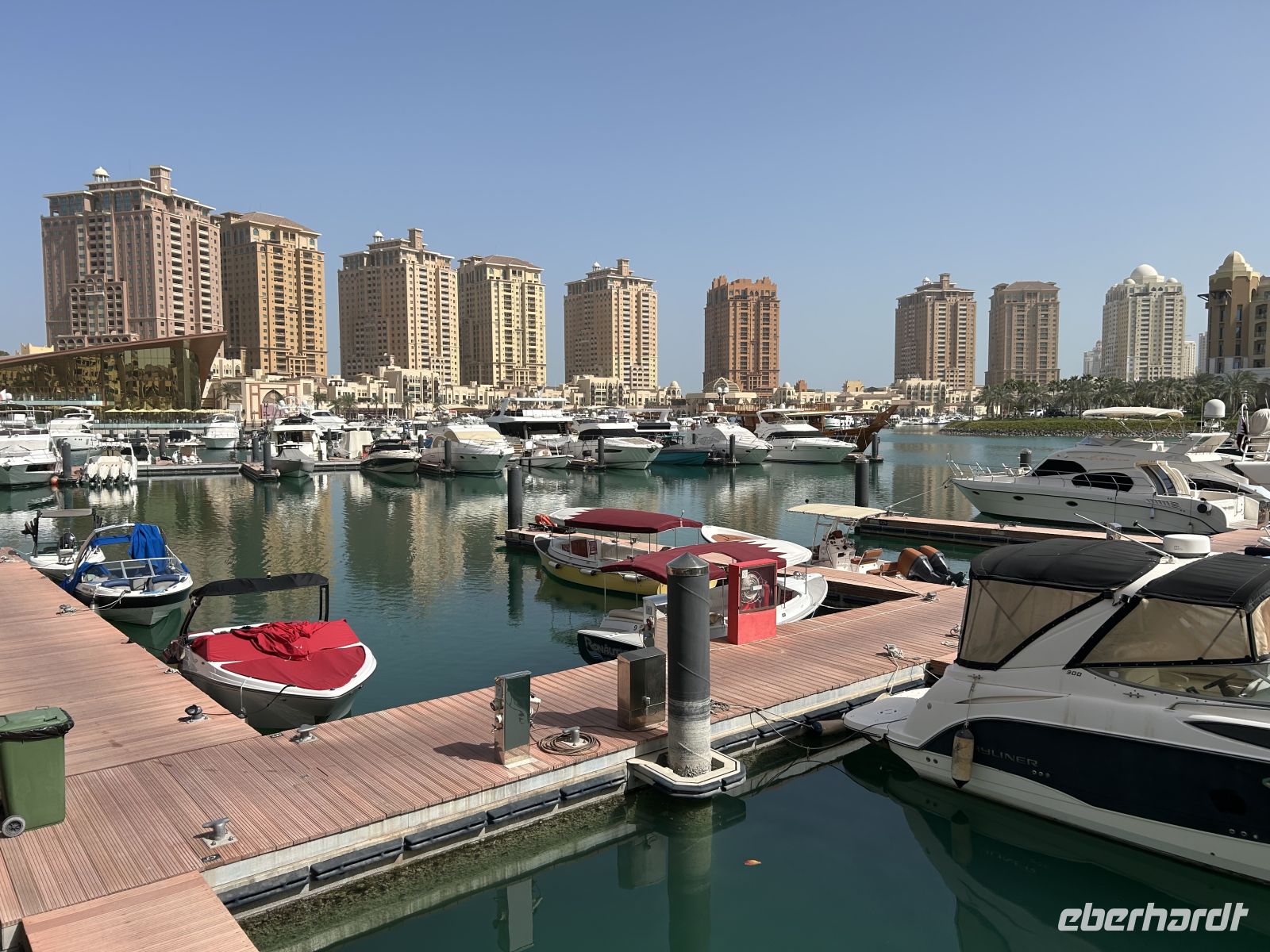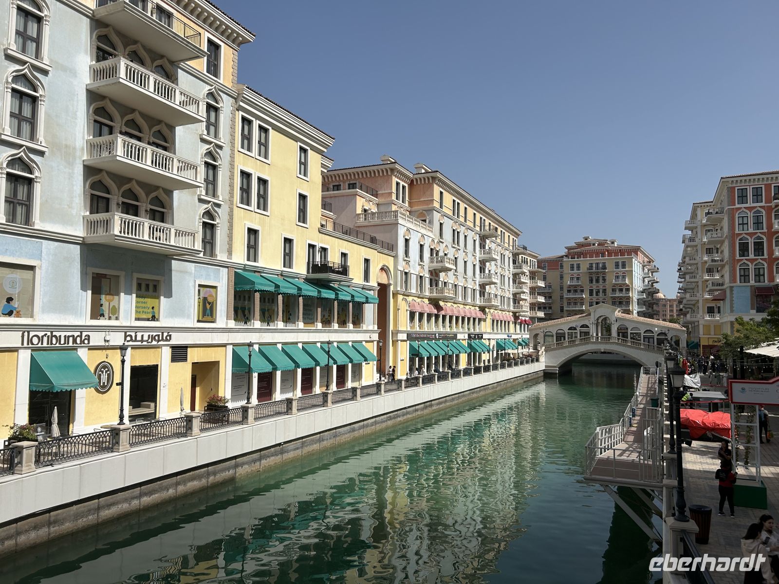 Ein Kontrastprogramm folgt mit einem entspannten Bummel an der Marina von The Pearl – mediterranes Flair, Yachten, Cafés, Promenade. Fast vergisst man, dass man sich mitten im Nahen Osten befindet. Dann reisen wir plötzlich nach Venedig – zumindest gefühlt. Ein Stopp im Qanat Quartier mit seinen bunten Fassaden, Brücken und Kanälen sorgt für viele Fotos und Staunen. Doha kann offensichtlich auch verspielt.