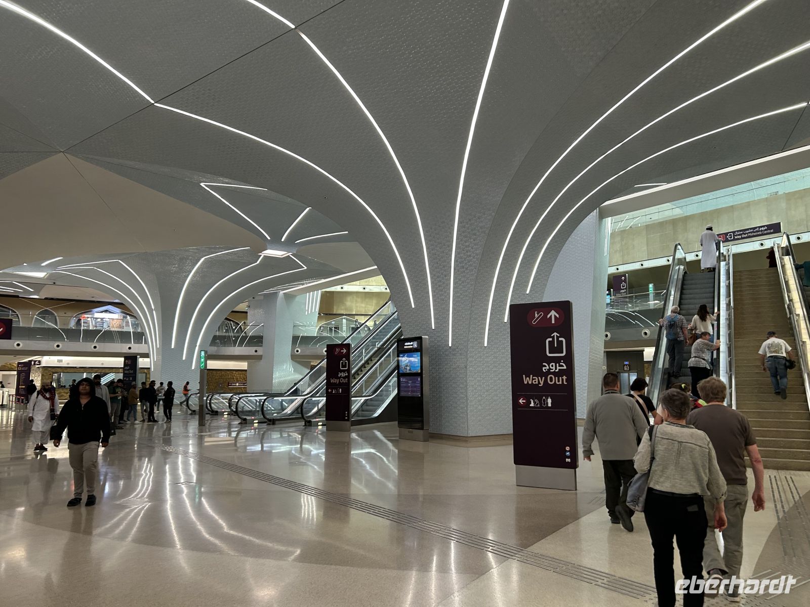 Anschließend steigen wir in die Metro – einfach, um dieses Erlebnis auch mitzunehmen. Den Eingang zu finden, ist gar nicht so leicht, aber am Ende klappt alles. Mit der hypermodernen, leisen und blitzsauberen Metro fahren wir bis nach Msheireb Downtown.