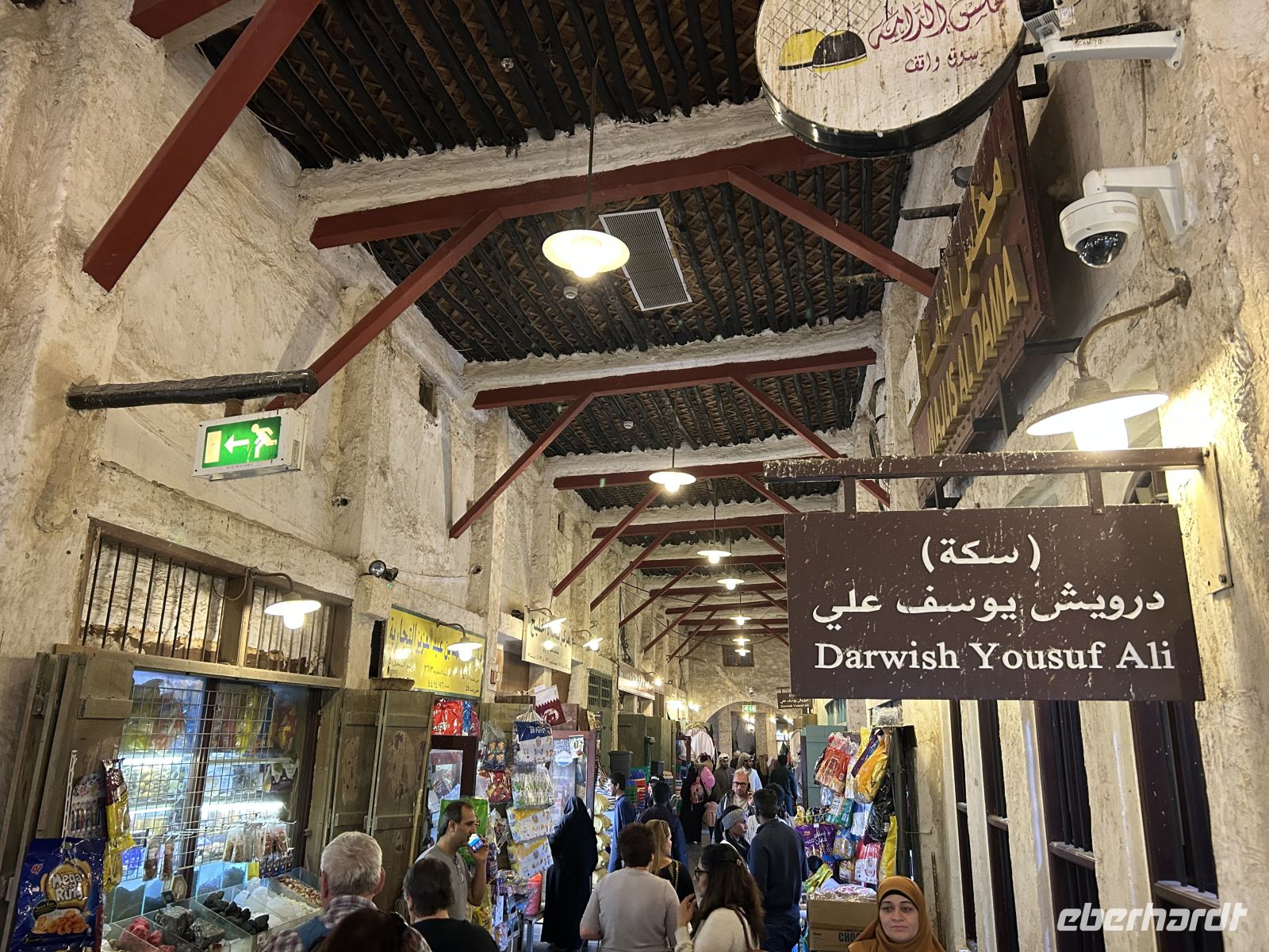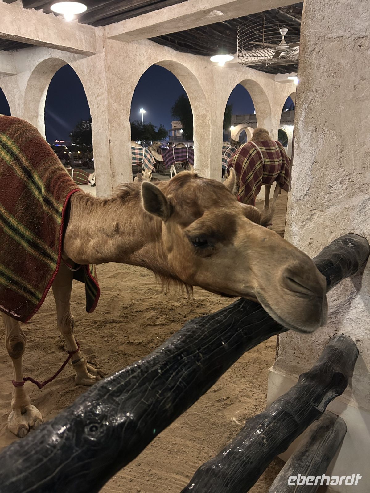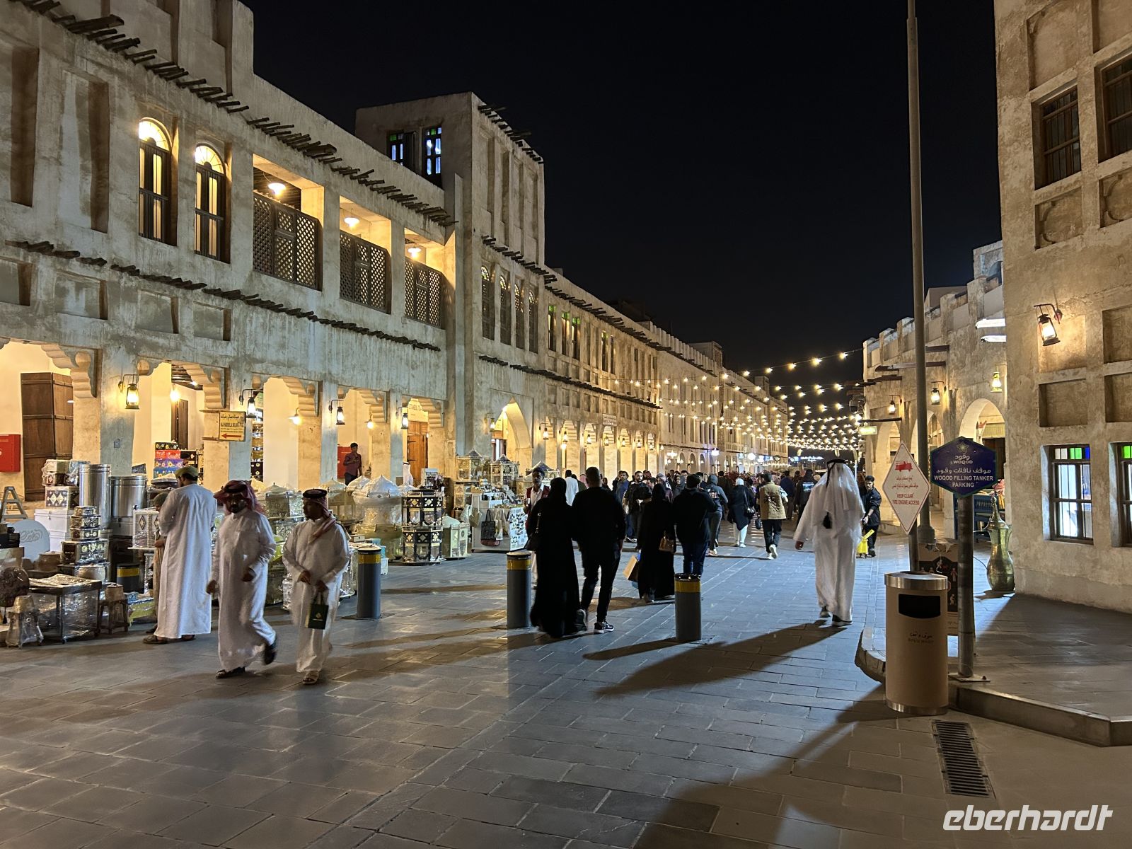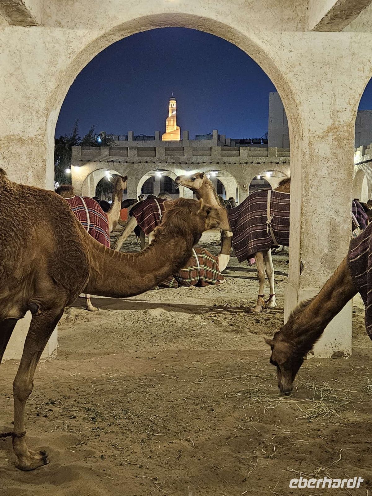 Dann geht es hinein ins Getümmel: Souq Waqif. Gerade am Freitagabend ist hier besonders viel los. Wir besuchen den Falken-Souq, bestaunen die königlichen Kamele, schlendern durch enge Gassen voller Gewürze, Stoffe, Souvenirs und Alltagsleben. Die Atmosphäre ist lebendig, warm, authentisch – genau so, wie man es sich wünscht.
