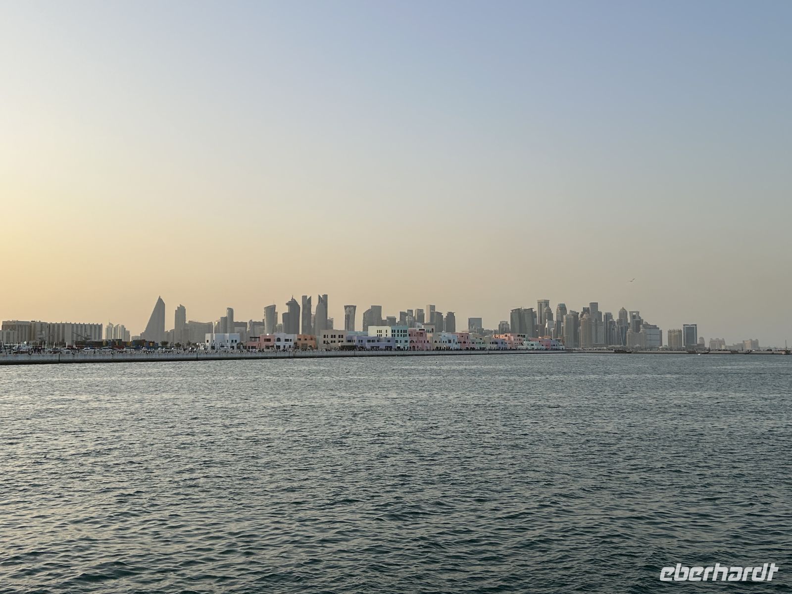 Zurück in Doha stoppen wir im Dafna Park in Westbay. Grünflächen, Wasser, und rundherum die beeindruckende Skyline – ein schöner Kontrast. Entlang der Corniche erreichen wir den Mina District, wo gleich zwei Kreuzfahrtschiffe im Hafen liegen. In dem bunten Viertel schlendern wir gemütlich umher oder genießen einen Kaffee – immer mit Blick auf die glitzernden Hochhäuser.