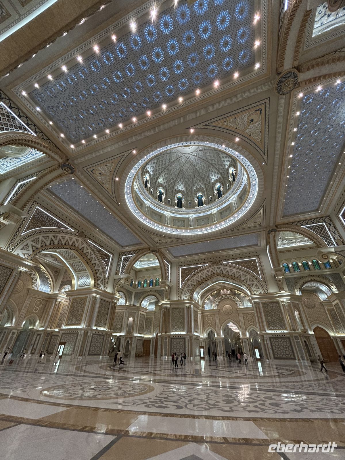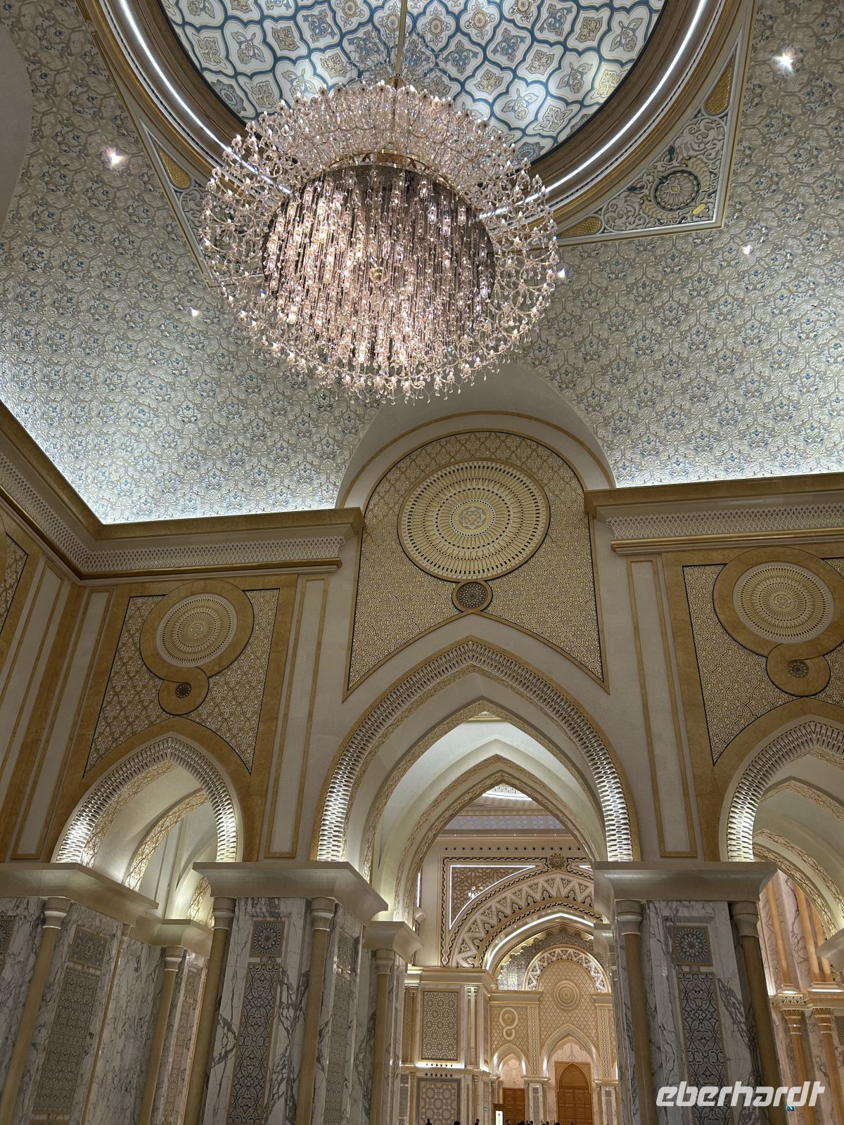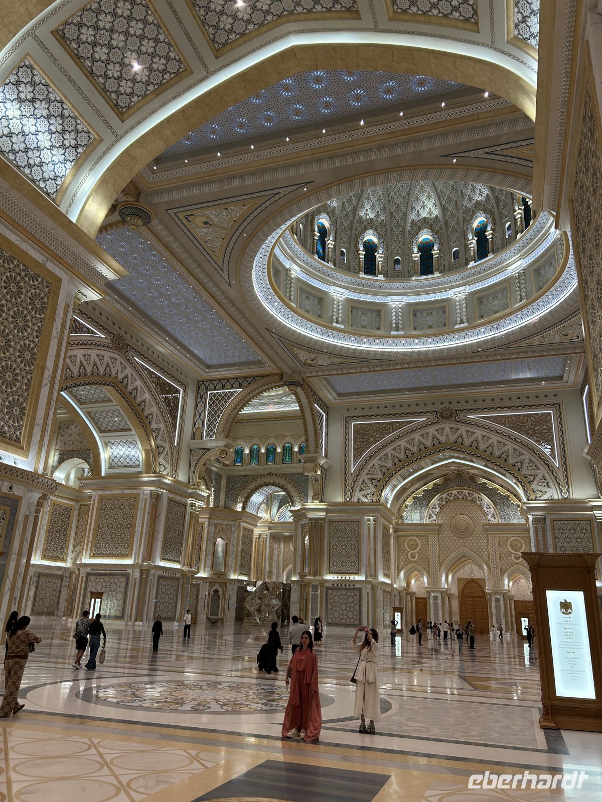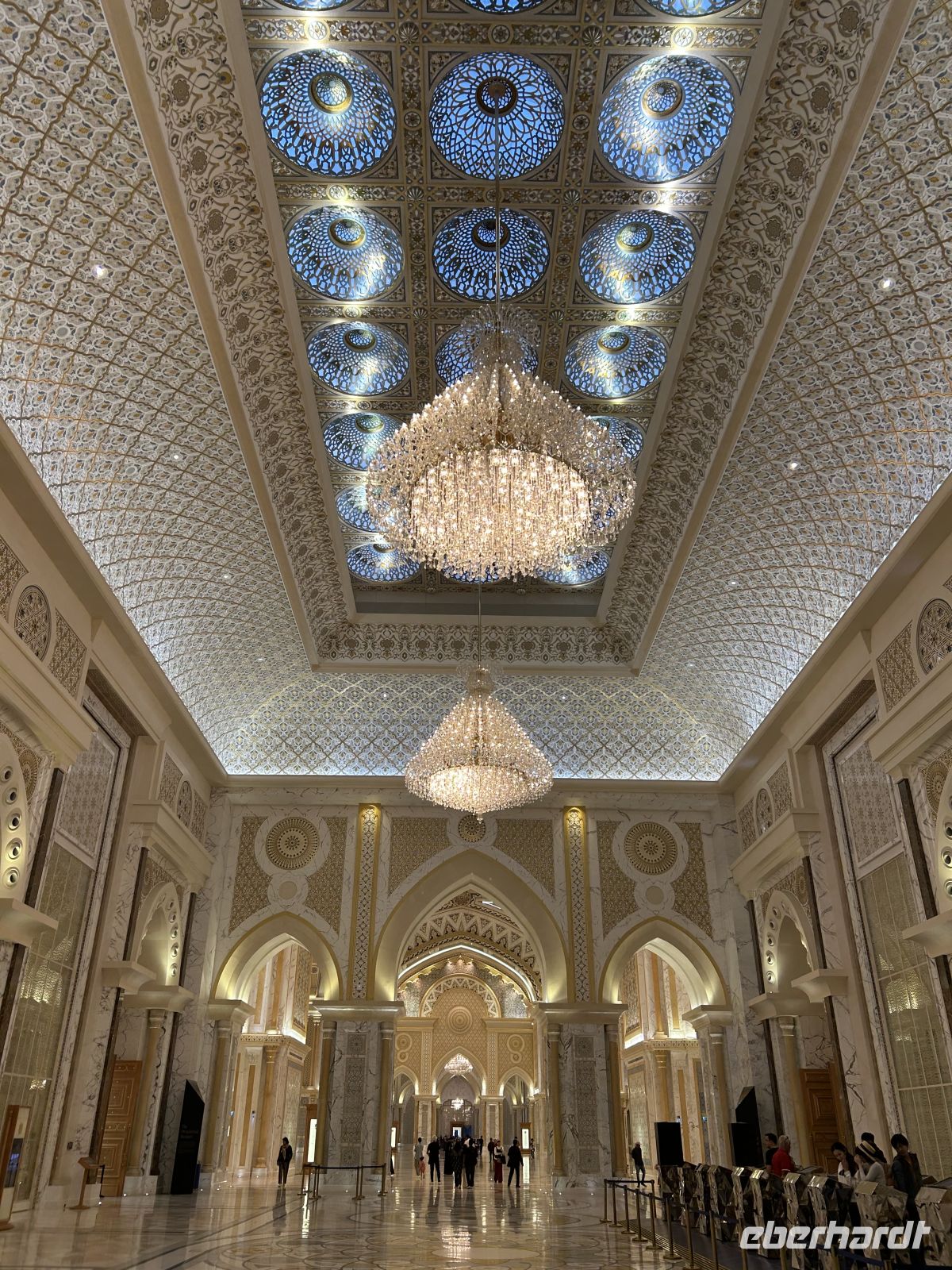 Der absolute Höhepunkt des Tages wartet jedoch am Nachmittag: der Besuch des Qasr Al Watan, des Präsidentenpalastes. Schon von außen beeindruckend, entfaltet er im Inneren seine ganze Wirkung. Prunkvolle Hallen, gewaltige Kuppeln, feinste Ornamente und viel Symbolik. Qasr Al Watan ist kein Wohnpalast, sondern ein Ort der Staatsrepräsentation, des Dialogs und der Bildung. Hier wird politische Geschichte erzählt, Wissen vermittelt und gleichzeitig die kulturelle Identität der VAE gezeigt.