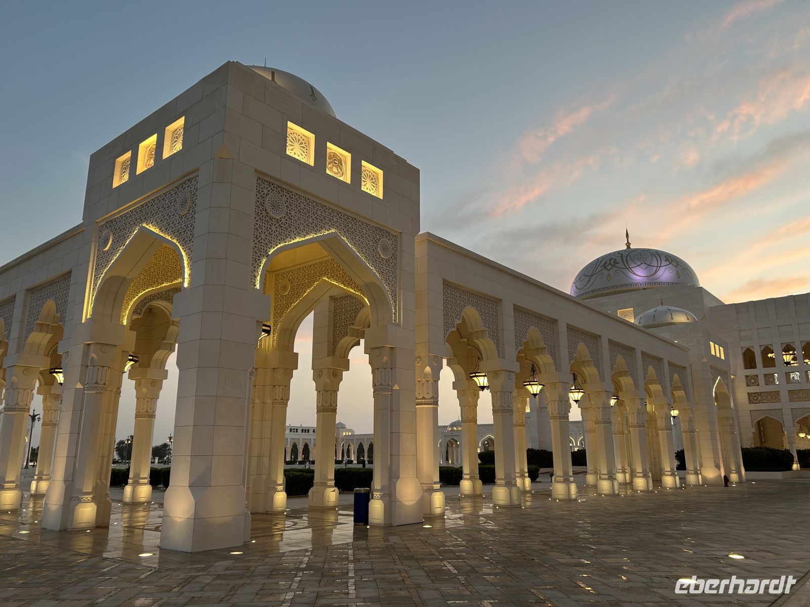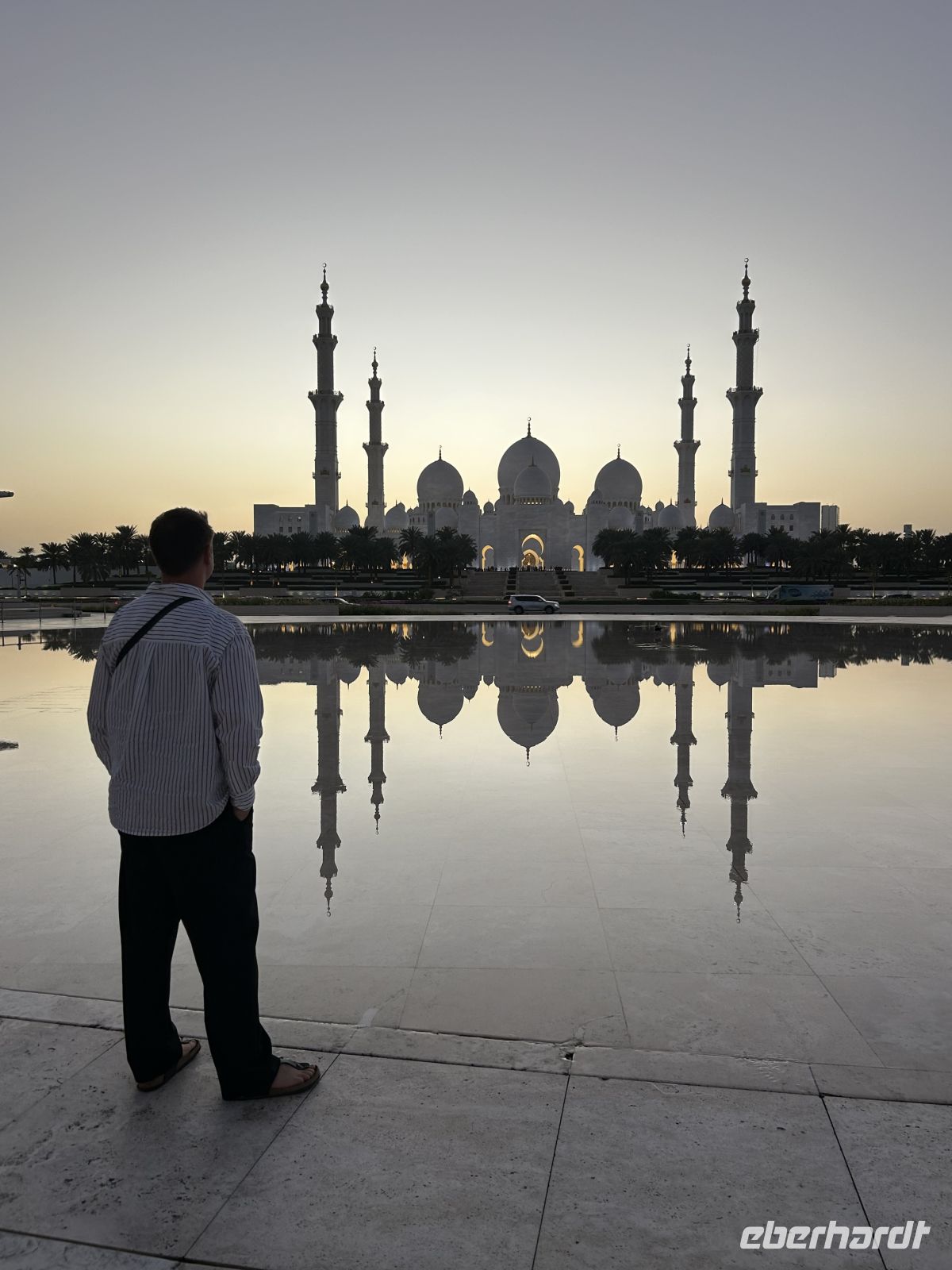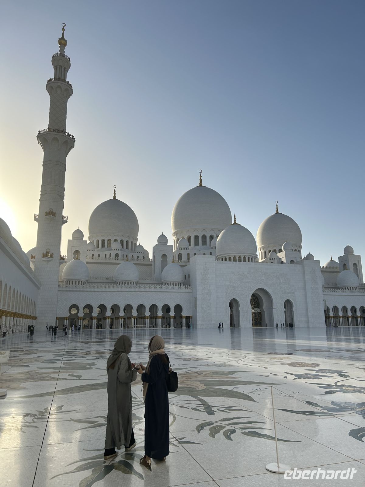 Ein weiteres Highlight des Tages folgt am späten Nachmittag: der Besuch der Sheikh Zayed Grand Moschee. Auch wenn der neue Zugang über die Shopping Mall etwas kommerziell wirkt, schmälert das den Eindruck kein bisschen. Die Moschee ist schlicht gigantisch: eine der größten der Welt, Platz für über 40.000 Gläubige, 82 Kuppeln, mehr als 1.000 Säulen, der größte handgeknüpfte Teppich der Welt und gewaltige Kronleuchter aus Swarovski-Kristallen. Weißer Marmor, feine Intarsien, florale Muster – alles wirkt harmonisch, ruhig und erhaben. Wir haben den Besuch bewusst auf den späten Nachmittag gelegt. Das Licht wird weicher, die Farben wärmer – und wir erleben sogar noch den Sonnenuntergang. Ein magischer Moment.