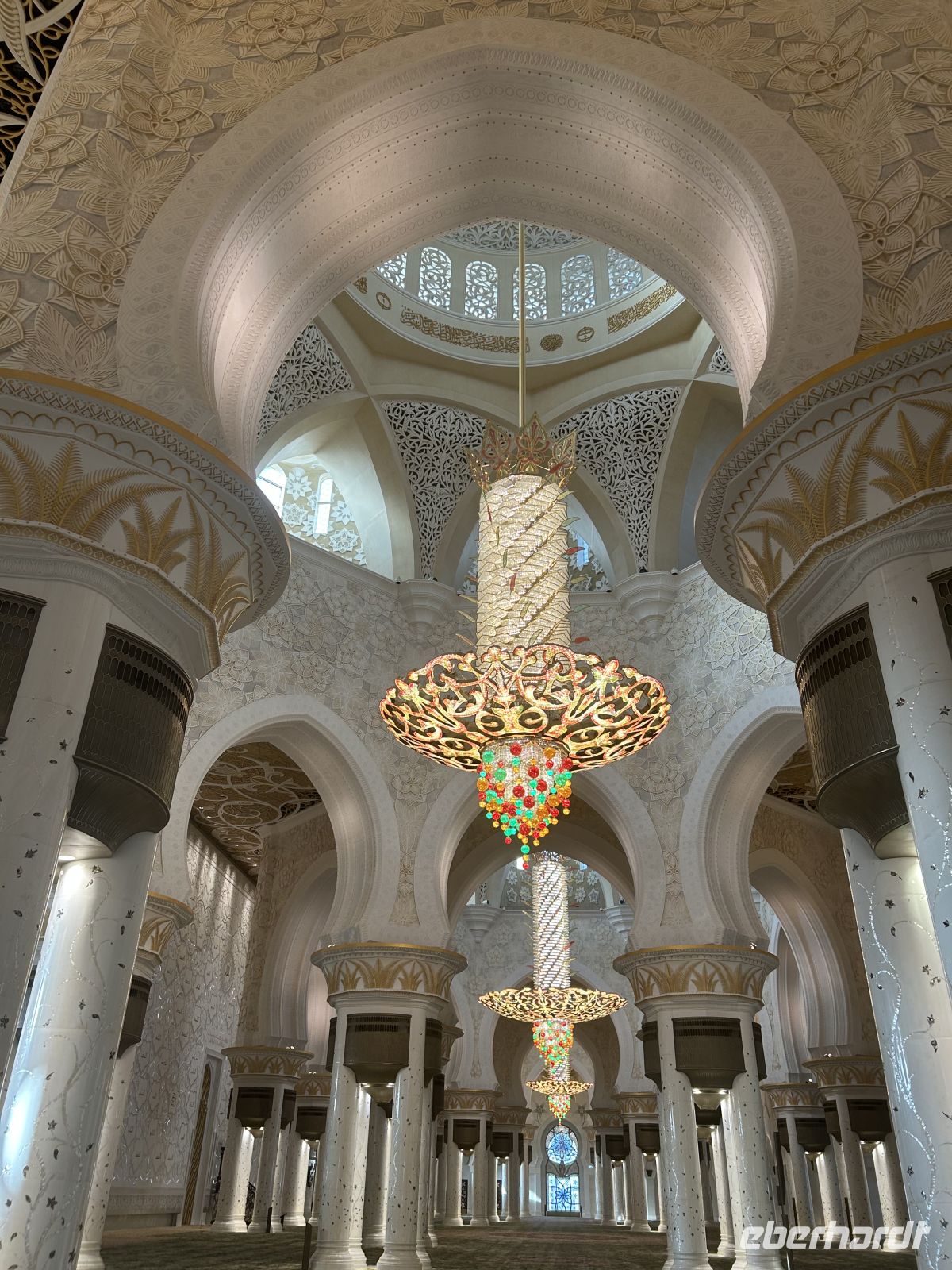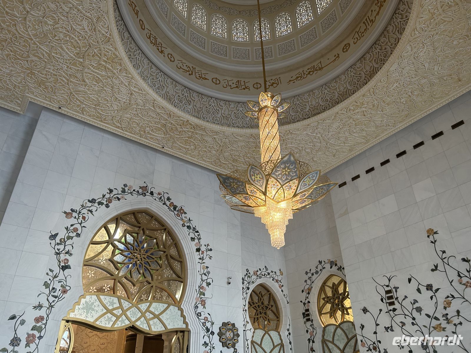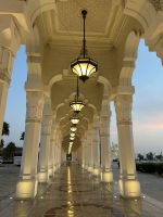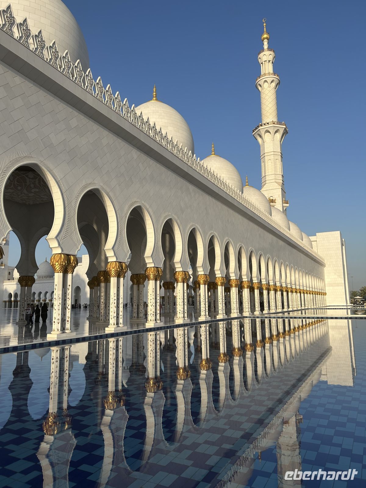 Ein weiteres Highlight des Tages folgt am späten Nachmittag: der Besuch der Sheikh Zayed Grand Moschee. Auch wenn der neue Zugang über die Shopping Mall etwas kommerziell wirkt, schmälert das den Eindruck kein bisschen. Die Moschee ist schlicht gigantisch: eine der größten der Welt, Platz für über 40.000 Gläubige, 82 Kuppeln, mehr als 1.000 Säulen, der größte handgeknüpfte Teppich der Welt und gewaltige Kronleuchter aus Swarovski-Kristallen. Weißer Marmor, feine Intarsien, florale Muster – alles wirkt harmonisch, ruhig und erhaben. Wir haben den Besuch bewusst auf den späten Nachmittag gelegt. Das Licht wird weicher, die Farben wärmer – und wir erleben sogar noch den Sonnenuntergang. Ein magischer Moment.