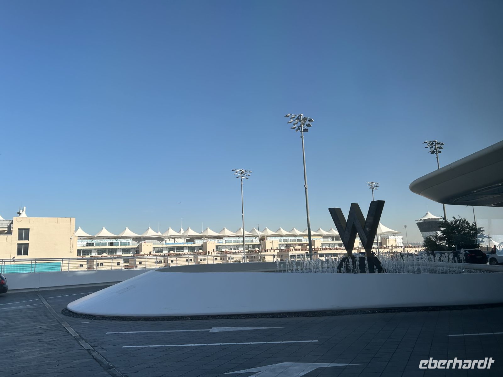 Unser erstes Ziel ist die Yas Insel, Abu Dhabis Freizeit- und Eventinsel. Hier befinden sich unter anderem der Formel-1-Circuit, große Hotels, Freizeitparks und Marinas. Alles ist weitläufig, modern und auf Erlebnis ausgelegt. Unser Plan: ein Stopp am legendären W Hotel direkt am Yas Marina Circuit. Leider bleibt es nur beim Versuch – keine Ausstiegsmöglichkeit, nur eine kurze Runde mit dem Bus.