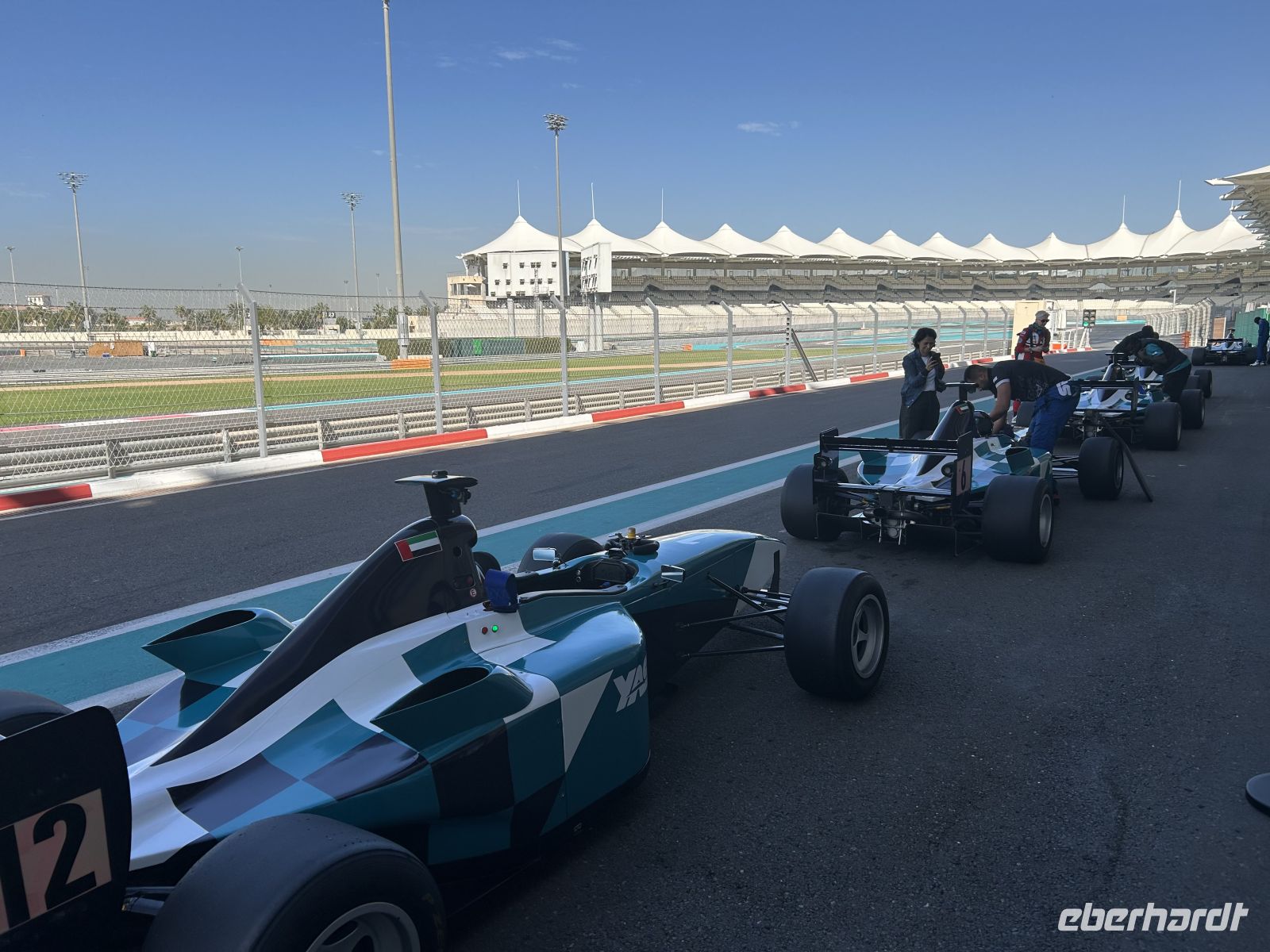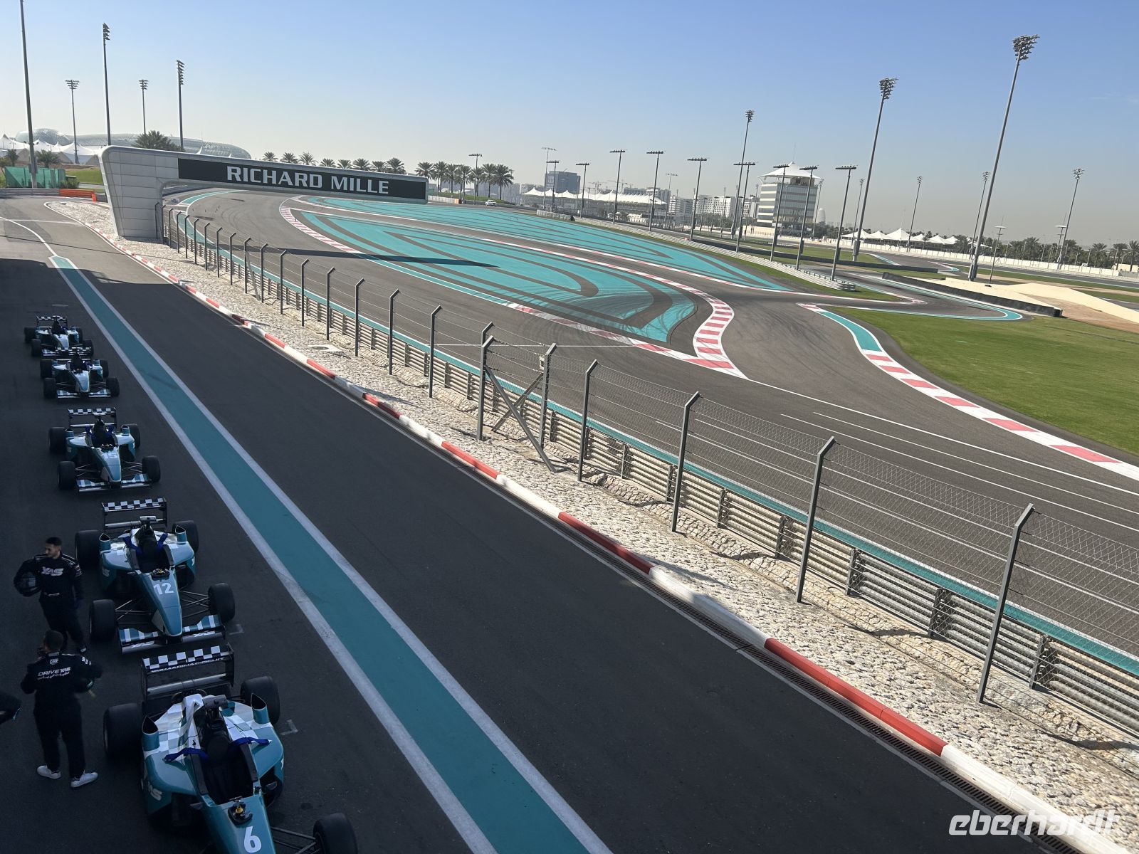 Wir erreichen die Yas Kartzone, dürfen aussteigen und stehen plötzlich direkt an der Strecke – mit Blick auf die Nordkurve. Und dann wird es laut. Sehr laut. Gerade starten einige junge Männer mit Formel-3-Autos zu ein paar schnellen Runden. Motoren heulen, der Asphalt vibriert, der Geruch von Benzin liegt in der Luft. Wir erleben die Strecke mit allen Sinnen. Ein völlig ungeplanter Moment – und genau deshalb so besonders. Begeisterung bei allen, breite Grinsen, viele Videos. Das war Motorsport pur.