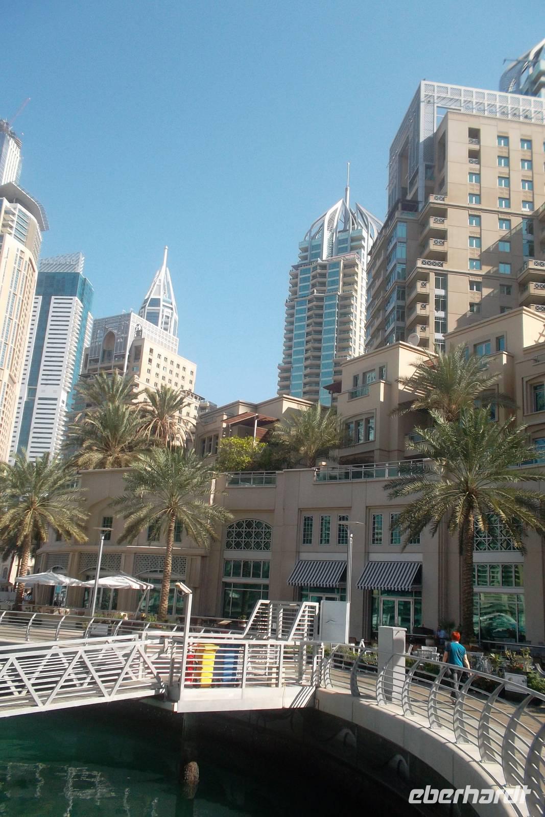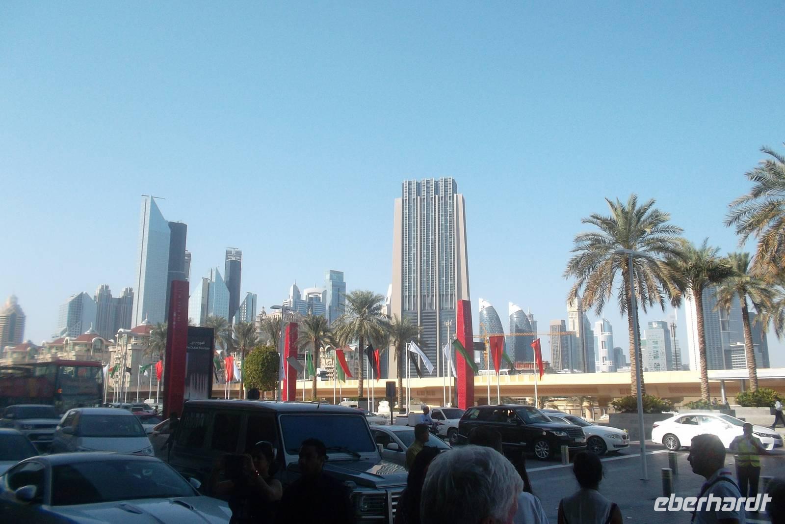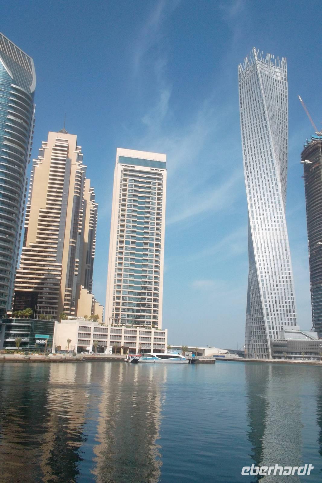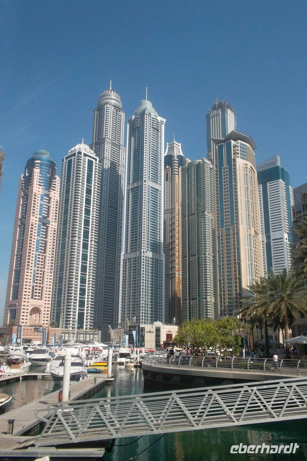 Frühmorgens war unsere Ankunft in Dubai. Nach Passieren der Grenz und Zollkontrolle wurden wir von unserem Reiseleiter Wassim abgeholt. Seinem Vorschlag folgend holten wir uns zunächst Eindrücke vom modernen Dubai auf einer Fahrt quer durch die größte Metropole der arabischen Emirate und etwas Freizeit am Yachthafen mit seiner Hochhaus-Architektur. Der sagenhafte Reichtum der Vereinigten Arabischen Emirate, allen voran Abu Dhabi und Dubai, hat eine Bautätigkeit und Städte der Superlative hervorgebracht, die wohl mit nichts anderem auf der Welt vergleichbar sind. Die Quelle für diesen Reichtum und die von ihm ausgelösten Aktivitäten sind einerseits immense Ölvorräte, aber auch eine sehr günstige Handelslage, die den VAE Brückenfunktion zwischen Europa, dem Nahen Osten und Asien ermöglicht. Das zeigt sich auch im Ausbau der Flughäfen Dubai und Abu Dhabi und der Nationalcarrier „Emirates" und „Etihad", die im Vergleich zur Größe des Landes ungeheure Dimensionen und Kapazitäten aufweisen.