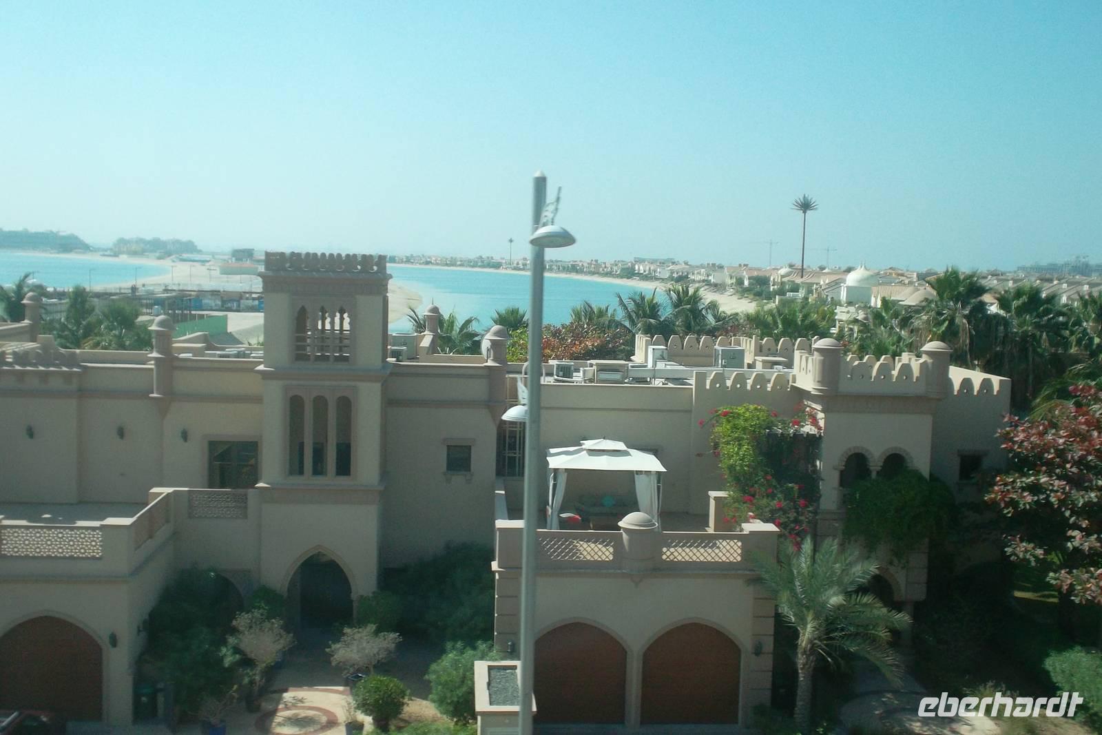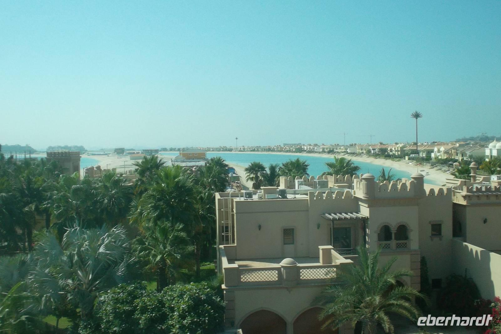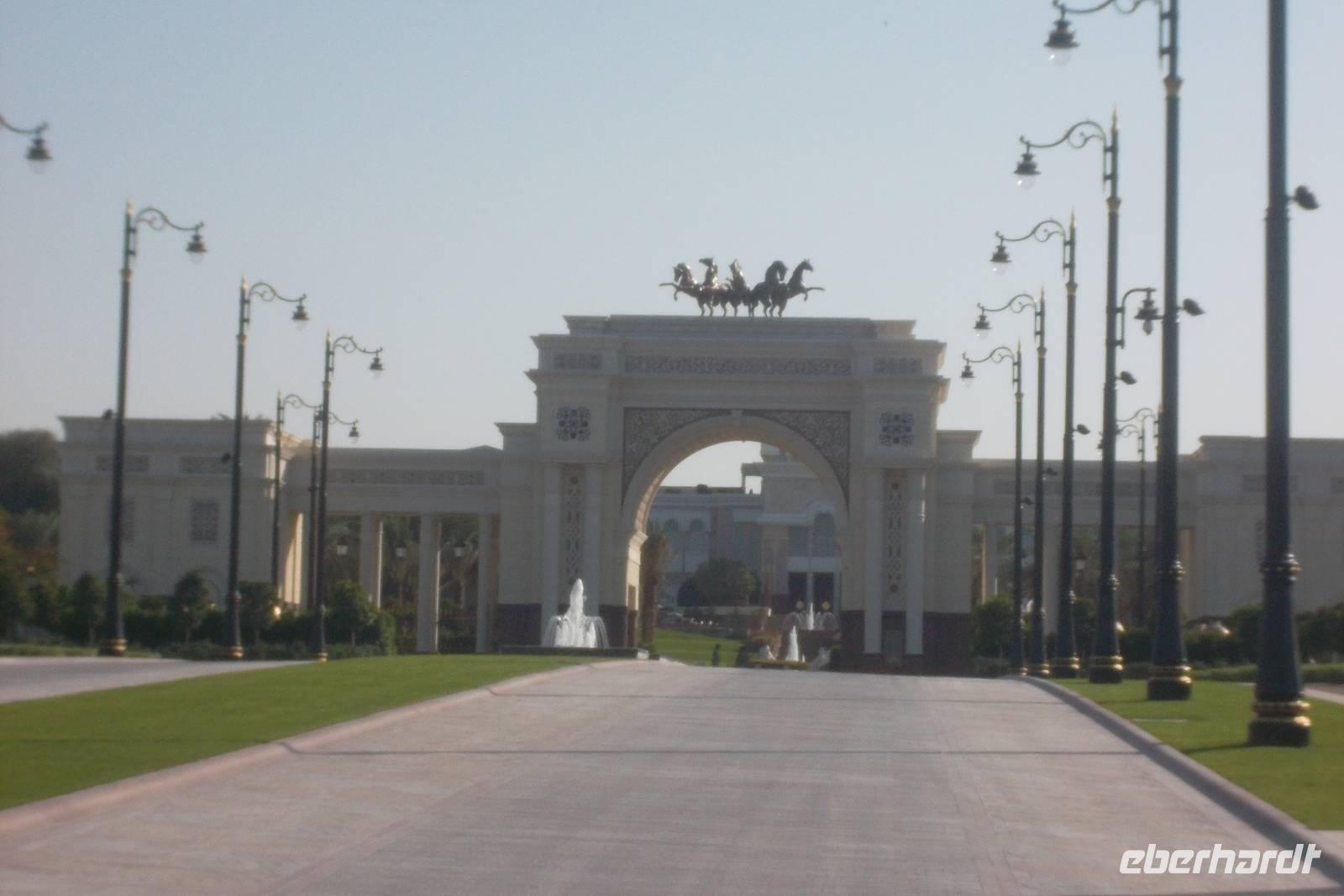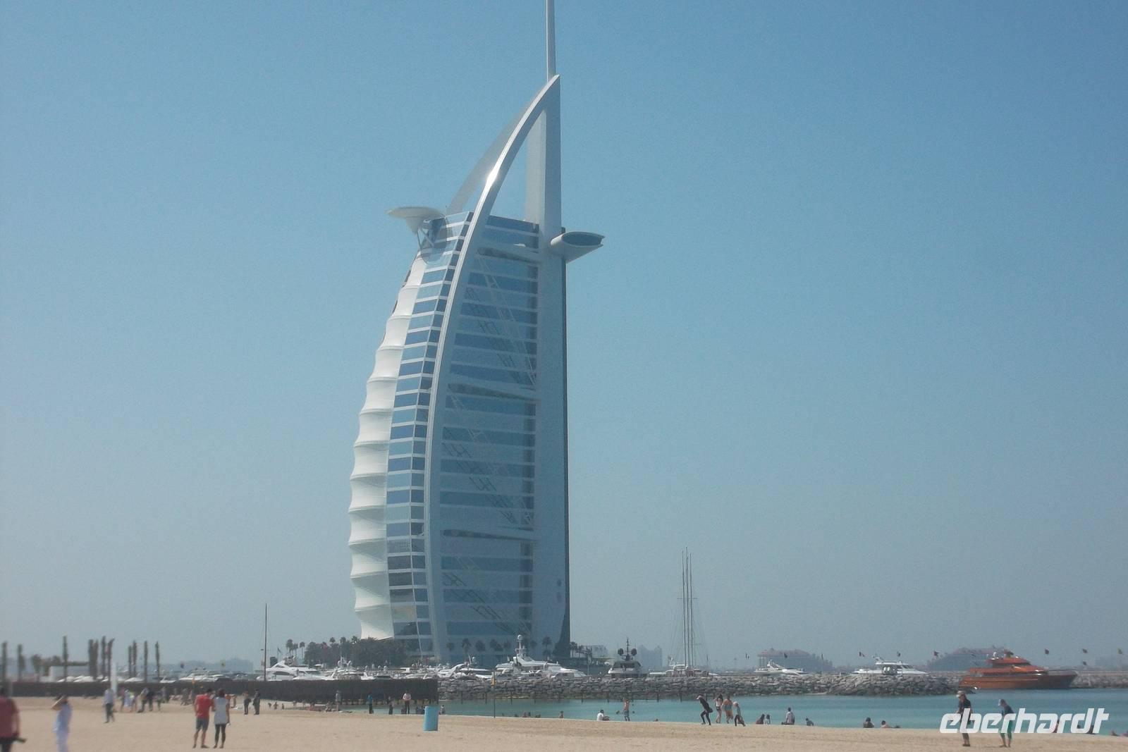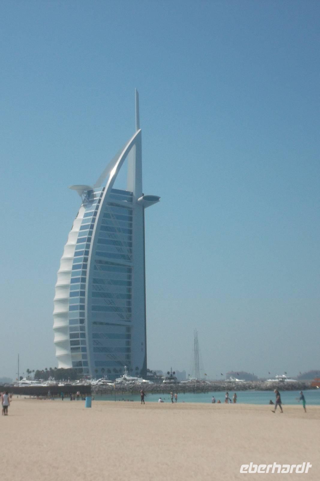 Dubais „Marina", der Jachthafen, wird von gewaltigen Wolkenkratzern umstanden, manche davon in sehr origineller Architektur. Nach kurzem Aufenthalt hier war der nächste Höhepunkt im modernen Dubai die Fahrt zum „The Palm" Jumeirah. In Form einer Palme mit einem etwa 4 km langen „Stamm" und 16 „Wedeln" sowie einem vorgelagerten kreisförmigen Schutz gegen Sturmfluten wurden hunderttausende Kubikmeter Sand und Steine aufgeschüttet, die man de facto nur aus der Luft in ihrer Form als Palme erkennen kann. Das seit 2001 laufende ehrgeizige Bauprojekt ist jetzt nahezu abgeschlossen - die im Meer liegende Palme aus Sand wurde inzwischen bepflanzt und bebaut. Wir erreichten auf gut ausgebauter Straße den Atlantis-Hotel- und Freizeitkomplex. Hier erfuhren wir, dass es ein (fast) originalgetreuer Nachbau des gleichnamigen Komplexes auf den Bahamas ist und wie das Original zur Hotelkette „Sun International" des Südafrikaners Sol Kerzner gehört. Das Riesenhotel mit über 1500 Zimmern ist über Straßen, per Boot und über eine Einschienenbahn zu erreichen, die es mit dem Festland Dubais verbindet. Im Sinne unserer „Richtig Reisen!"-Idee machten auch wir die Rückfahrt mit der Monorail, die etwas mehr von der aufgeschütteten Insel zeigt und von der man einen Eindruck bekommt, dass man sich tatsächlich auf Sandbänken in Palmwedelform befindet. Nach Abholung vom Endbahnhof durch unseren Bus mit Reiseleiter Wassim gab es einen Fotostopp nahe dem nächsten Superlativ, dem Hotel „Burj-al-Arab". Das bekannteste Hotel der Emirate in Form eines geblähten Segels ist mit 321 m das vierthöchste Hotelgebäude der Welt und beeindruckt schon von Ferne.