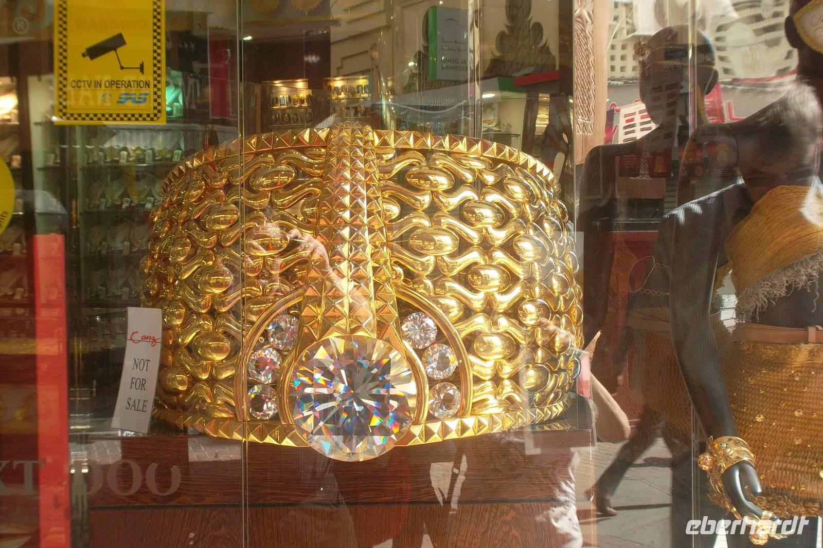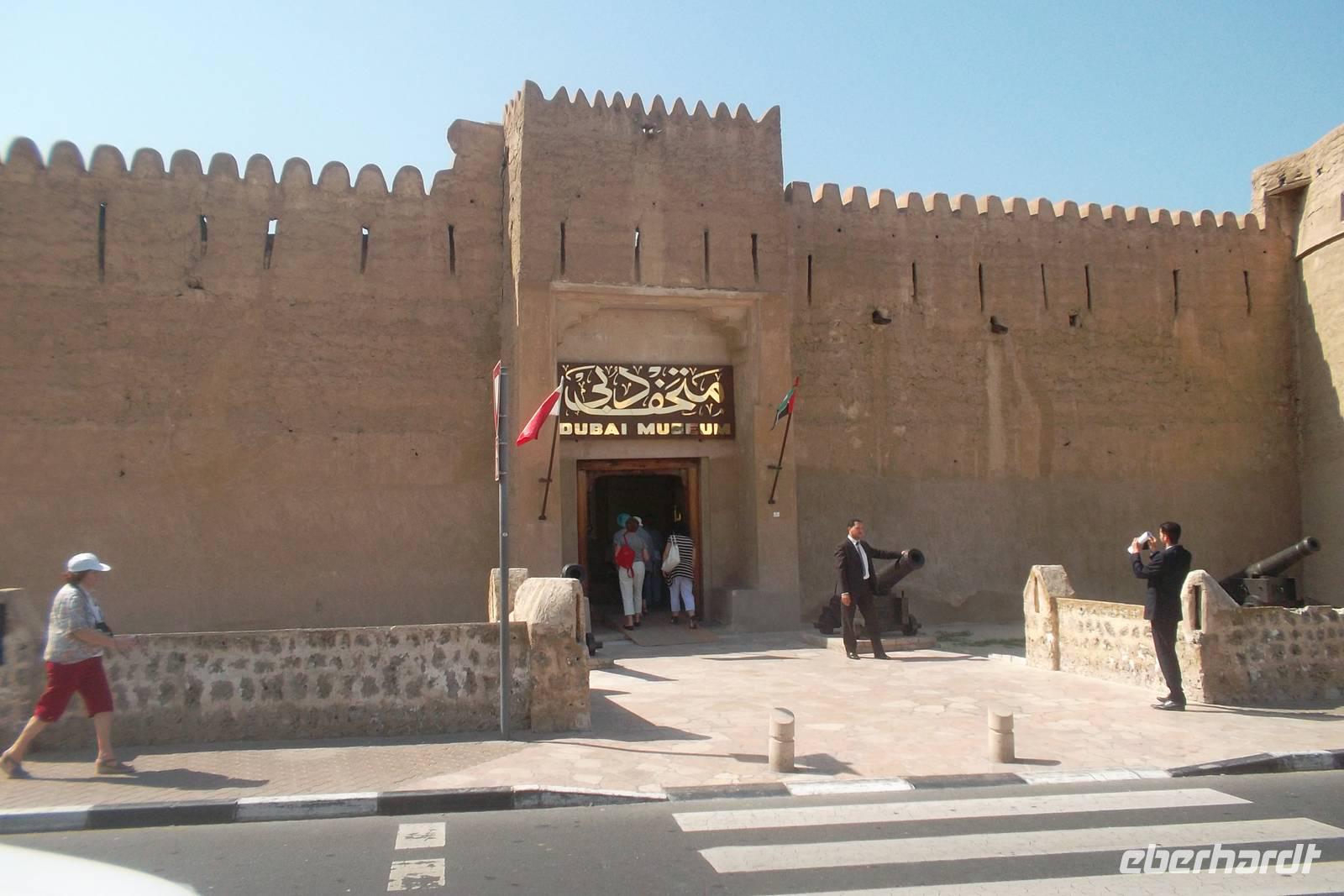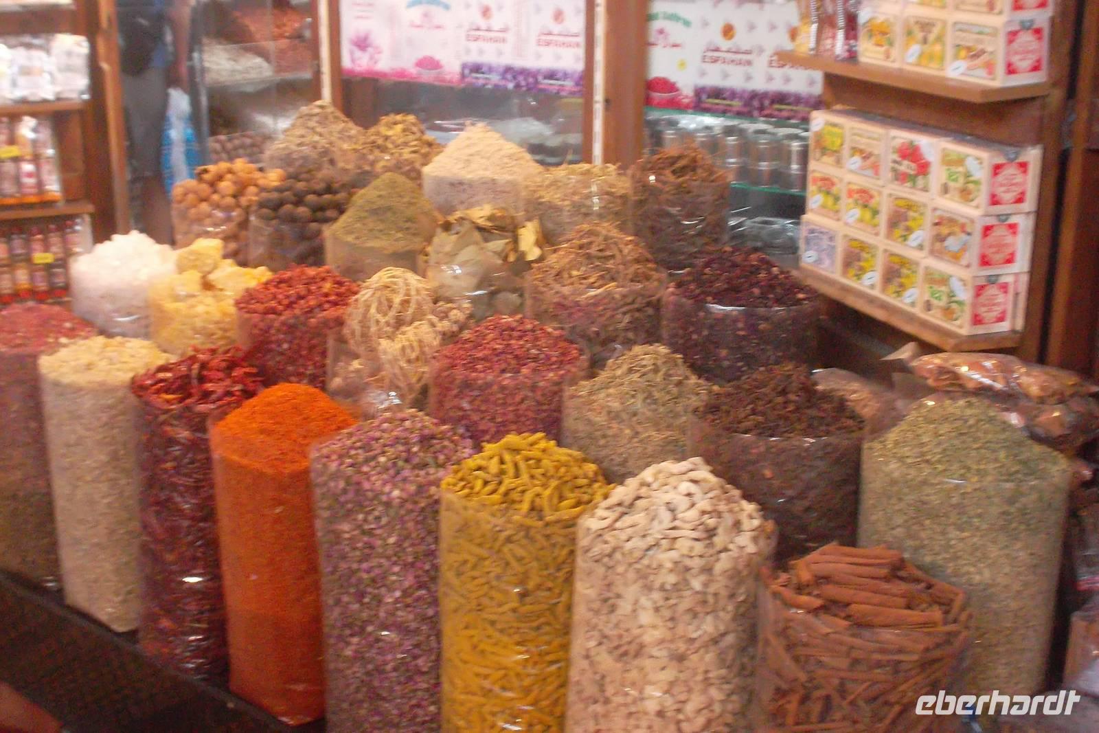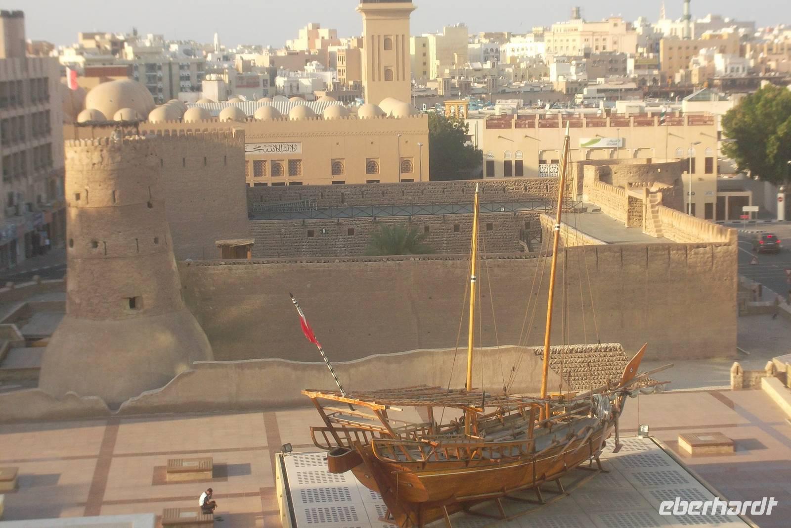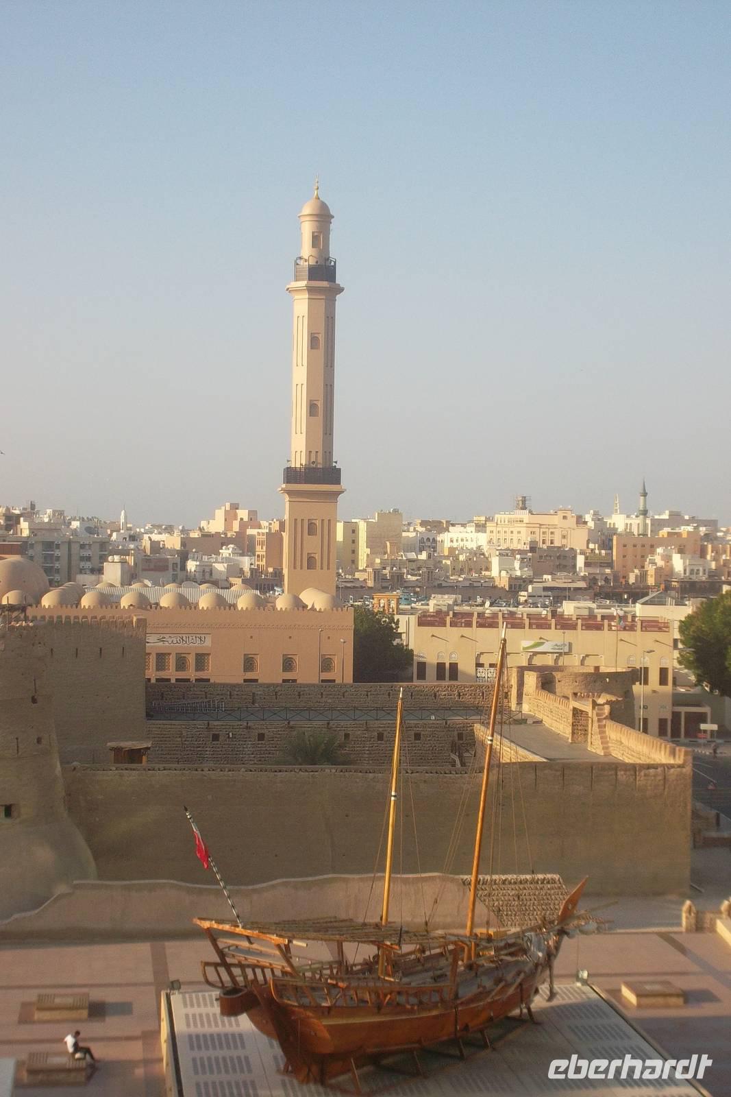 Die Altstadt mit dem Besuch des Dubai-Museum, das größtenteils unterirdisch in der alten Fahidi-Festung untergebracht ist, war der nächste Programmpunkt. Hier kann man nicht nur die Architektur des alten Wehrbaues mit seinen Lehmmauern bewundern, man erkennt auch die uralten, zur Kühlung dienenden Windtürme und kann sich in den Museumsräumen ein Bild vom Leben im alten Dubai machen. Dann nutzten wir zur Weiterfahrt zünftig eine traditionelle Abra, ein Fährboot über den Dubai Creek. Hier erreichten wir sogleich den Gewürz-Soukh, in dem sich die Gerüche feinster Gewürze mischen und man die Farben, Düfte und das Flair des Orients in sich aufnehmen konnte. Hier und im benachbarten Gold-Soukh ergab sich endlich der Eindruck, wirklich in Arabien zu sein. Wir bummelten an den diversen Geschäften vorbei, immer wieder von Händlern begleitet, die uns die Vorzüge ihrer Gewürze und sonstigen Waren schilderten und am Goldsoukh schließlich bestaunten wir den größten Ring der Welt mit 56 kg 18karätigem Gold - aber leider(!) unverkäuflich...