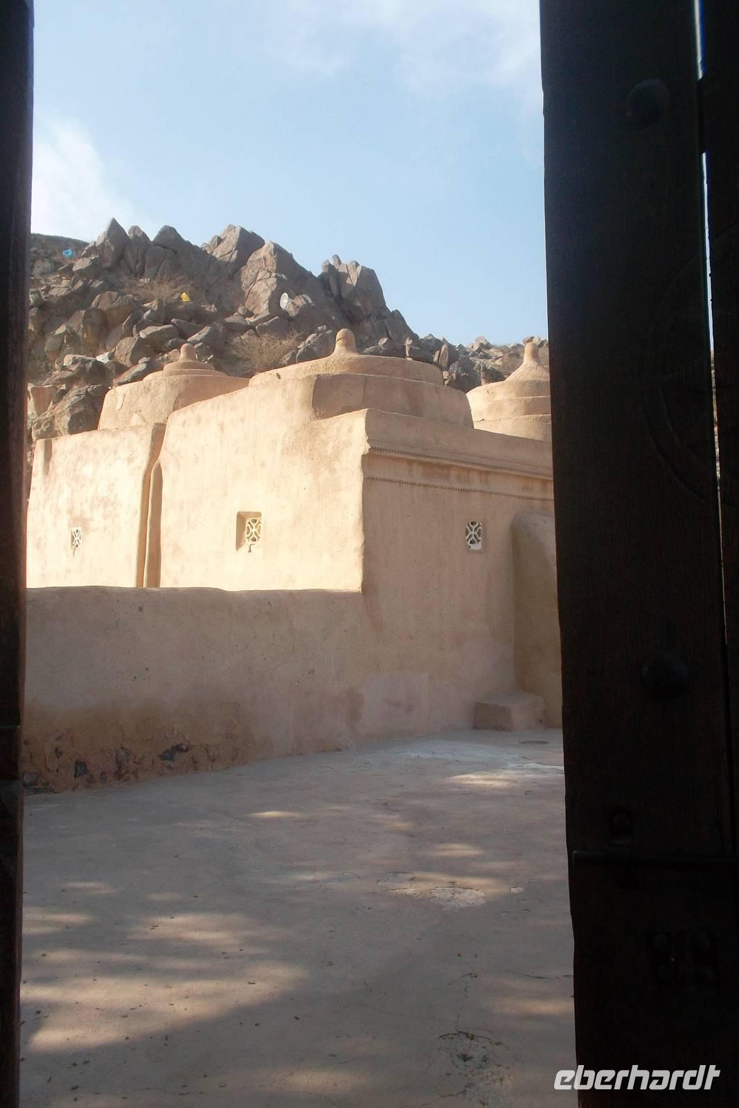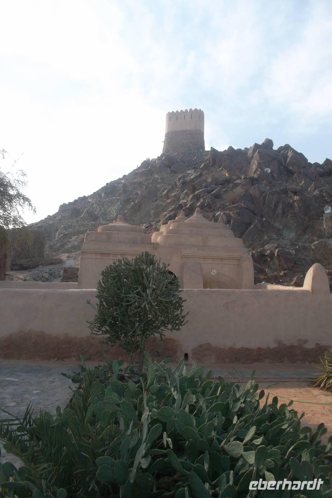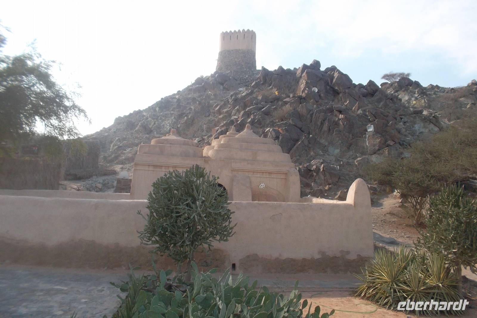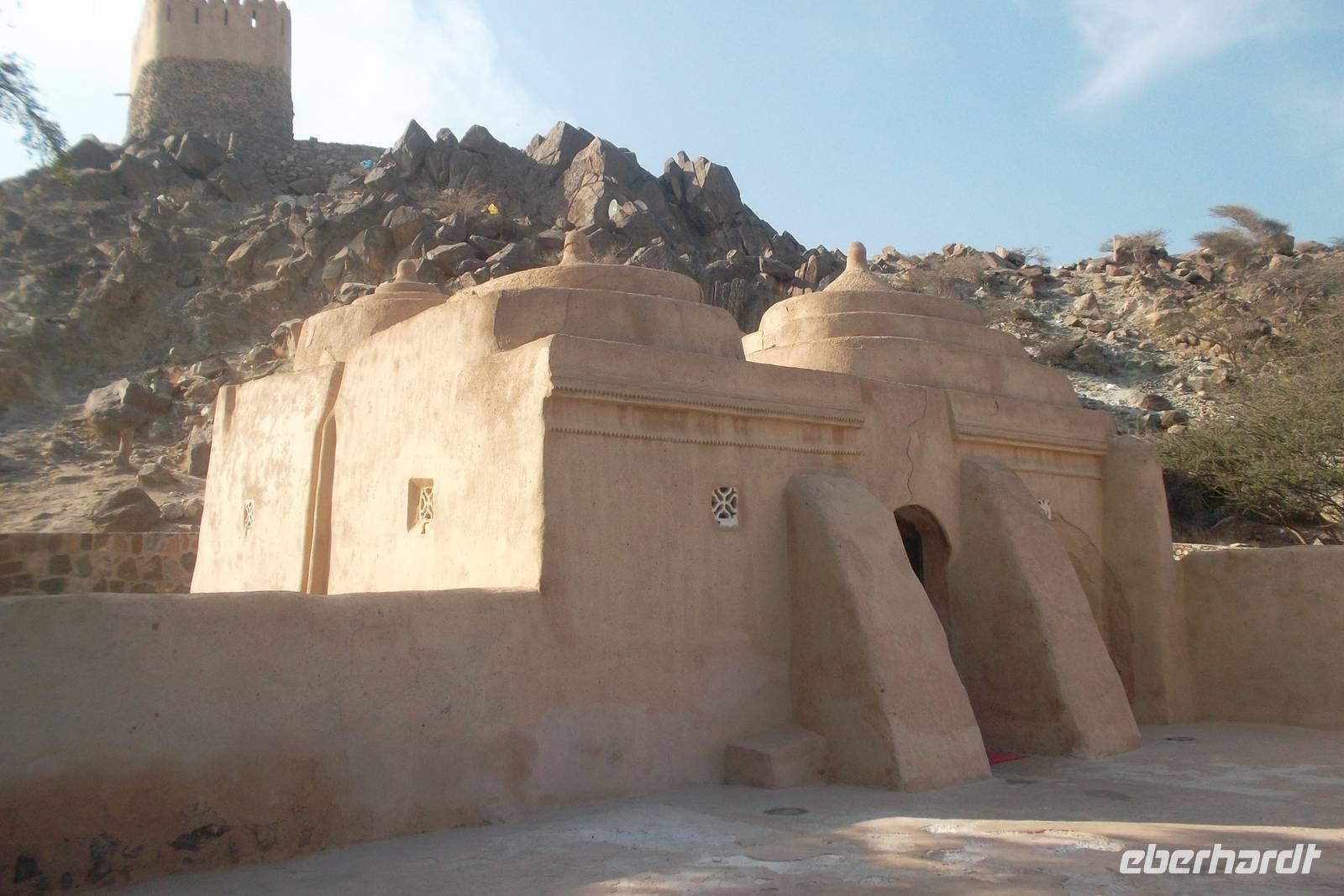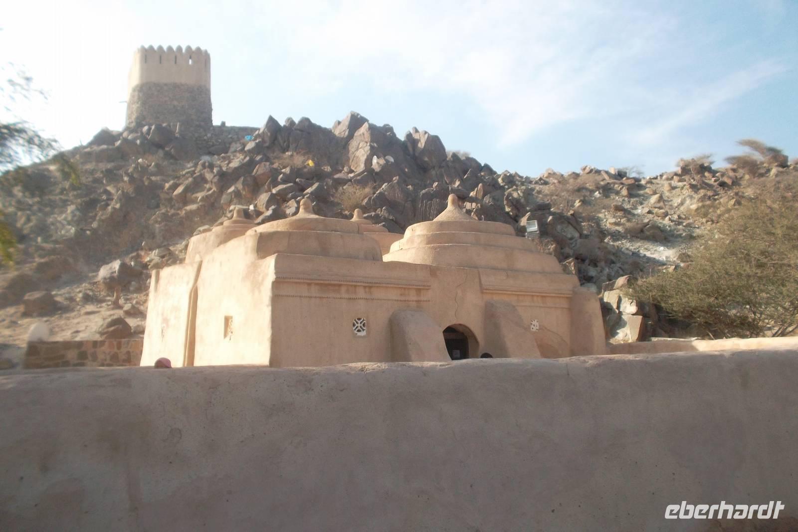 Bei der anschließenden Fahrt durch das Emirat Fujairah machten wir zunächst Halt an der ältesten Moschee der Emirate. Das mehrere Jahrhunderte alte Bauwerk aus Lehm weist eine völlig andere Architektur auf als alle Moscheen, die wir sonst sahen: mit ihren von vier kleinen, kreisrunden Lehmglocken überkuppelten Gebetsräumen und dem etwas entfernt auf einem Hügel aufragenden Wachturm wirkt sie sehr altertümlich.