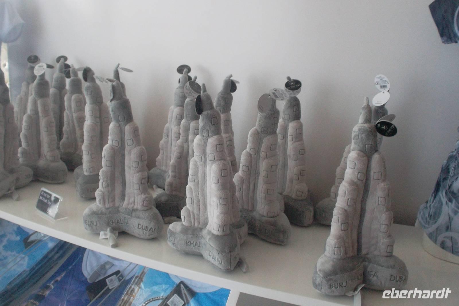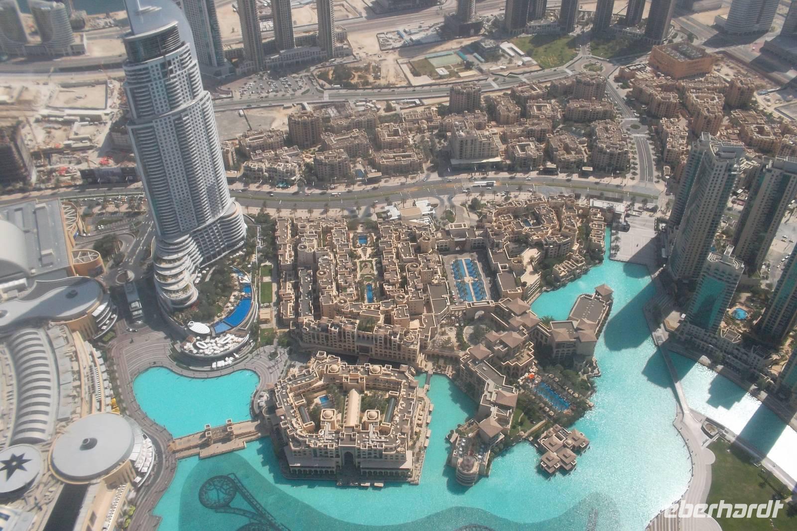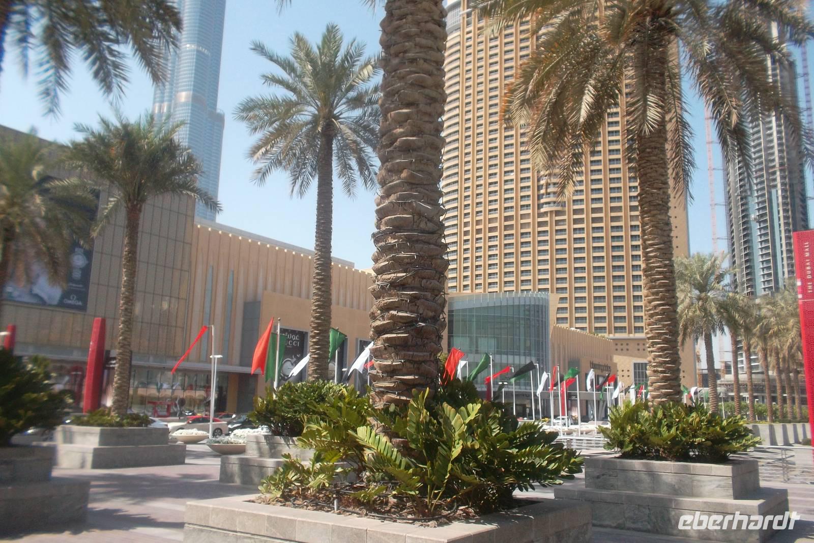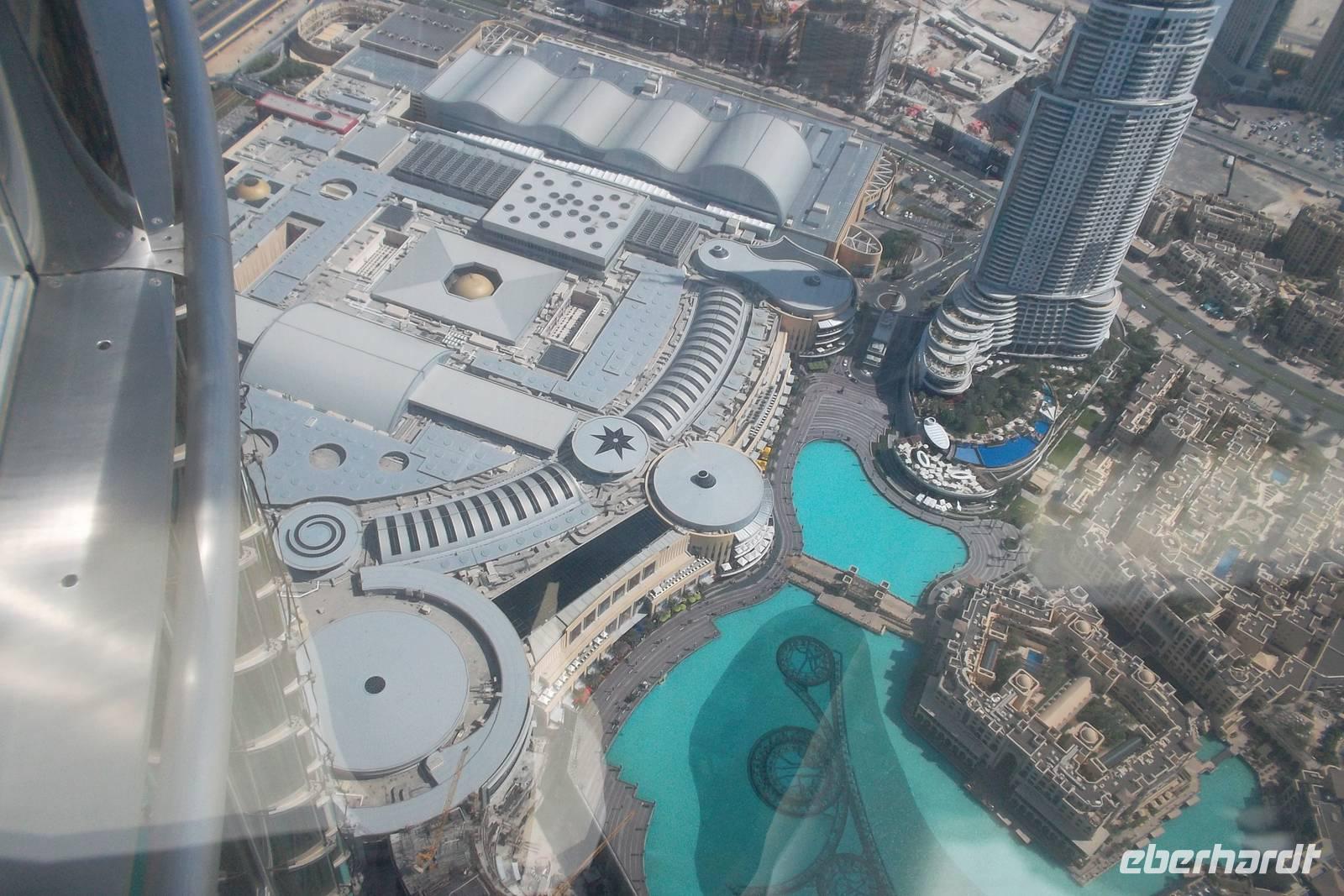 Später führte uns der Tag zur Dubai Mall, die mit über 1200 Geschäften und 350.000 m² Verkaufsfläche eines der größten Einkaufszentren der Welt darstellt. Gelungen ist in den riesigen Komplex eine Reihe von Attraktionen eingebunden - oder anders herum: um zu manch Sehenswertem zu gelangen, muss man ein Stück in der Mall an Geschäften und einigen der insgesamt 120 Restaurants entlangspazieren. Unser erstes Ziel war der höchste Turm der Welt, für den wir für 13.00 Uhr Besichtigungstickets hatten. Der 828 m hohe Superturm Burj Khalifa mit Hotels, Wohnungen, Büros und natürlich einer Aussichtsplattform steht direkt neben der Mall und einer hübschen Wasserlandschaft und der Eingang zu den Fahrstühlen ist mitten in der Café- und Geschäftswelt.