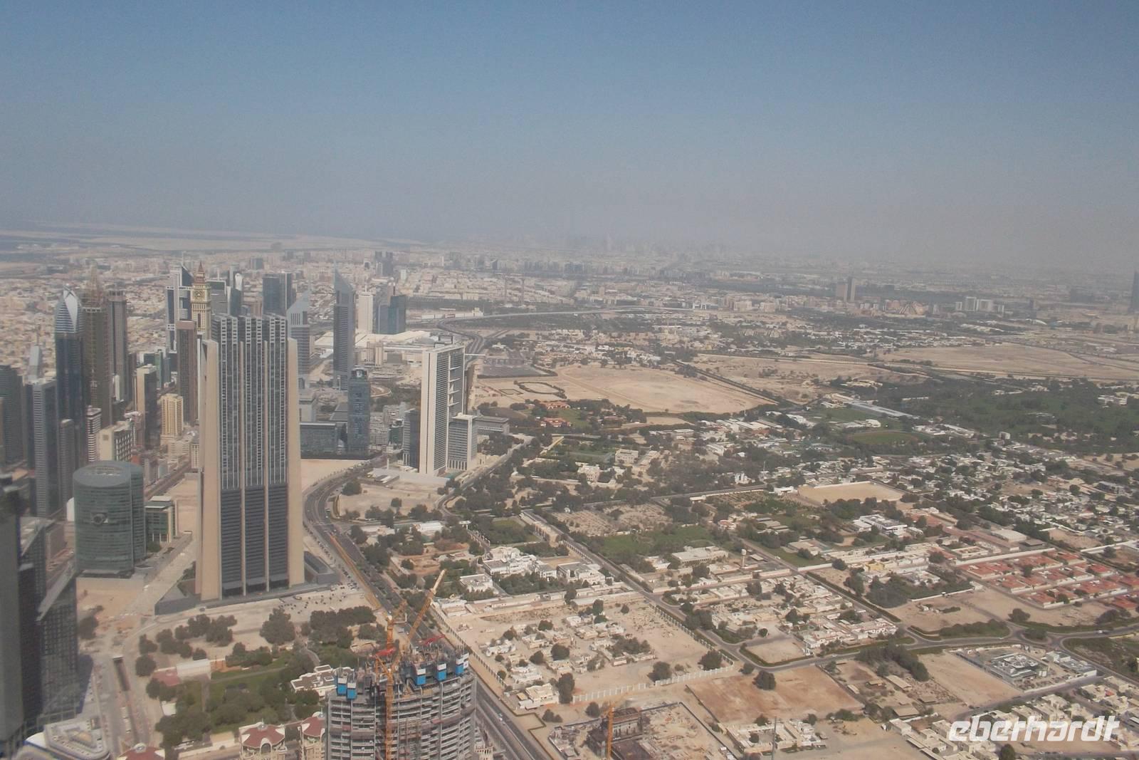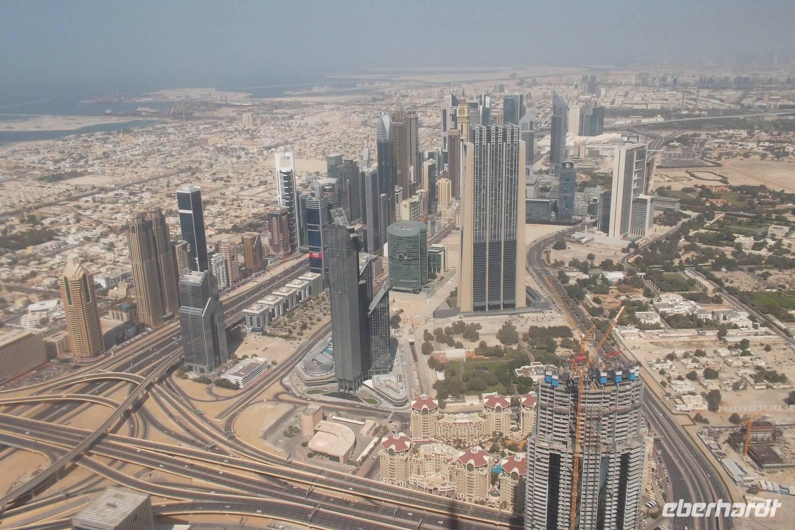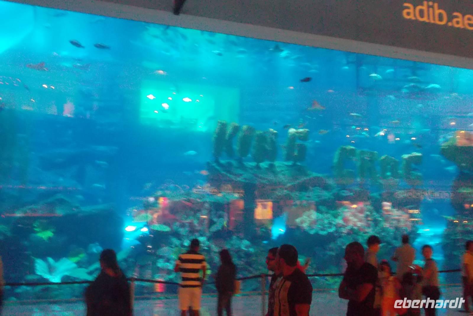 Nach einer Sicherheitskontrolle brachten uns hypermoderne Expressaufzüge mit 10 m/s Geschwindigkeit zur Aussichtsetage. Das 124. von 164 Geschossen liegt in 452 m Höhe und ermöglicht einen grandiosen Blick nicht nur über Dubai Downtown und die engere Umgebung, sondern man kann bis zum Emirat Sharjah und über den Persischen Golf blicken und von hier erkennen, dass alles umher tatsächlich buchstäblich aus der Wüste gestampft worden ist. Wir hatten viel Zeit für einen ausgiebigen Rundblick, bevor wir zur nächsten Attraktion weitergingen: mitten in der Dubai Mall befindet sich ein grandios ausgestattetes riesiges Aquarium, das den Guinness Weltrekord für die größte Acrylglas-Scheibe hält. Hier leben - hinter einer 70 cm dicken durchsichtigen Wandung - etwa 33.000 Meerestiere in immerhin 10.000 m³ Seewasser aus dem Persischen Golf. Rochen, Haie und jede Menge großer und kleiner bunter Fische simulieren ein Korallenriff. Das Besondere ist, dass man das knapp 33 m breite Aquarium in einem Tunnel unterqueren kann, der einen direkt in die bunte Meereswelt führt.