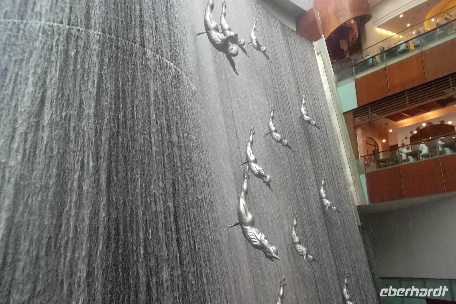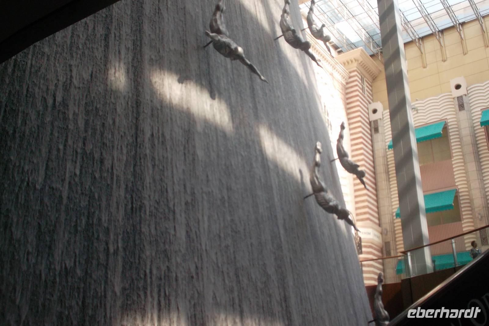 Nach dem „Erlebnis Unterwasserwelt" - das wir ganz ohne nass zu werden hatten - gingen wir weiter zur nächsten Attraktion. Ein 24 m hoher, mehretagiger Wasserfall bildet einen Mittelpunkt in der Geschäftigkeit der Mall.
