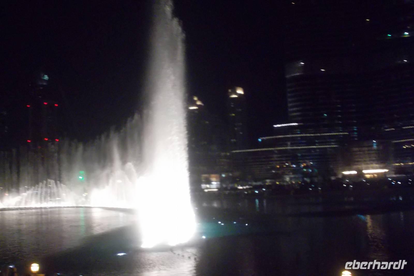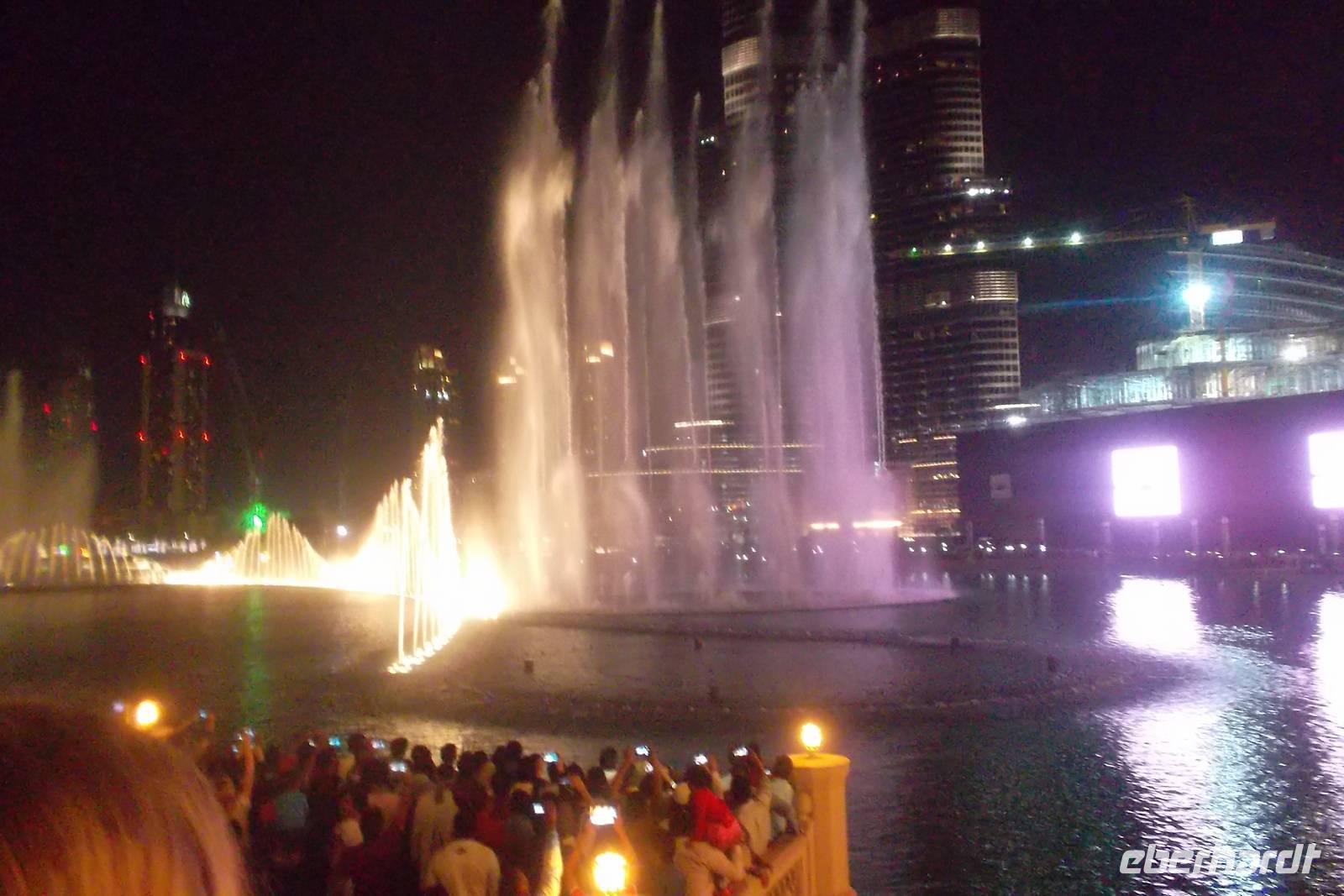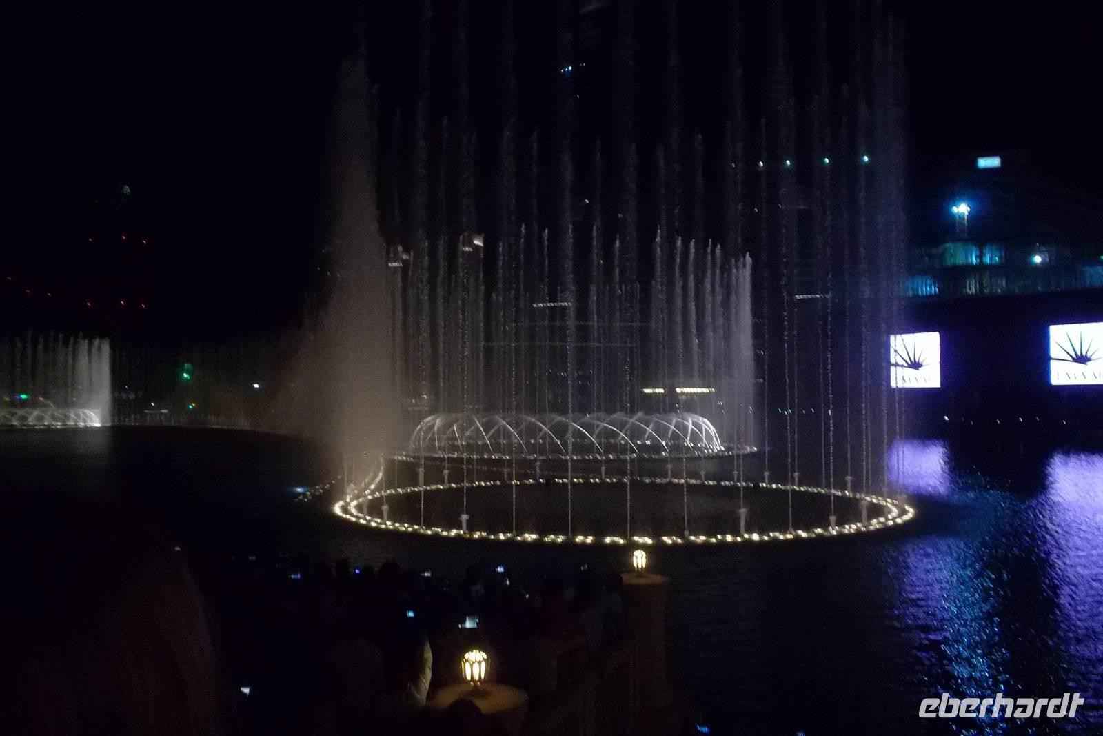 Nicht weit entfernt ist in der Außenanlage eine sehr schöne Wasserlandschaft zu sehen, überquert von einer Verbindungsbrücke zur „kleinen Mall". Die Brücke wird abends zum beliebten Treffpunkt und ist mit Menschen übersät, denn im 30-Minuten-Abstand gibt es eine mit Musik untermalte Licht-Wasser-Show, in der beleuchtete Düsen symmetrische Wasserfontänen rhythmisch zur Musik bis 30 m hoch in den Himmel türmen.