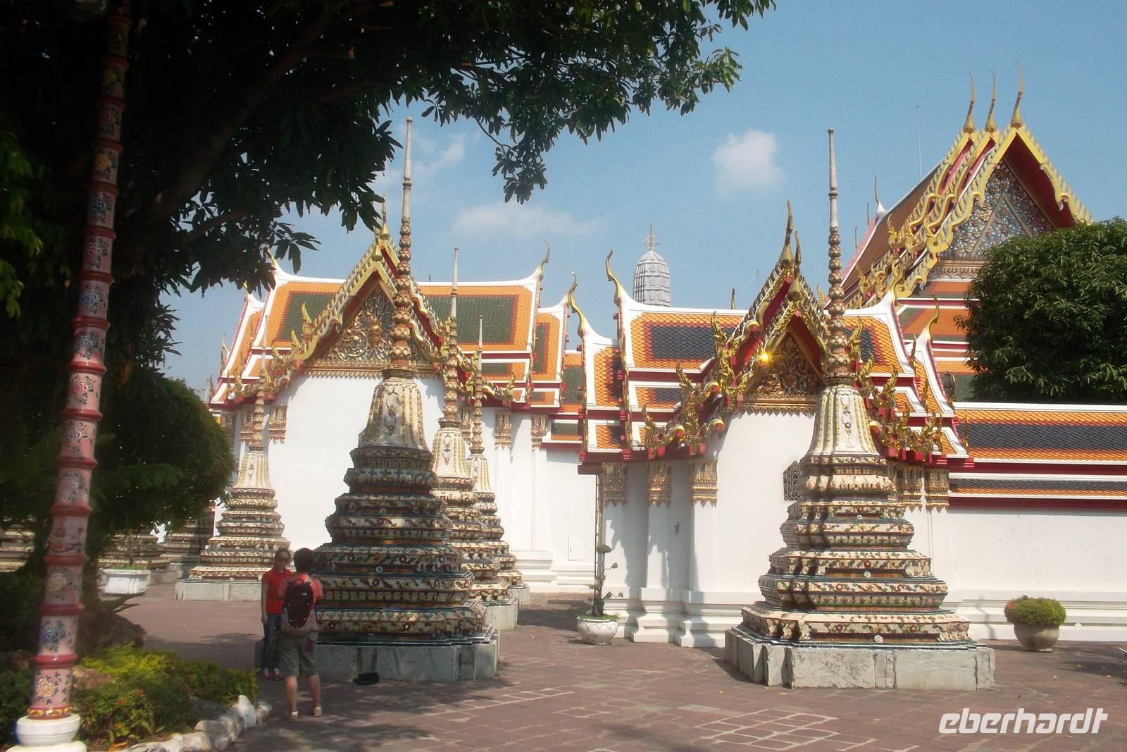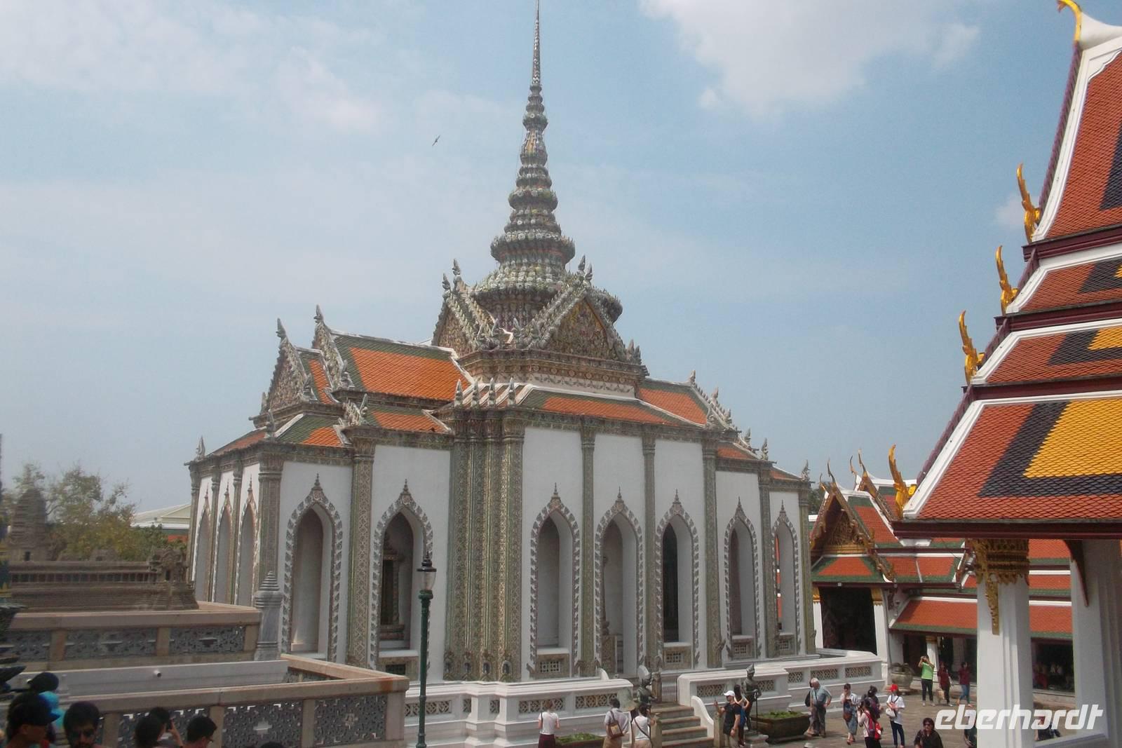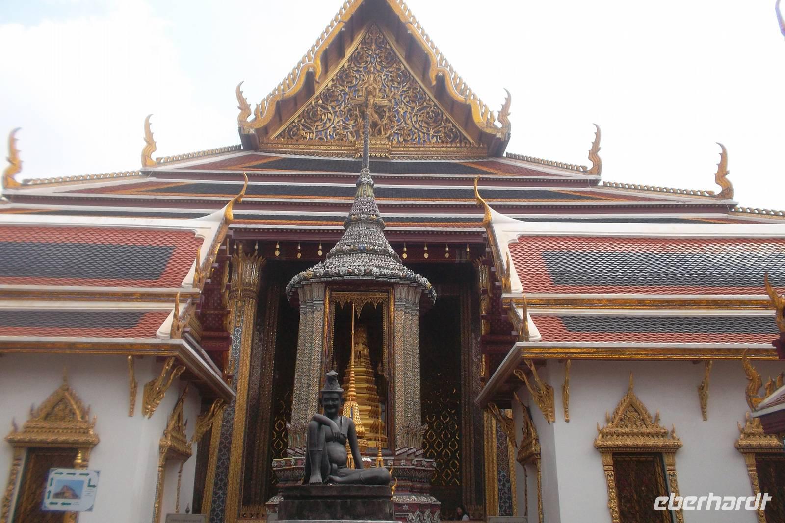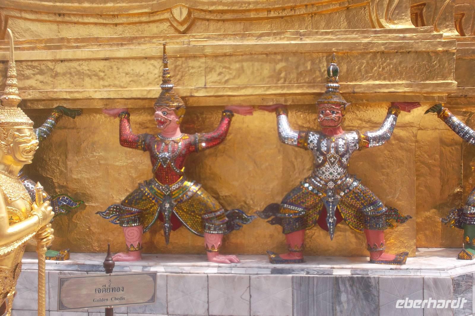 Neben dem hohen, von einem Stupa im Thai Stil gekrönten Tempel Wat Phra Keo mit der in Thailand meist verehrten kleinen Statue des Smaragd-Buddha fällt vor allem der Phra Sri Rattana Chedi ins Auge - ein komplett vergoldeter Stupa (die man hier Chedi nennt) in anderem Stil als die anderen Gebäude. Stupa - das ist übrigens die Bezeichnung für die glockenförmigen Tempel, die in Asien in den Gebieten buddhistischer oder Lamaistischer Religion zu finden sind. Reichverziert geben die Tempel überall die Welt der Götter und Dämonen, vor allem aber der Figuren des überall in Asien verbreiteten indischen Heldenepos „Ramayana" wieder.