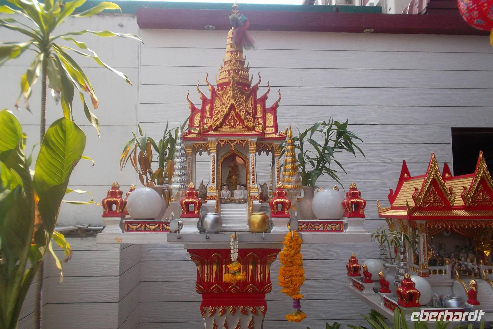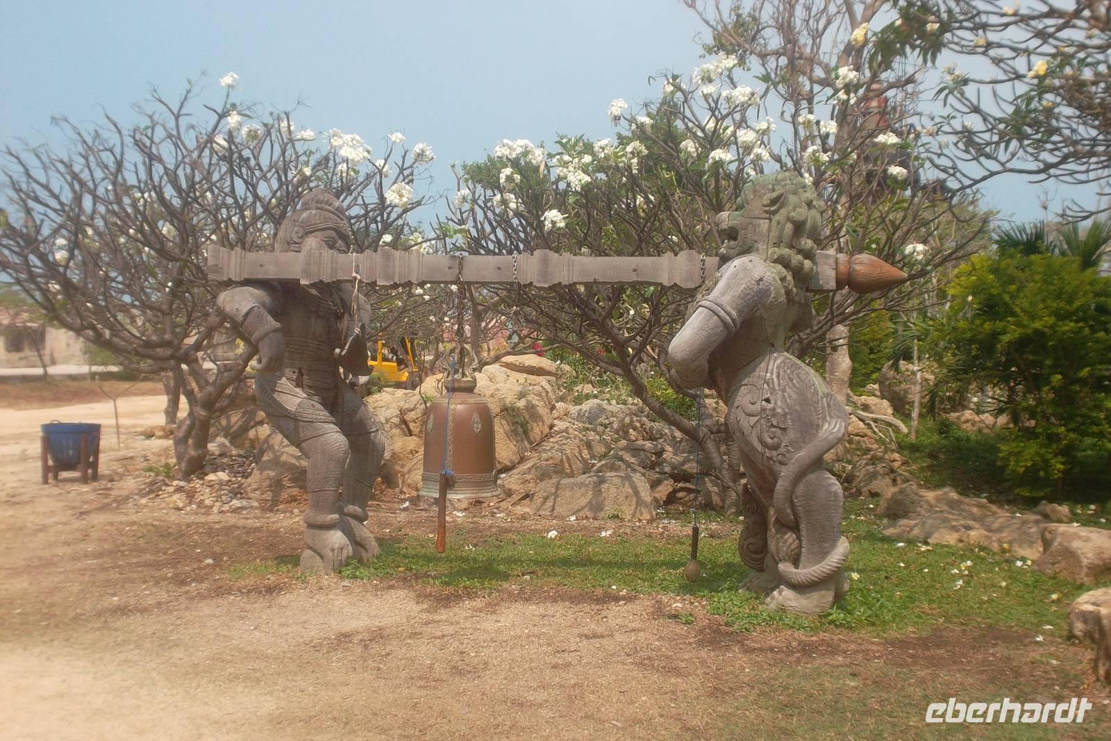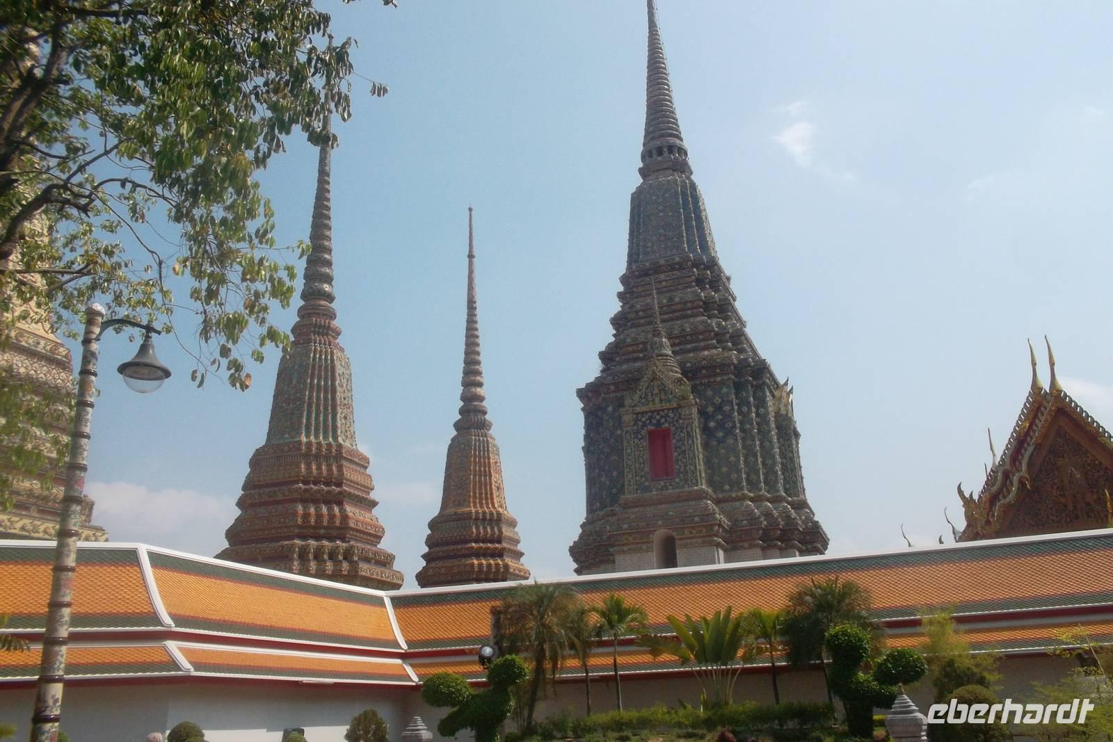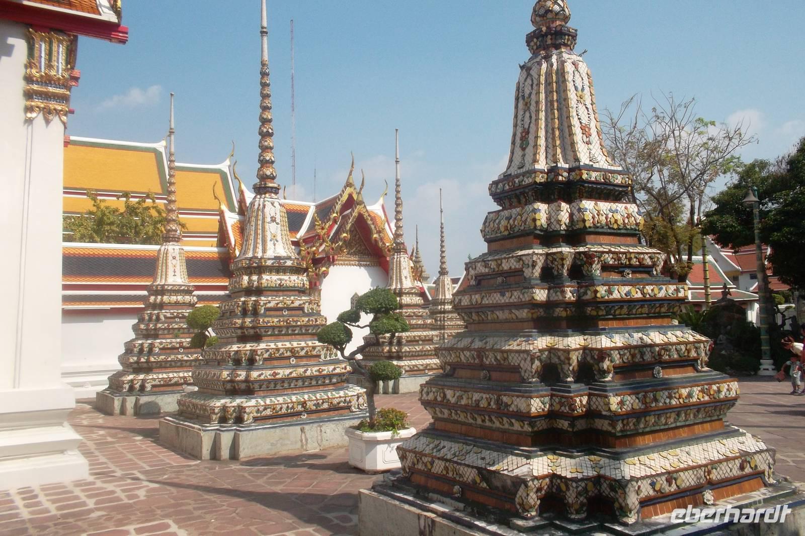 Neben dem hohen, von einem Stupa im Thai Stil gekrönten Tempel Wat Phra Keo mit der in Thailand meist verehrten kleinen Statue des Smaragd-Buddha fällt vor allem der Phra Sri Rattana Chedi ins Auge - ein komplett vergoldeter Stupa (die man hier Chedi nennt) in anderem Stil als die anderen Gebäude. Stupa - das ist übrigens die Bezeichnung für die glockenförmigen Tempel, die in Asien in den Gebieten buddhistischer oder Lamaistischer Religion zu finden sind. Reichverziert geben die Tempel überall die Welt der Götter und Dämonen, vor allem aber der Figuren des überall in Asien verbreiteten indischen Heldenepos „Ramayana" wieder.