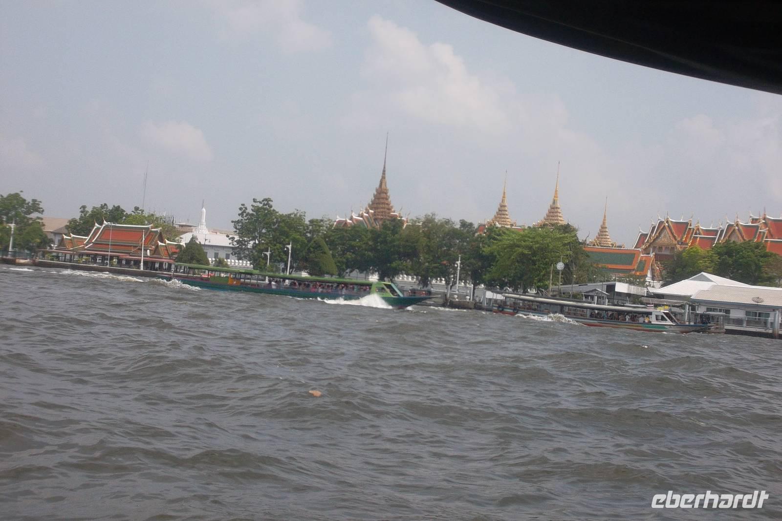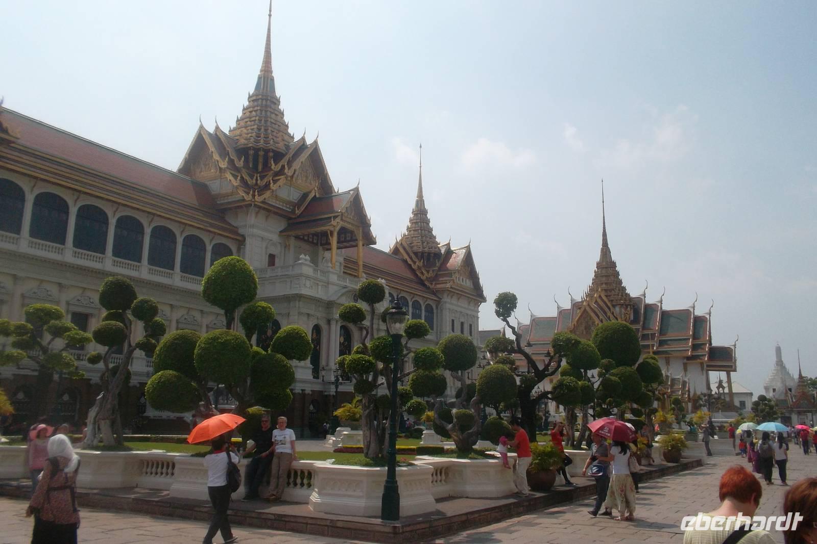 Nach der Ankunft in Bangkok füllten wir gemeinsam die Einreisekarten aus und stellten uns dem Gedränge bei der Passabfertigung. Selbst die war irgendwann vorbei und wir holten unser Gepäck und wurden am Ausgang bereits vom thailändischen Reiseleiter erwartet. Der Bus brachte uns bis zur Innenstadt - Zeit für erste Informationen. Bangkok, in Landessprache Krung Thep genannt, was so viel wie „Stadt der Engel" bedeutet, ist mit etwa 15 Millionen Einwohnern eine der großen Städte Asiens und seit 1782 Hauptstadt Thailands, das früher Siam genannt wurde. Wahrzeichen und wichtigste Sehenswürdigkeit hier ist der Große Königspalast mit dem dazugehörigen „Wat Phra Keo", dem Tempel des Smaragdbuddhas. Der aus über 100 Einzelgebäuden bestehende Komplex am Ufer des Stadtflusses Chao Phraya weist einen Stilmischmasch auf, wird aber von bunten und vor allem mit Gold verzierten Stupas und Staffeldächern beherrscht. Eine fast zwei Kilometer lange Mauer umschließt den Palastkomplex, in dem sich bei unserer Ankunft unglaublich viele Menschen drängten.