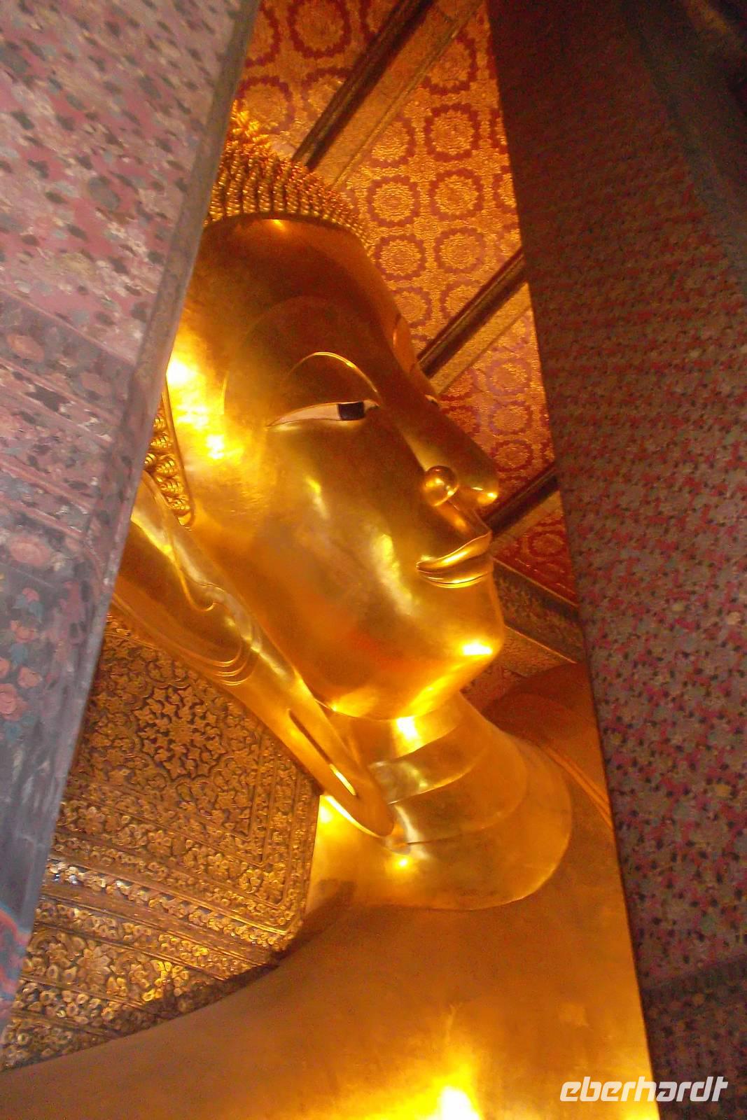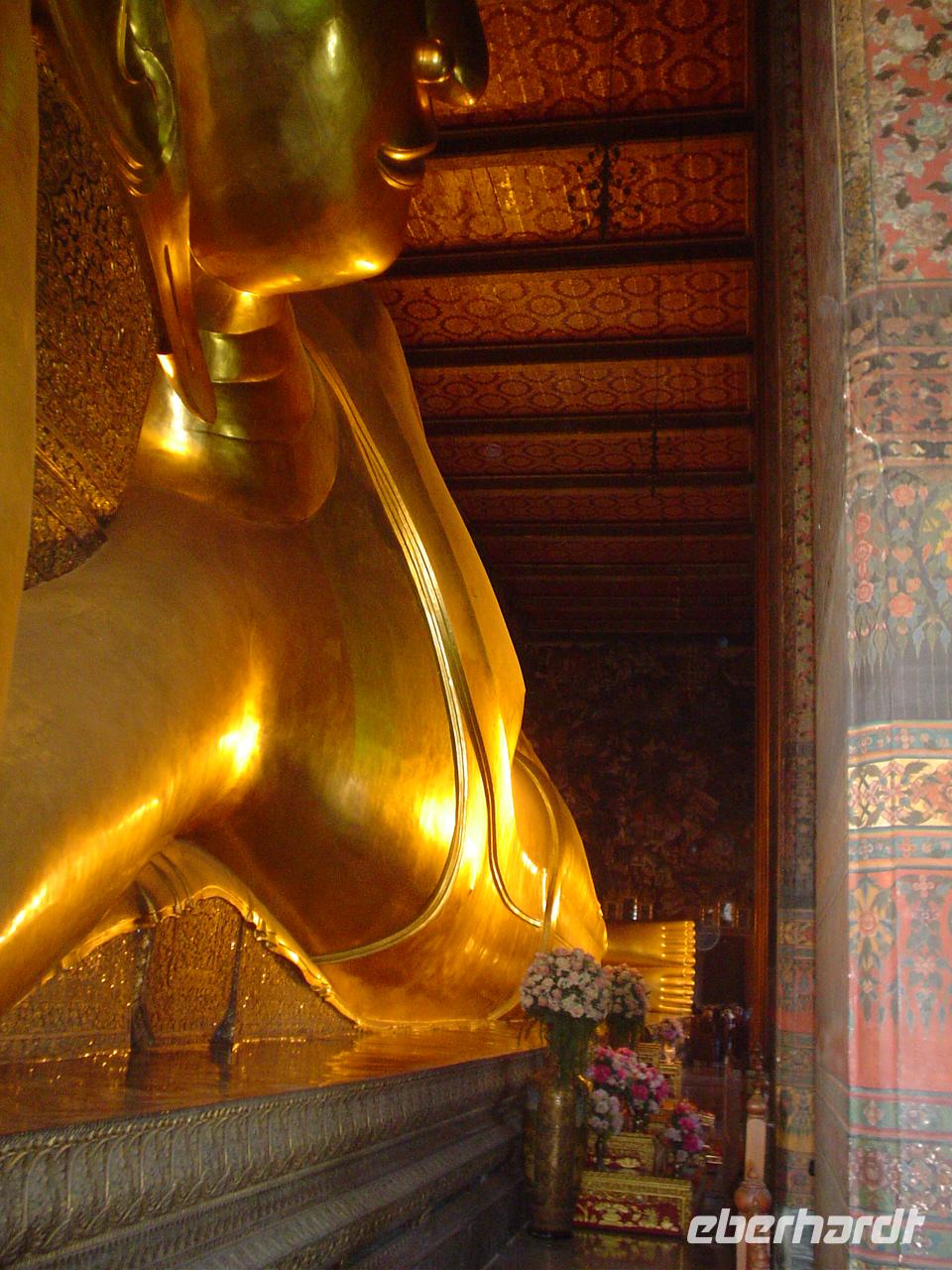 Vorbei an den Palastbauten, unter denen besonders die große Audienzhalle des Königs hervorsticht, bestiegen wir wieder unseren Bus und es ging noch zum Wat Pho. Über 400 Tempel hat Bangkok, so konnten wir natürlich nur die interessantesten besuchen. Nach dem Smaragdbuddha im Tempel neben dem Palast dürfte der zweithäufigst besuchte und wohl auch -verehrte der des liegenden Buddha sein. Im Inneren des What Pho, das man nur ohne Schuhe und in „respektvoller" Kleidung betreten darf, beeindruckt die Statue des Ruhenden, die aus Ziegelstein gemauert und dann mit Stuck, schwarzem Lack und mehreren Schichten Blattgold überzogen wurde. 46 m lang und 15 m hoch ist der große liegende Buddha - seine Fußsohlen, die er dem Besucher zuwendet - eine sonst nicht übliche Geste, sind mit Perlmuttintarsien eingelegt.