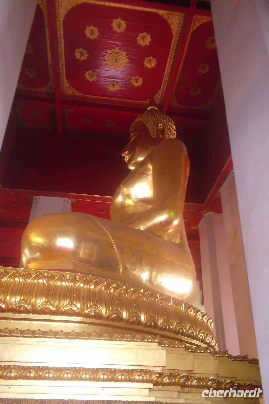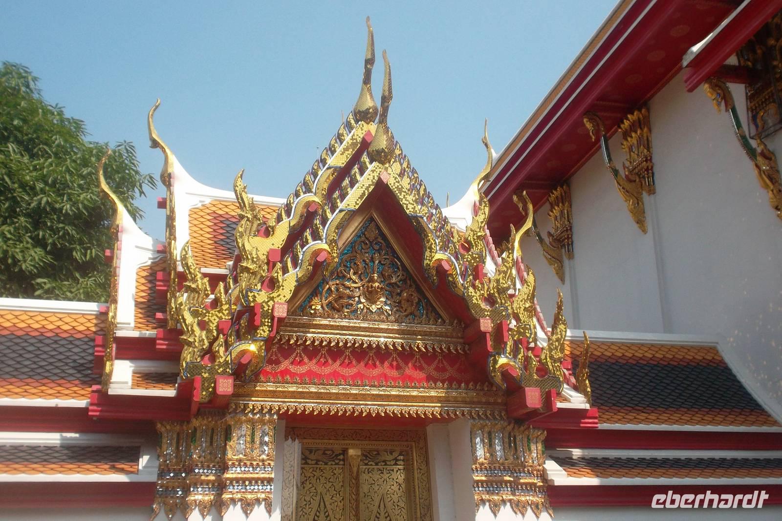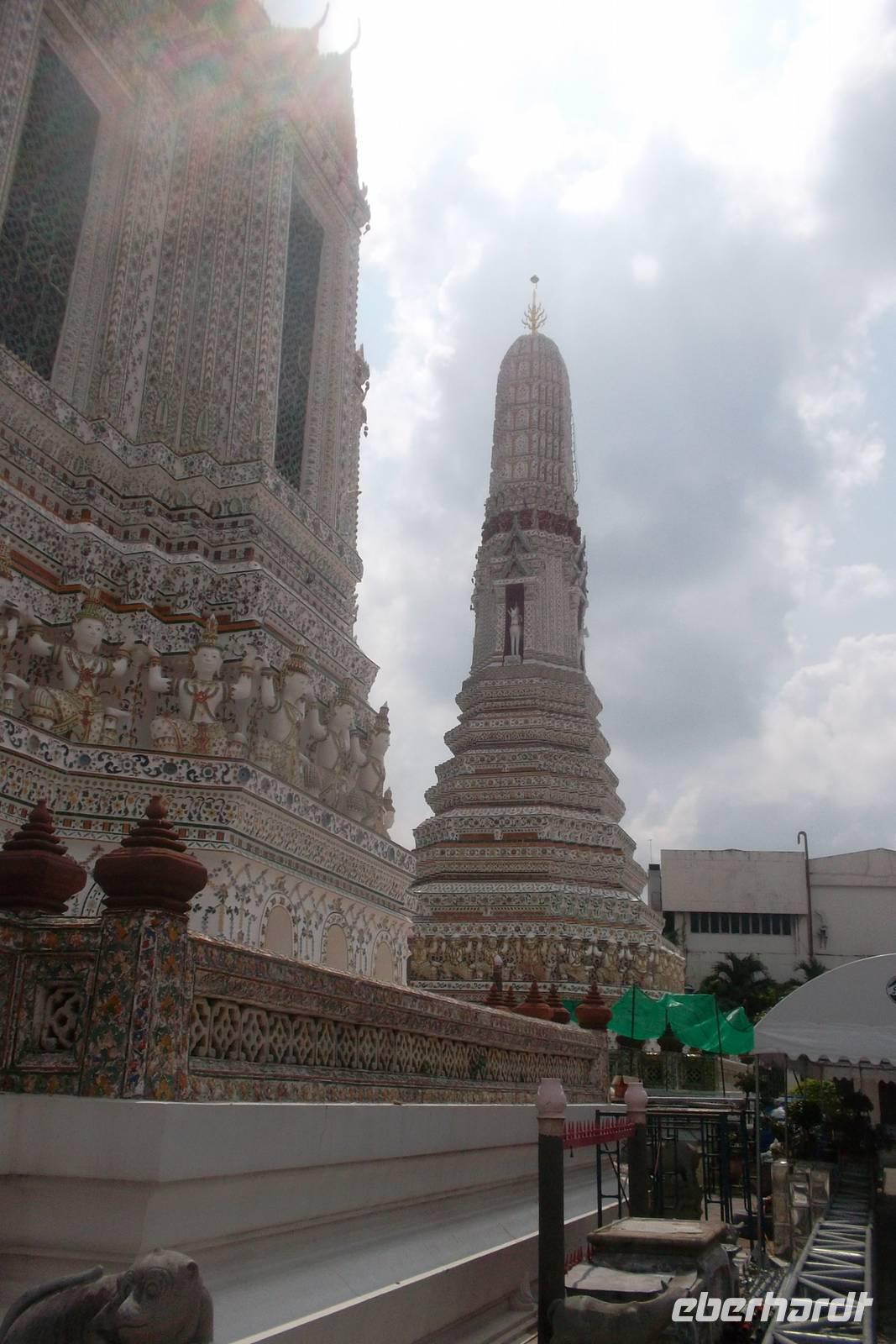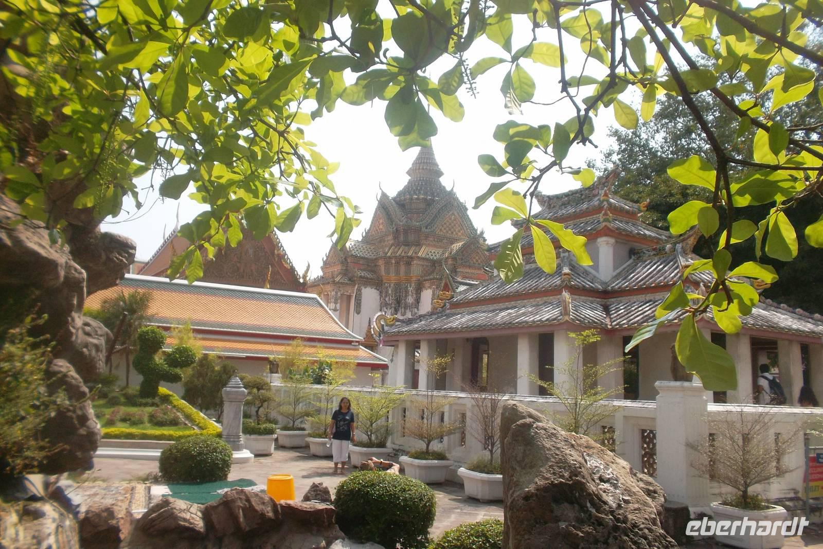 Unser erste Ziel heute war der Tempel Wat Suthat. Der wohl älteste Tempel der Stadt wurde kurz nach der Wahl Bangkoks zur neuen Hauptstadt errichtet, für eine Buddhastatue, die man aus den Ruinen der einstigen siamesischen Hauptstadt Sukhothai hierher überführt hatte. Neben seinem prunkvollen Aufbau ist er für seine Wandmalereien bekannt. Nach Verlassen des Tempels und einem kurzen Fußmarsch erreichten wir den Fähranleger und konnten übersetzen über den „Fluss der Könige" Chao Phraya zum Wat Arun. Besser bekannt als der „Porzellantempel" ist auch Wat Arun's Besichtigung ein Muss für jeden Bangkok-Besucher. Die Verzierungen der zahlreichen Chedis (Stupas), von denen ein Großteil gerade renoviert wird, sind aus Keramik, Porzellan und mitunter Spiegelscherben. Nach ausführlichem Rundgang hier, um den zentralen Phrang - eine gewaltige Stupa im Khmer-Stil - herum verließen wir den Tempel und bestiegen am Fluss ein Boot für eine sehr schöne Bootstour durch die Khlongs im Hinterland von Bangkok. Ursprünglich gab es hier, im sumpfigen Umland der Hauptstadt, kaum Straßen. Handels- und Verkehrswege waren der Fluss, seine Nebenflüsse und die zahlreichen Khlongs. An deren Ufern spielte sich das Leben ab, die Versorgung und auch die Märkte wurden auf dem Wasser - im Boot - abgehalten. Bis heute sind Thailands schwimmende Märkte eine Attraktion. Erst in der zweiten Hälfte des 20. Jh. wurden in Bangkok viele Khlongs zugeschüttet und an ihrer Stelle Straßen angelegt. Das verbesserte die Hygiene, die Infrastruktur und die Versorgung, veränderte aber die Lebensweise. Heute findet man auch an den Khlongs nur noch vereinzelt die Bilder des alten Lebens - dennoch war unsere Bootsfahrt ein guter Blick hinter die Kulissen, der nicht jedem Touristen zu Teil wird. Nach einem guten Mittagessen in einem Restaurant am Fluss mit einem leckeren Thai-Buffet führte unser Reiseleiter Jedtapat uns auf einem Schlängelweg zum Spaziergang durch Chinatown. Zwar war es höchst interessant, exotische Früchte und Gerichte, brodelnde Suppenküchen und Exotisches aller Art zu sehen, aber der zum Teil extrem schmale Weg durch Hitze und Gedränge wurde rasch anstrengend. So kehrten wir nicht allzu spät ins Hotel zurück, brachen aber nochmals auf, um im höchstgelegen Restaurant Bangkoks zu Abend zu essen. Direkt unter der Aussichtsplattform des 308 m hohen Baiyoke Tower liegt ein Selbstbedienungsrestaurant mit Stil und einem außergewöhnlich reichhaltigen Buffet. So konnten wir es uns mit Blick auf das Lichtermeer von Bangkok bei internationalen und einheimischen sowie chinesischen Gerichten gut gehen lassen.