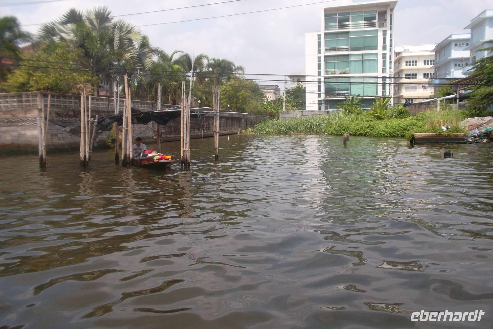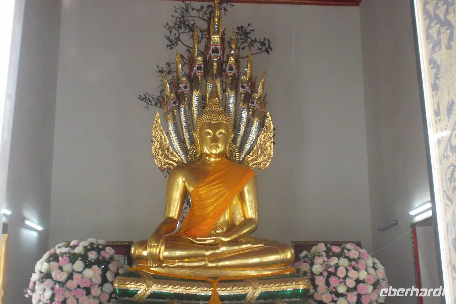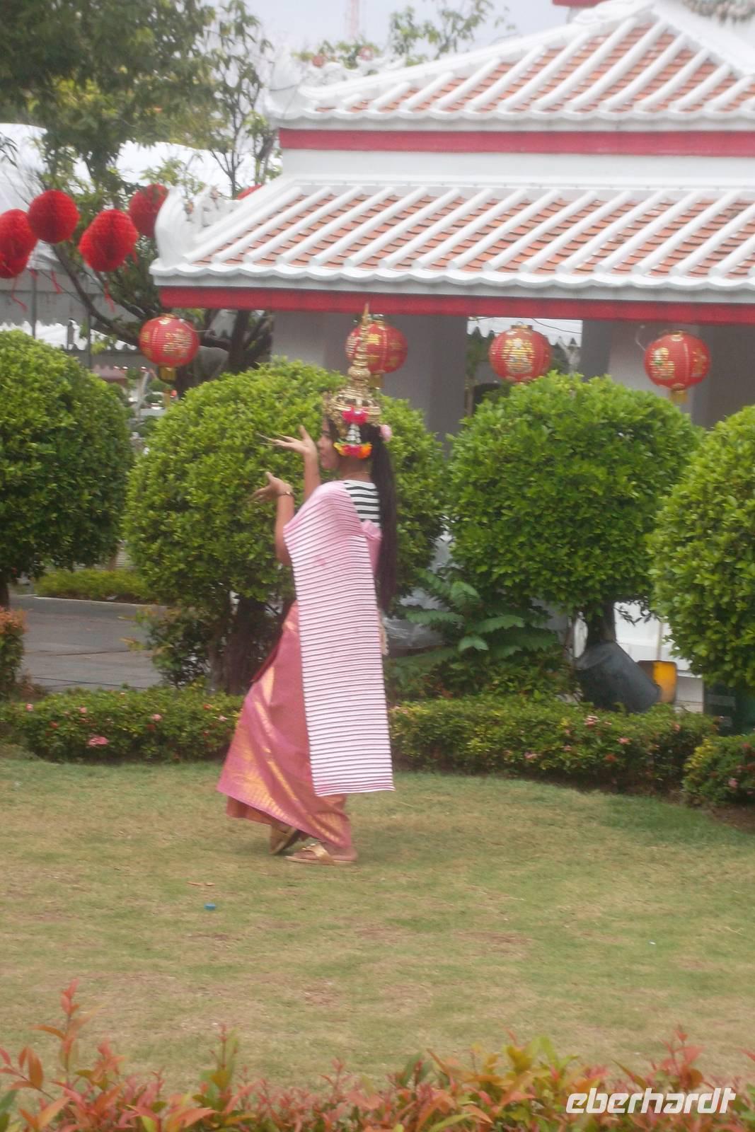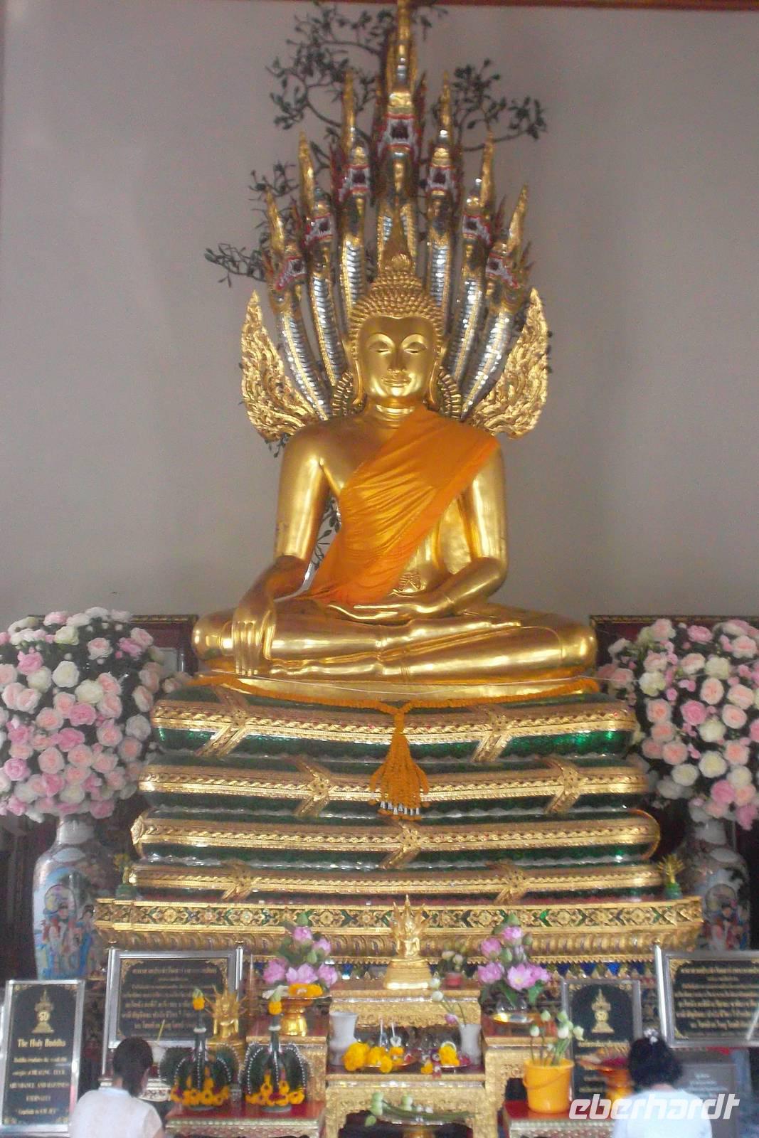 Unser erste Ziel heute war der Tempel Wat Suthat. Der wohl älteste Tempel der Stadt wurde kurz nach der Wahl Bangkoks zur neuen Hauptstadt errichtet, für eine Buddhastatue, die man aus den Ruinen der einstigen siamesischen Hauptstadt Sukhothai hierher überführt hatte. Neben seinem prunkvollen Aufbau ist er für seine Wandmalereien bekannt. Nach Verlassen des Tempels und einem kurzen Fußmarsch erreichten wir den Fähranleger und konnten übersetzen über den „Fluss der Könige" Chao Phraya zum Wat Arun. Besser bekannt als der „Porzellantempel" ist auch Wat Arun's Besichtigung ein Muss für jeden Bangkok-Besucher. Die Verzierungen der zahlreichen Chedis (Stupas), von denen ein Großteil gerade renoviert wird, sind aus Keramik, Porzellan und mitunter Spiegelscherben. Nach ausführlichem Rundgang hier, um den zentralen Phrang - eine gewaltige Stupa im Khmer-Stil - herum verließen wir den Tempel und bestiegen am Fluss ein Boot für eine sehr schöne Bootstour durch die Khlongs im Hinterland von Bangkok. Ursprünglich gab es hier, im sumpfigen Umland der Hauptstadt, kaum Straßen. Handels- und Verkehrswege waren der Fluss, seine Nebenflüsse und die zahlreichen Khlongs. An deren Ufern spielte sich das Leben ab, die Versorgung und auch die Märkte wurden auf dem Wasser - im Boot - abgehalten. Bis heute sind Thailands schwimmende Märkte eine Attraktion. Erst in der zweiten Hälfte des 20. Jh. wurden in Bangkok viele Khlongs zugeschüttet und an ihrer Stelle Straßen angelegt. Das verbesserte die Hygiene, die Infrastruktur und die Versorgung, veränderte aber die Lebensweise. Heute findet man auch an den Khlongs nur noch vereinzelt die Bilder des alten Lebens - dennoch war unsere Bootsfahrt ein guter Blick hinter die Kulissen, der nicht jedem Touristen zu Teil wird. Nach einem guten Mittagessen in einem Restaurant am Fluss mit einem leckeren Thai-Buffet führte unser Reiseleiter Jedtapat uns auf einem Schlängelweg zum Spaziergang durch Chinatown. Zwar war es höchst interessant, exotische Früchte und Gerichte, brodelnde Suppenküchen und Exotisches aller Art zu sehen, aber der zum Teil extrem schmale Weg durch Hitze und Gedränge wurde rasch anstrengend. So kehrten wir nicht allzu spät ins Hotel zurück, brachen aber nochmals auf, um im höchstgelegen Restaurant Bangkoks zu Abend zu essen. Direkt unter der Aussichtsplattform des 308 m hohen Baiyoke Tower liegt ein Selbstbedienungsrestaurant mit Stil und einem außergewöhnlich reichhaltigen Buffet. So konnten wir es uns mit Blick auf das Lichtermeer von Bangkok bei internationalen und einheimischen sowie chinesischen Gerichten gut gehen lassen.