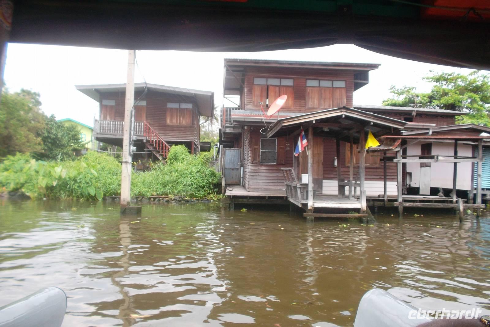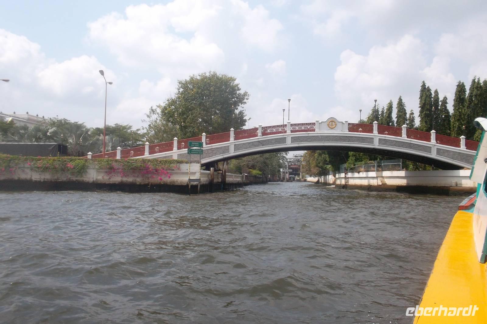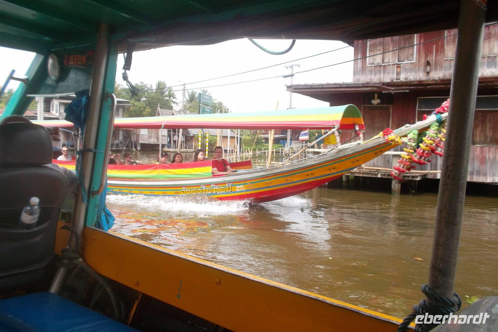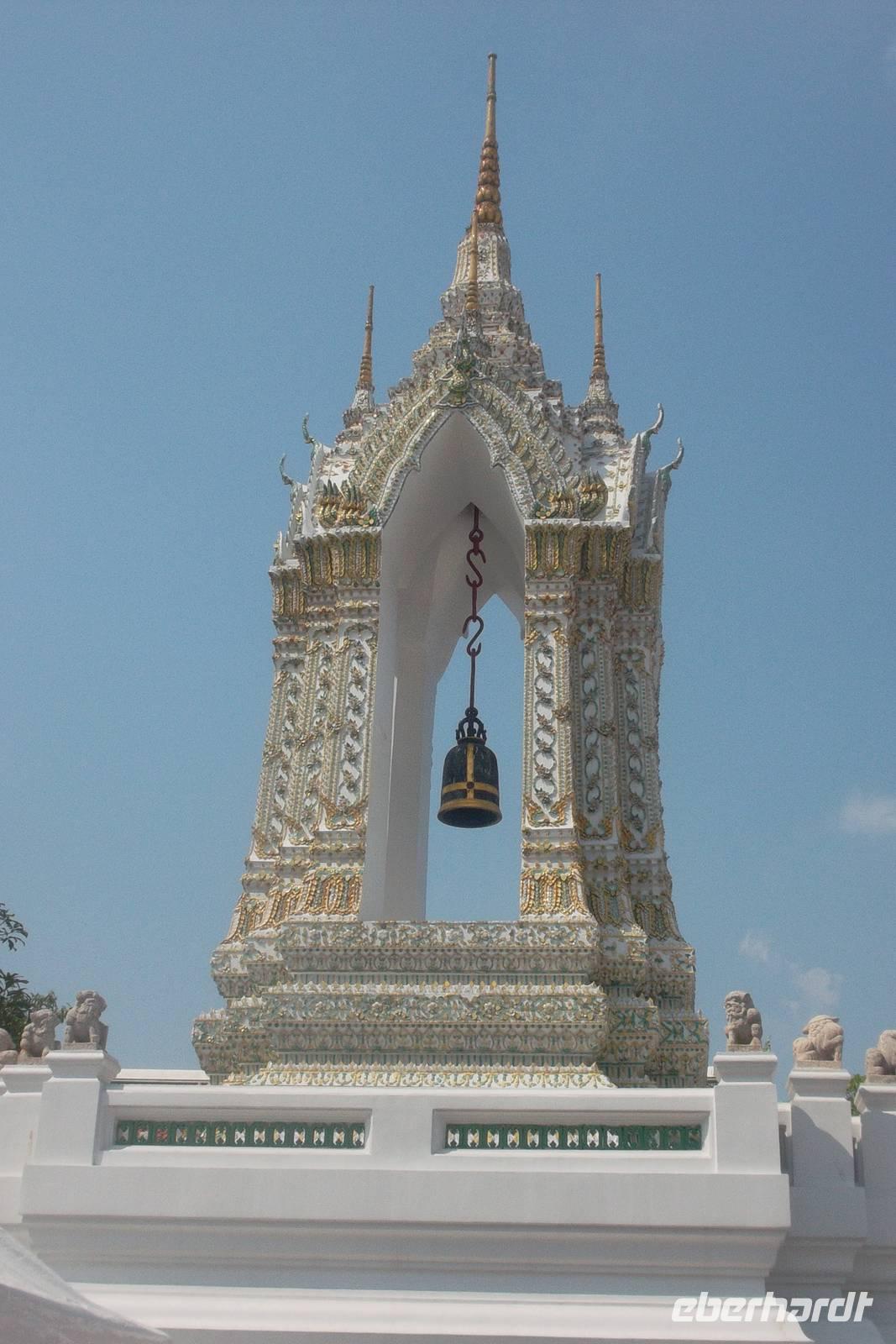 Unser erste Ziel heute war der Tempel Wat Suthat. Der wohl älteste Tempel der Stadt wurde kurz nach der Wahl Bangkoks zur neuen Hauptstadt errichtet, für eine Buddhastatue, die man aus den Ruinen der einstigen siamesischen Hauptstadt Sukhothai hierher überführt hatte. Neben seinem prunkvollen Aufbau ist er für seine Wandmalereien bekannt. Nach Verlassen des Tempels und einem kurzen Fußmarsch erreichten wir den Fähranleger und konnten übersetzen über den „Fluss der Könige" Chao Phraya zum Wat Arun. Besser bekannt als der „Porzellantempel" ist auch Wat Arun's Besichtigung ein Muss für jeden Bangkok-Besucher. Die Verzierungen der zahlreichen Chedis (Stupas), von denen ein Großteil gerade renoviert wird, sind aus Keramik, Porzellan und mitunter Spiegelscherben. Nach ausführlichem Rundgang hier, um den zentralen Phrang - eine gewaltige Stupa im Khmer-Stil - herum verließen wir den Tempel und bestiegen am Fluss ein Boot für eine sehr schöne Bootstour durch die Khlongs im Hinterland von Bangkok. Ursprünglich gab es hier, im sumpfigen Umland der Hauptstadt, kaum Straßen. Handels- und Verkehrswege waren der Fluss, seine Nebenflüsse und die zahlreichen Khlongs. An deren Ufern spielte sich das Leben ab, die Versorgung und auch die Märkte wurden auf dem Wasser - im Boot - abgehalten. Bis heute sind Thailands schwimmende Märkte eine Attraktion. Erst in der zweiten Hälfte des 20. Jh. wurden in Bangkok viele Khlongs zugeschüttet und an ihrer Stelle Straßen angelegt. Das verbesserte die Hygiene, die Infrastruktur und die Versorgung, veränderte aber die Lebensweise. Heute findet man auch an den Khlongs nur noch vereinzelt die Bilder des alten Lebens - dennoch war unsere Bootsfahrt ein guter Blick hinter die Kulissen, der nicht jedem Touristen zu Teil wird. Nach einem guten Mittagessen in einem Restaurant am Fluss mit einem leckeren Thai-Buffet führte unser Reiseleiter Jedtapat uns auf einem Schlängelweg zum Spaziergang durch Chinatown. Zwar war es höchst interessant, exotische Früchte und Gerichte, brodelnde Suppenküchen und Exotisches aller Art zu sehen, aber der zum Teil extrem schmale Weg durch Hitze und Gedränge wurde rasch anstrengend. So kehrten wir nicht allzu spät ins Hotel zurück, brachen aber nochmals auf, um im höchstgelegen Restaurant Bangkoks zu Abend zu essen. Direkt unter der Aussichtsplattform des 308 m hohen Baiyoke Tower liegt ein Selbstbedienungsrestaurant mit Stil und einem außergewöhnlich reichhaltigen Buffet. So konnten wir es uns mit Blick auf das Lichtermeer von Bangkok bei internationalen und einheimischen sowie chinesischen Gerichten gut gehen lassen.