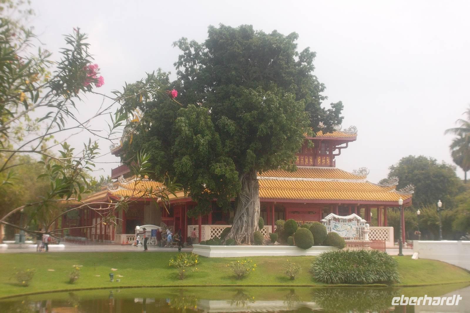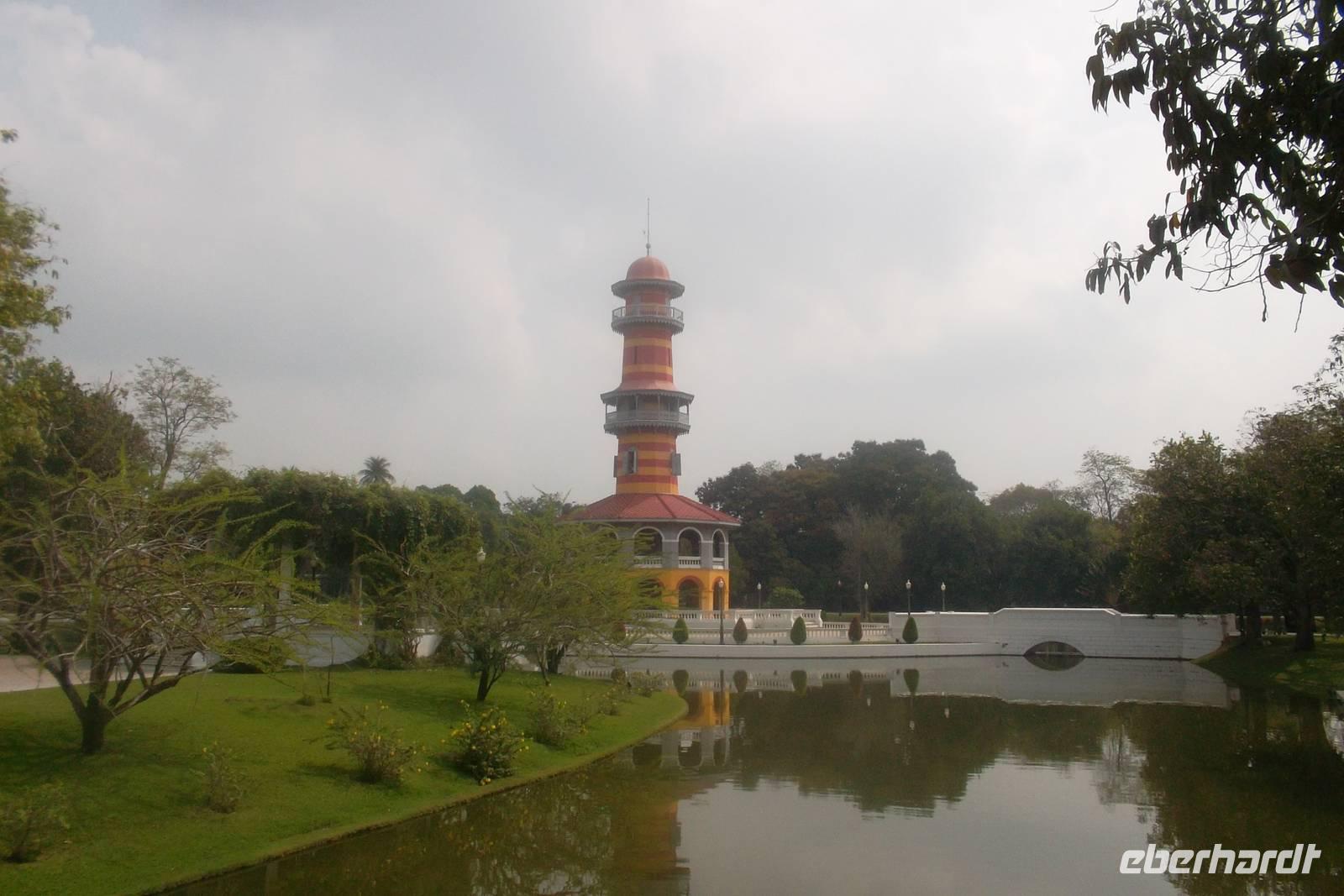 Ein neuer Reiseleiter, Herr Choomporn, begrüßte uns heute. Während der Busfahrt erzählte er uns einige Episoden aus der Geschichte Thailands. Als erstes besuchten wir heute den herrlich angelegten Sommerpalast der Thai Könige in Bang Pa-In. Im 17. Jh. wurde der Palastkomplex auf einer Flussinsel errichtet und seither von allen Königen Siams genutzt. Besonders beliebt war er bei Rama V., bekannt auch als König Chulalongkorn und noch bis heute wird die Anlage bei Staatsempfängen genutzt. Im Zentrum steht die Kopie eines verschachtelten vergoldeten Tempels mit vielen Dächern, die vollständig auf Pfählen im Wasser steht. Daneben gibt es zahlreiche kleinere Gebäude und Attraktionen, wie einen Leuchttur im asiatischen Stil, einen chinesischen Pavillion, den chinesische Händler dem König als Zeichen ihrer Dankbarkeit für seinen Schutz und seine Gunst geschenkt haben und der im europäischen Stil eingerichtete heutige Sommerpalast, der wohl auf den europafreundlichen Rama V. und den Anfang des 20. Jh. zurückgeht.